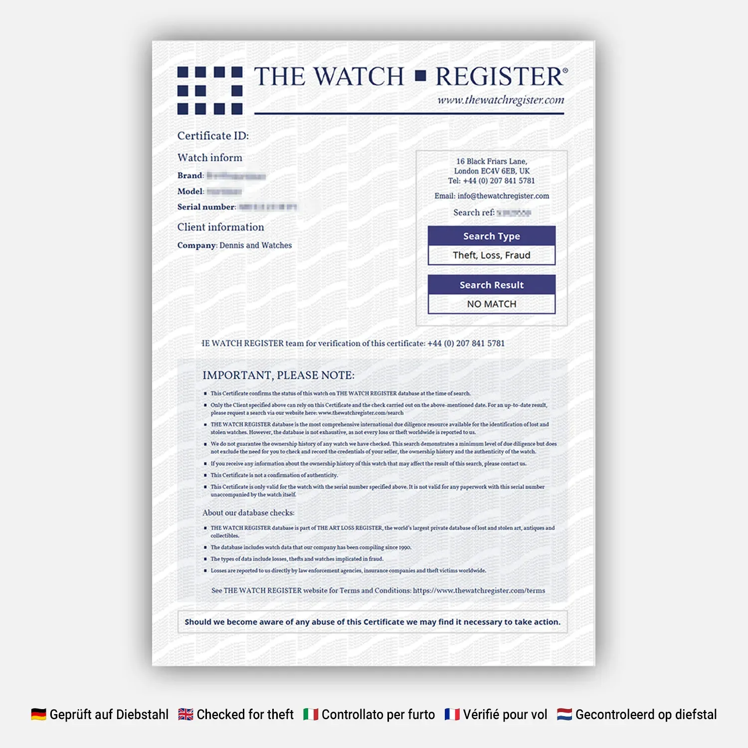 - Furto: Controllato a livello mondiale | Nessuna segnalazione