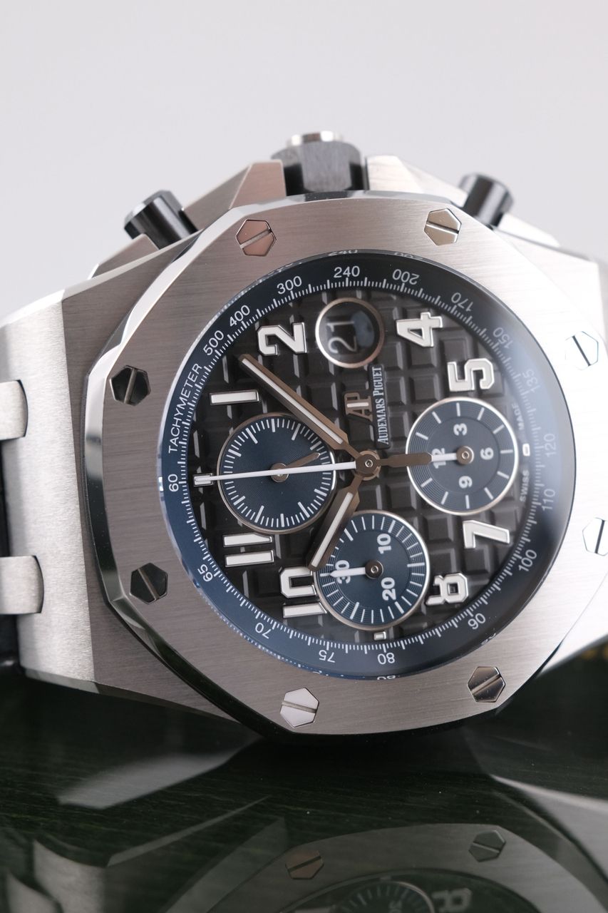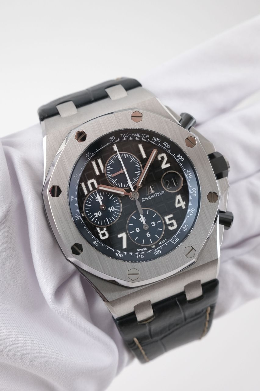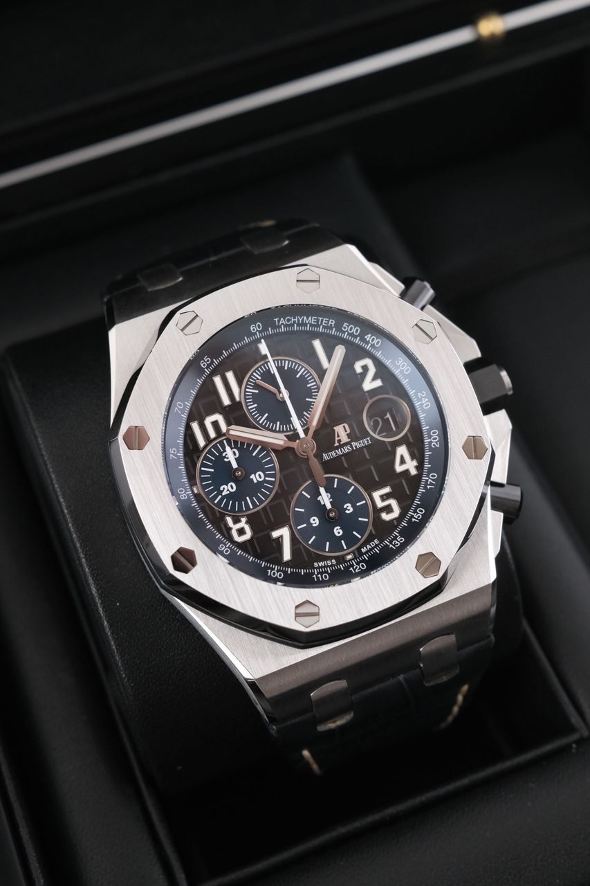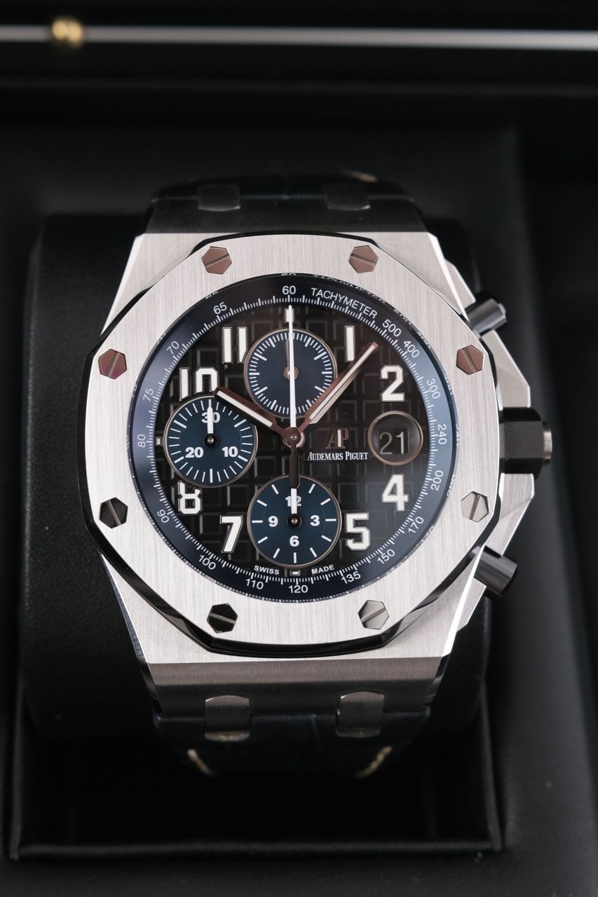 **Watch Description**Ready for your new dream watch? Perhaps this beautiful Audemars Piguet Royal Oak Offshore Chronograph made of Steel will soon be on your wrist. Whether vintage or modern - with over 200 watches in stock, we always have your new luxury watch available for you immediately - whether you are a first-time buyer or your watch collection needs a new addition.