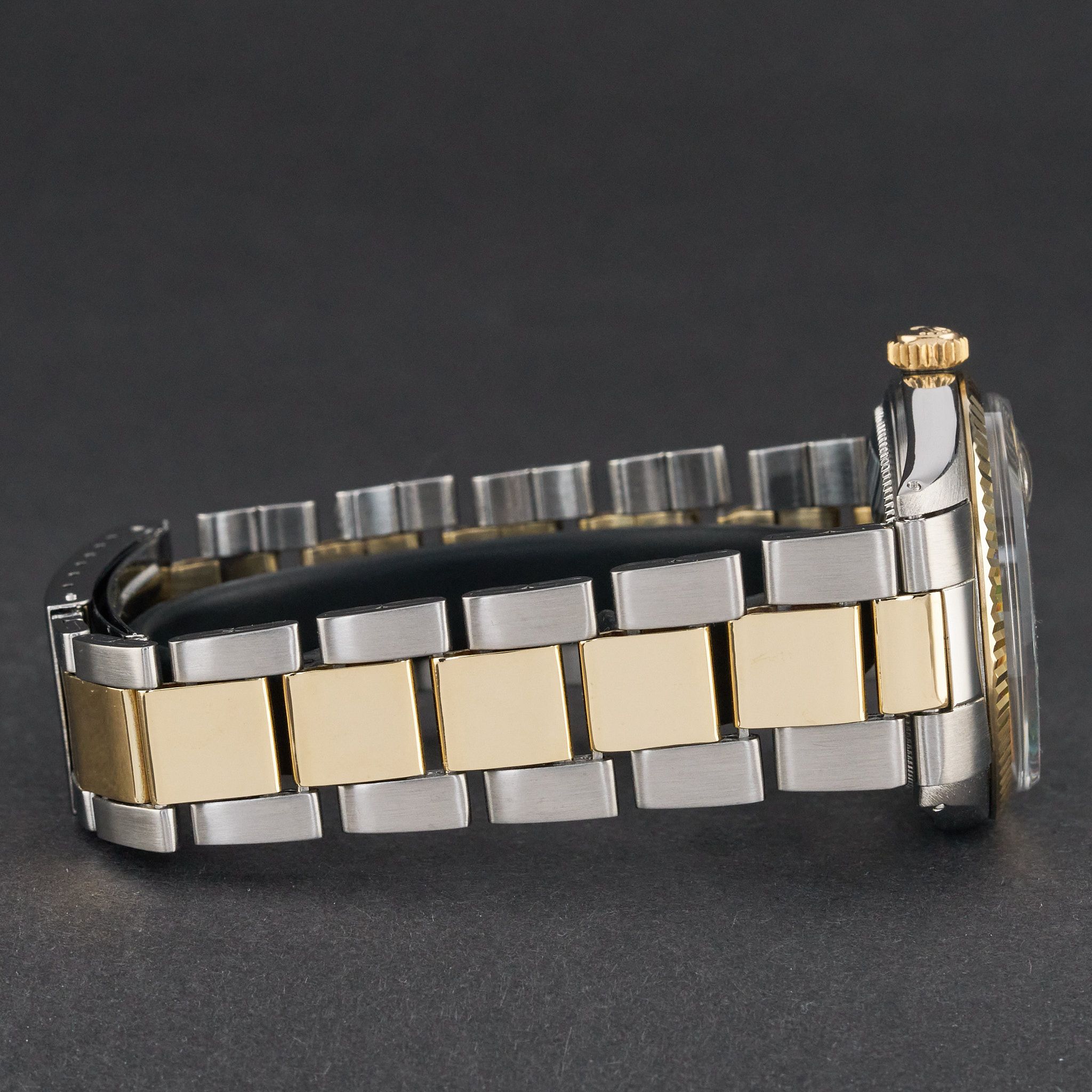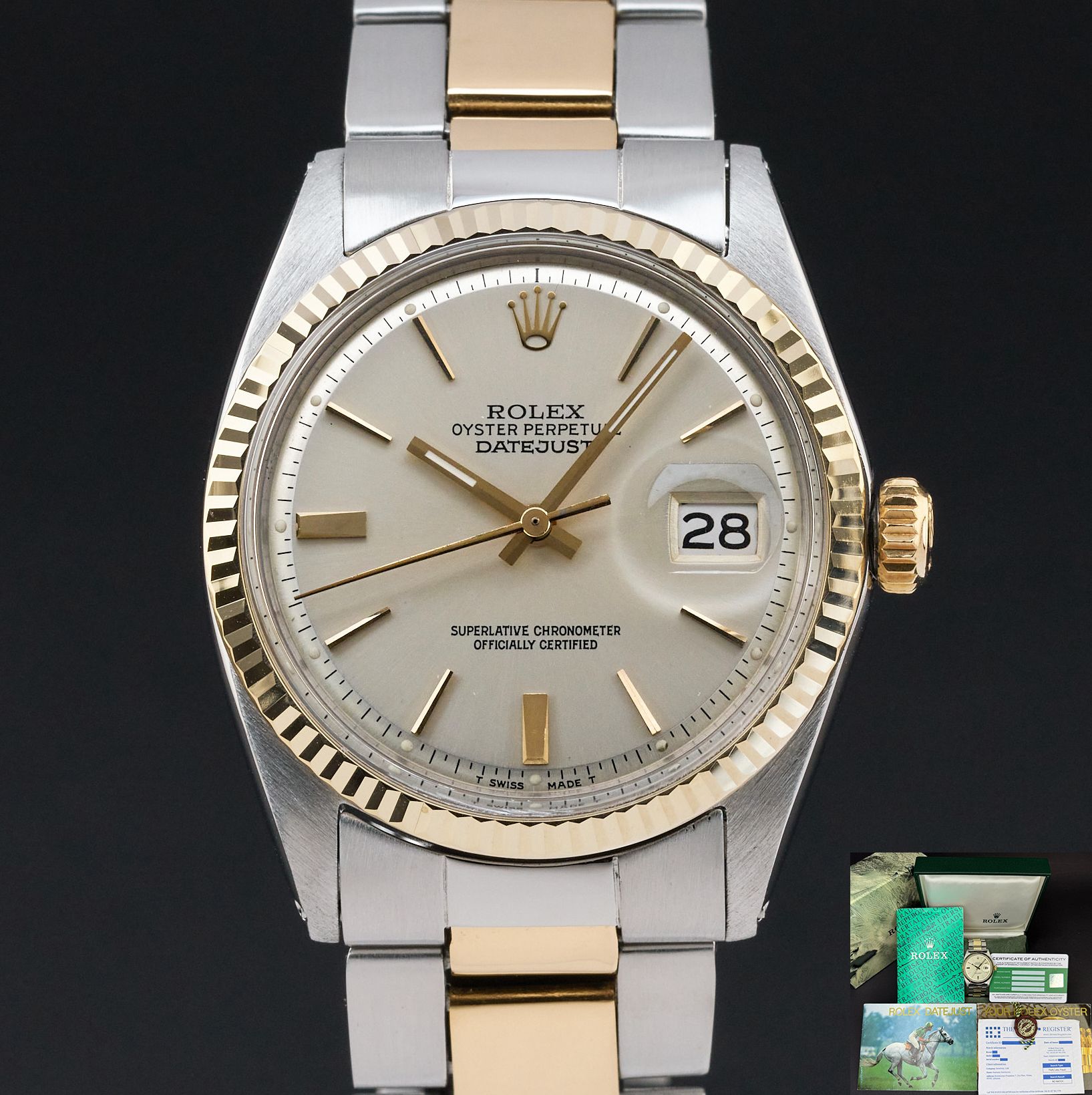 This Rolex Datejust 1601 features a Silver dial and is crafted from 18K yellow gold and stainless steel, with a production year of 1971.Case No: 262XXXX