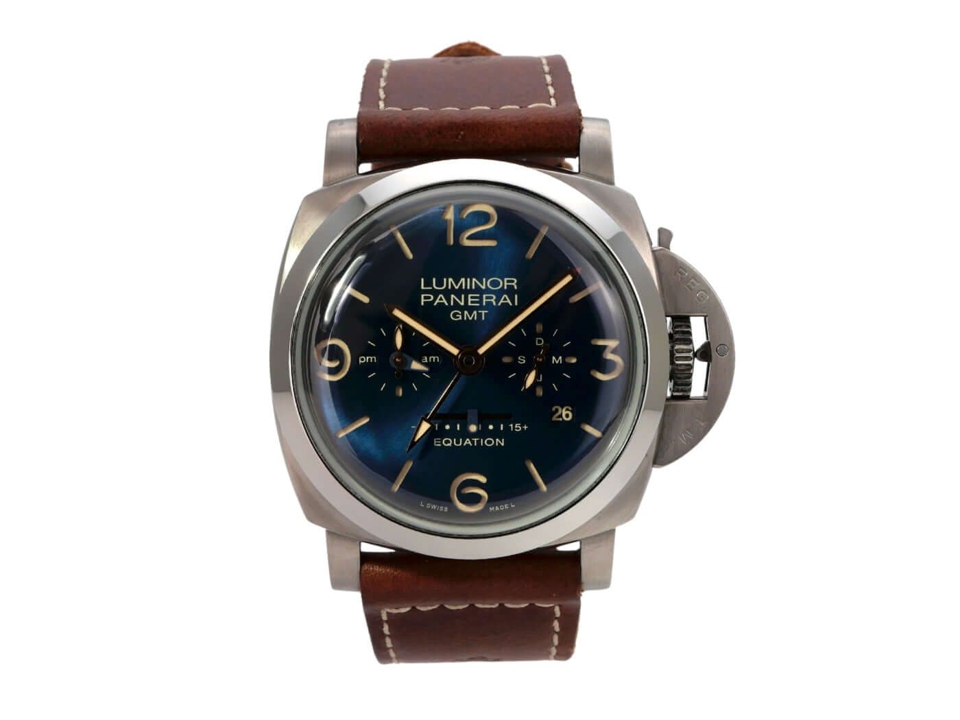 Panerai Luminor 1950 Equation of Time 8 Days GMT Titanium Ref. PAM00670Case made of satin-finished titanium, case diameter 44 mm, polished titanium bezel, brown leather strap with titanium pin buckle, blue dial with luminous Arabic numerals and luminous markers, mechanical hand-wound movement, Panerai caliber P.2002/E with 31 jewels, frequency 28,800 vibrations per hour, power reserve of 8 days, small seconds display, equation of time, power reserve indicator on the case back, date, month, second time zone, titanium case back with transparent sapphire crystal, anti-reflective sapphire crystal, water-resistant up to 10 bar.