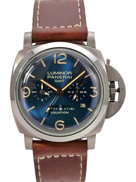 Cassa in titanio satinato, diametro della cassa 44 mm, lunetta in titanio lucido, cinturino in pelle marrone con fibbia ad ardiglione in titanio, quadrante blu con numeri arabi luminescenti e indici luminescenti, movimento meccanico a carica manuale, calibro Panerai P.2002/E con 31 rubini, frequenza di 28.800 vibrazioni all'ora, riserva di carica di 8 giorni, display dei piccoli secondi, equazione del tempo, indicatore della riserva di carica sul fondello, data, mese, secondo fuso orario, fondello in titanio con cristallo zaffiro trasparente, cristallo zaffiro antiriflesso, impermeabile fino a 10 bar.