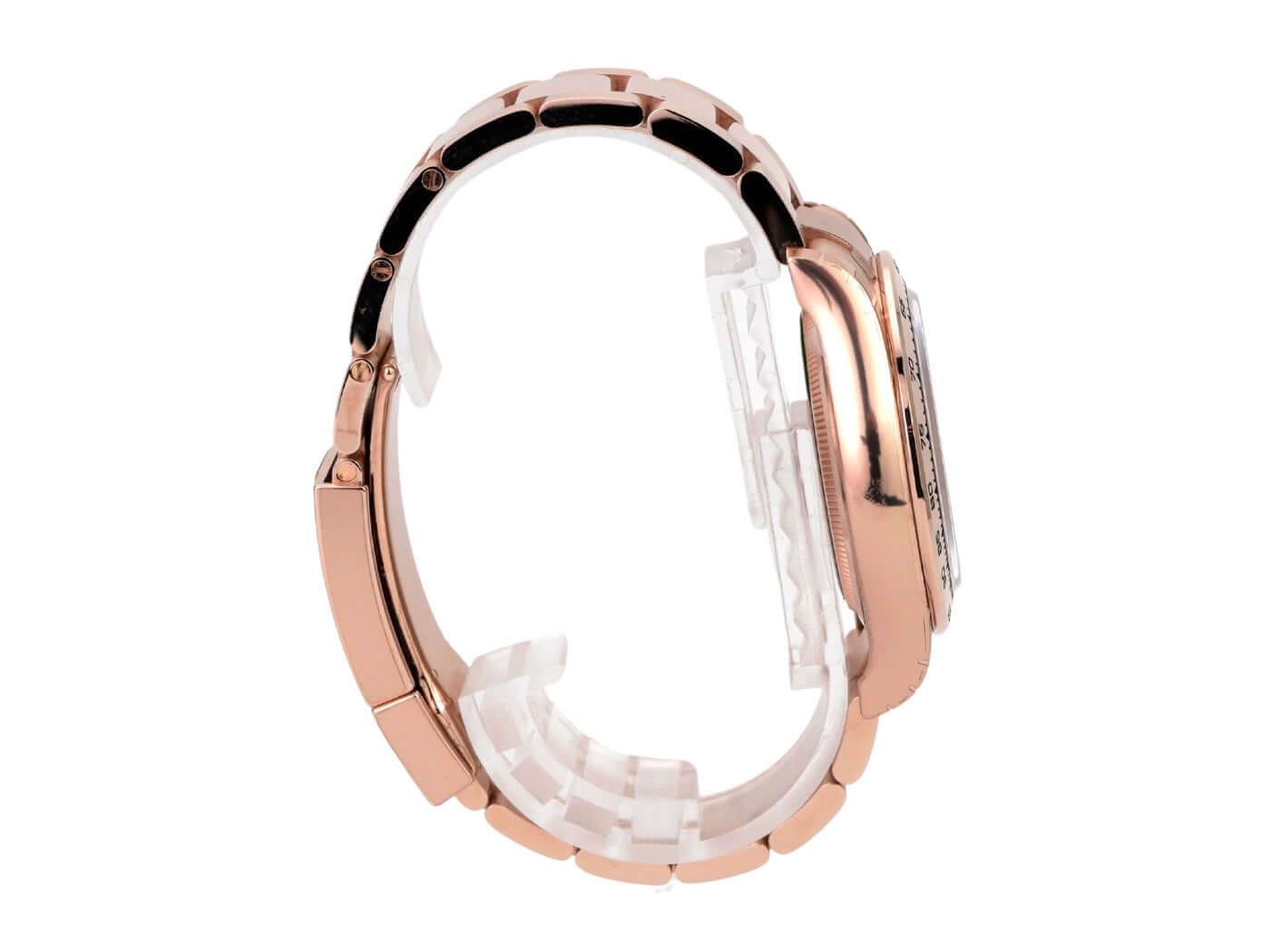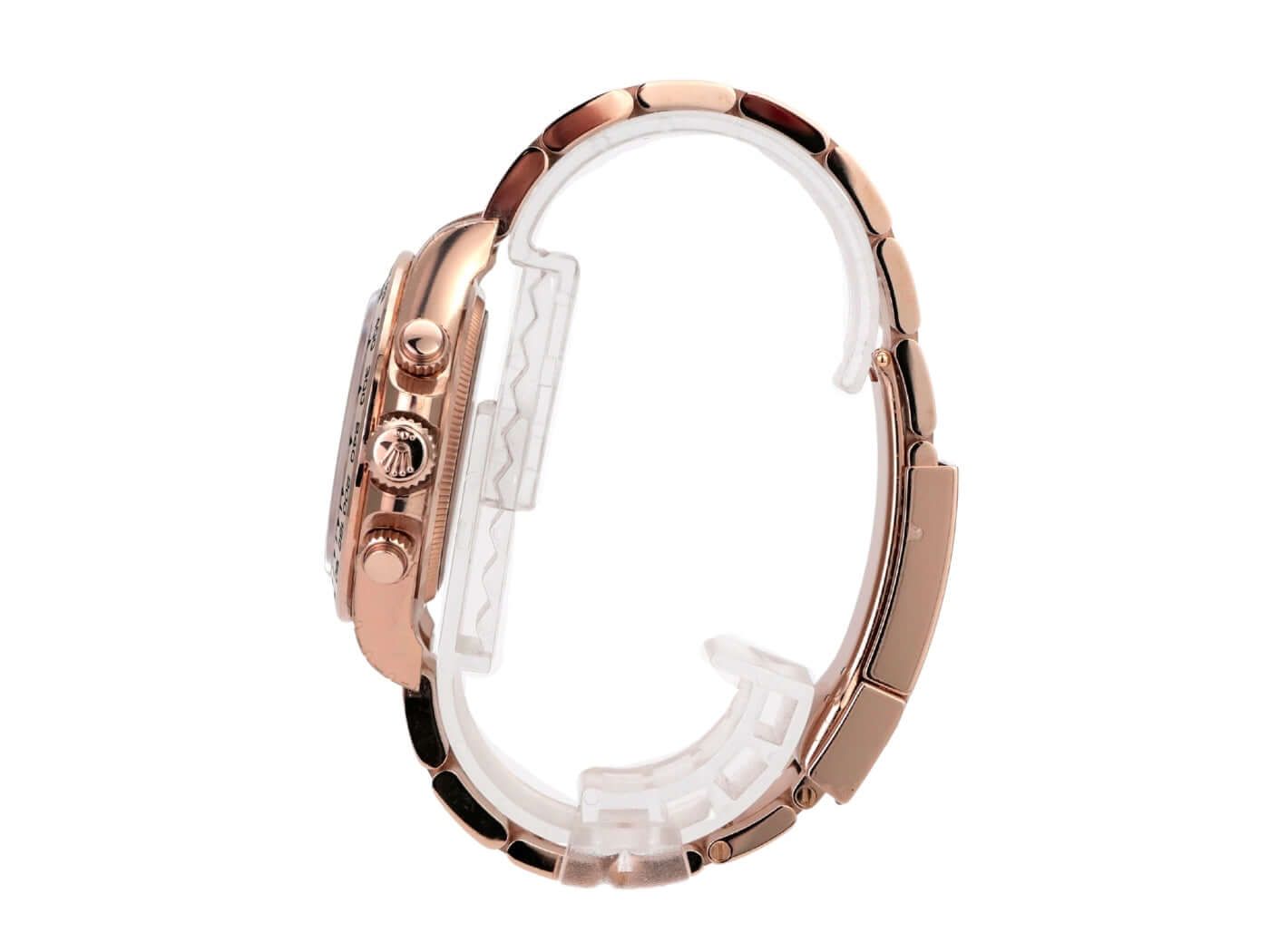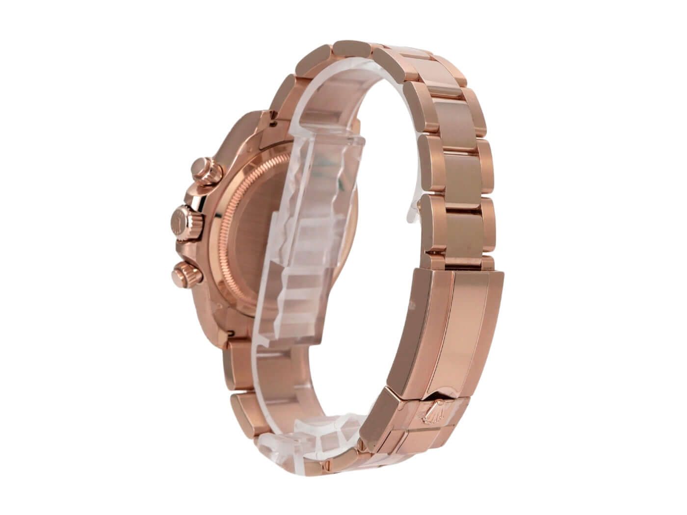 Cassa realizzata in oro Everose 18 kt, lucido e satinato, diametro della cassa 40 mm, lunetta in oro Everose 18 kt lucida e incisa con scala tachimetrica, bracciale Oyster in oro Everose 18 kt lucido e satinato con chiusura pieghevole, quadrante marrone con indici luminescenti, sottodial neri, lancette luminescenti, movimento automatico, calibro Rolex 4131 con 47 rubini, frequenza 28.800 A/h, cronometro, vetro zaffiro resistente ai graffi, fondello della cassa in oro Everose 18 kt avvitato, impermeabile fino a 10 bar.