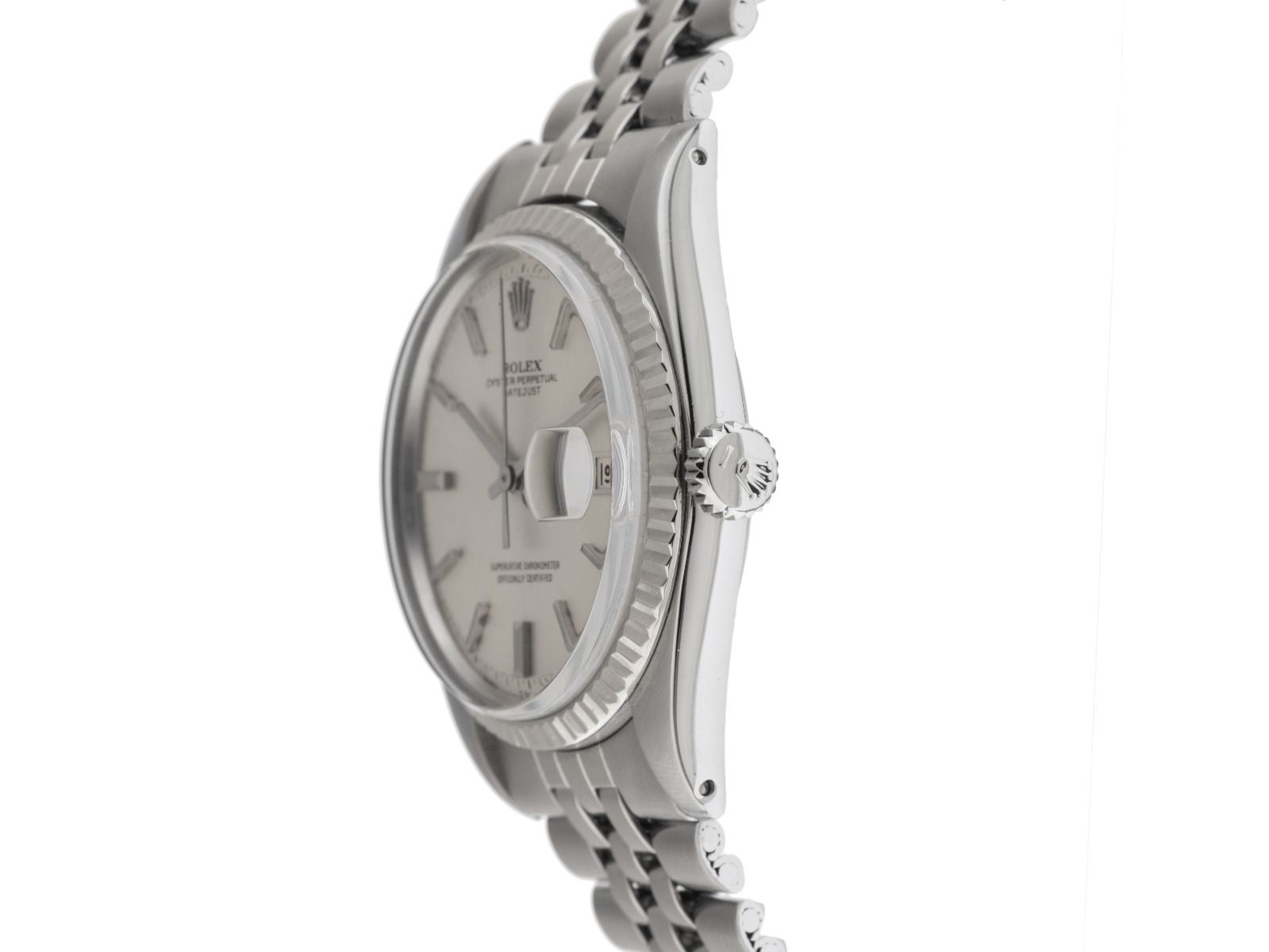 Rolex Datejust Stahl 18kt Weißgold Automatik Armband JubiléGehäuse Edelstahl poliert und satiniert, Gehäusedurchmesser ohne Krone 36mm, Gehäusehöhe 11,9mm. Lünette 18kt Weißgold geriffelt und poliert. Armband Jubilé gefaltet Edelstahl poliert und satiniert, Rolex Faltschließe Edelstahl mit Hersteller-Logo. Zifferblatt silberfarben mit gekröpfter Minuterie, aufgesetzten Indexen und weißgoldenen Zeigern. Uhrwerk Automatik, Chronometer, Rolex Manufakturkaliber 1570 mit 26 Edelsteinen. Anzeige von Stunde, Minute und Sekunde über Zeiger aus der Mitte, Datumsanzeige unter Glaslupe bei 3 Uhr mit open 6/9 (offene 6 und 9 in der Datumsanzeige). Plexiglas gewölbt. Krone verschraubbar mit Hersteller-Logo. Boden Edelstahl verschraubt. Gewicht der Uhr inklusive Armband 84g, Länge des Armbandes inklusive Gehäuse 180mm. Referenznummer: 1601, Baujahr: 1972, Gehäusenummer: 3218XXX, ID: KA1634118621025H-8500, Artikelnummer: 10000082822. Mit Gangkontrolle und kompletter äußerlicher Aufarbeitung von Oktober 2025. Original Rolex Box mit Umkarton und Garantie Papiere ohne Datumseintrag, Beschreibung, Ledermäppchen, Rolex Chronometer-Siegel sowie Watchregister Auszug von Oktober 2025, The Watch Register Zertifikat / ohne Eintrag (Internationale Datenbank für verlorene oder gestohlene Uhren), Full Set. Superschnäppchen, Kapitalanlage mit Wertsteigerungspotential. Sehr guter Zustand. Lieferzeit sofort.