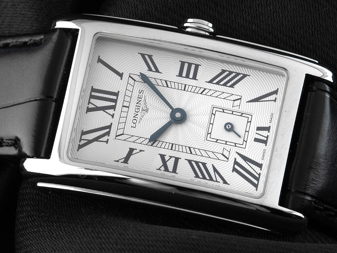 Cassa in acciaio inox lucido, rettangolare, dimensioni della cassa senza corona (L x P x A) 27 x 23,3 x 6,8mm. Lunetta in acciaio inox liscia e lucida. Bracciale in pelle di coccodrillo nera con cucitura decorativa, larghezza dell'attacco 17mm, fibbia ad ardiglione in acciaio inox con logo del produttore. Quadrante color argento con effetto Fliquet, numeri romani bluati e lancette bluate. Movimento al quarzo. Indicazione di ore e minuti tramite lancette centrali, piccolo secondo con fermo secondo per la regolazione precisa dell'ora a 6 ore. Vetro zaffiro antigraffio. Corona zigrinata. Fondello in acciaio inox inciso. Peso dell'orologio incluso il bracciale 26g. Impermeabile fino a 3 ATM. Numero di riferimento: L5.512.4.71.4, ID: ST610218601125RE-1550, numero articolo: 10000083512. Scatola originale Longines con imballaggio e documenti di garanzia del 2025, Full Set. Mai indossato. Tempi di consegna immediati.