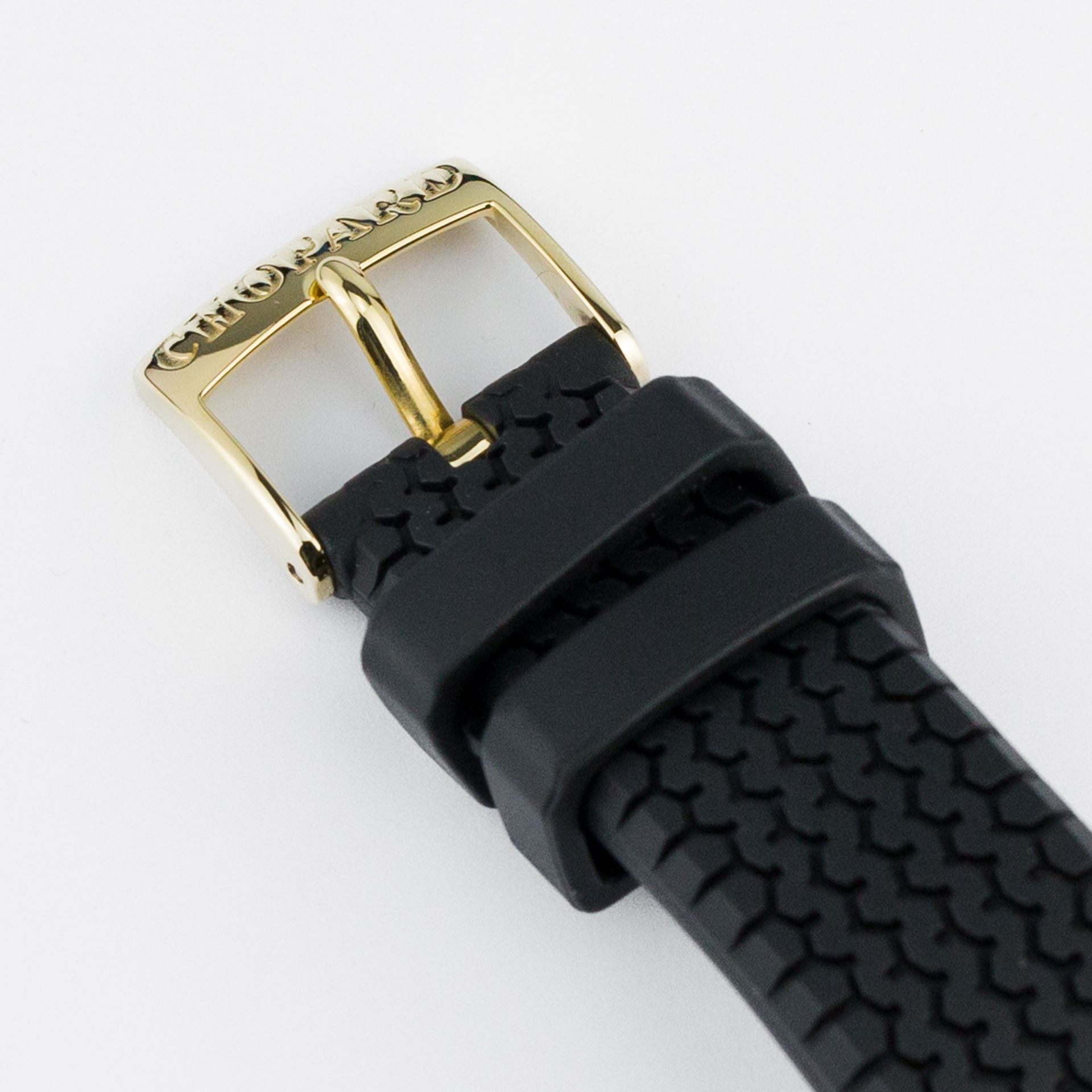 The Chopard Mille Miglia watch series is designed in the spirit of motor racing, and this is evident in every element of this timepiece's design. The trademark of the iconic “1000 Miglia” race, which gave its name to this series, is proudly positioned on the watch's dial (as well as in the form of an engraving on its crown), the dial itself is finished in the same way as the dashboards of vintage racing cars were (which are the main participants in this race to this day), and along the outer edge is the tachymeter scale, which not only reinforces the racing spirit of the watch but also allows for speed calculations, the strap features the tread pattern of a car tire.The case of this watch is a classic 40 mm in size, making it extremely comfortable to wear, the height is only 11.5 mm, and the fact that the case is crafted from 18-carat yellow gold makes it very attractive. Arabic numerals for hour markers, gold hands with SuperLuminova inserts, a transparent case back – all of this indicates the watch's thoroughbred pedigree and makes it very noticeable.