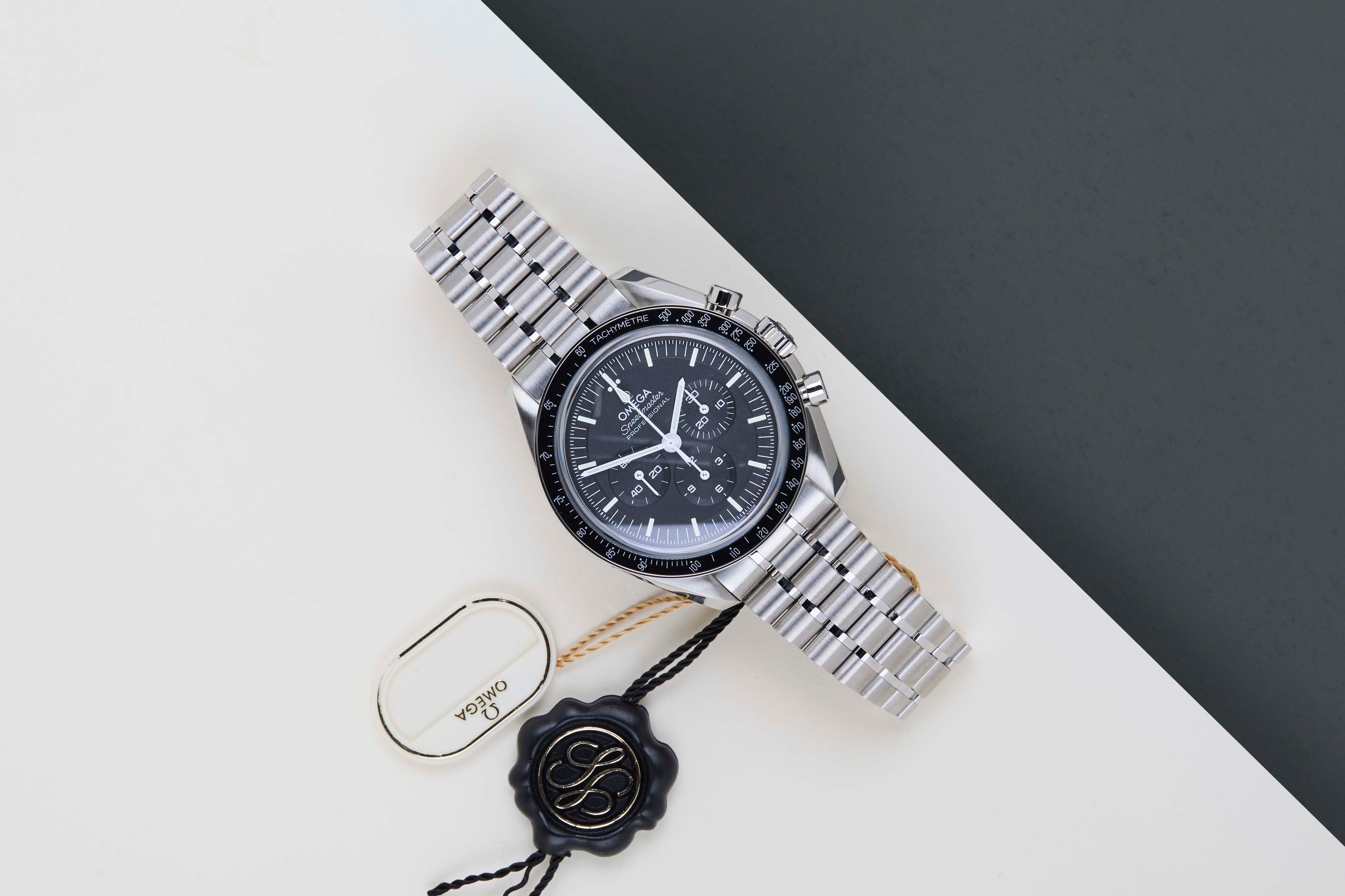 Questo Omega Speedmaster Moonwatch Professional è in condizioni Nuovo & Mai Indossato e viene fornito con i documenti di garanzia Omega originali e la scatola. Inoltre, l'orologio ha una Garanzia Internazionale Omega fino a febbraio 2031.