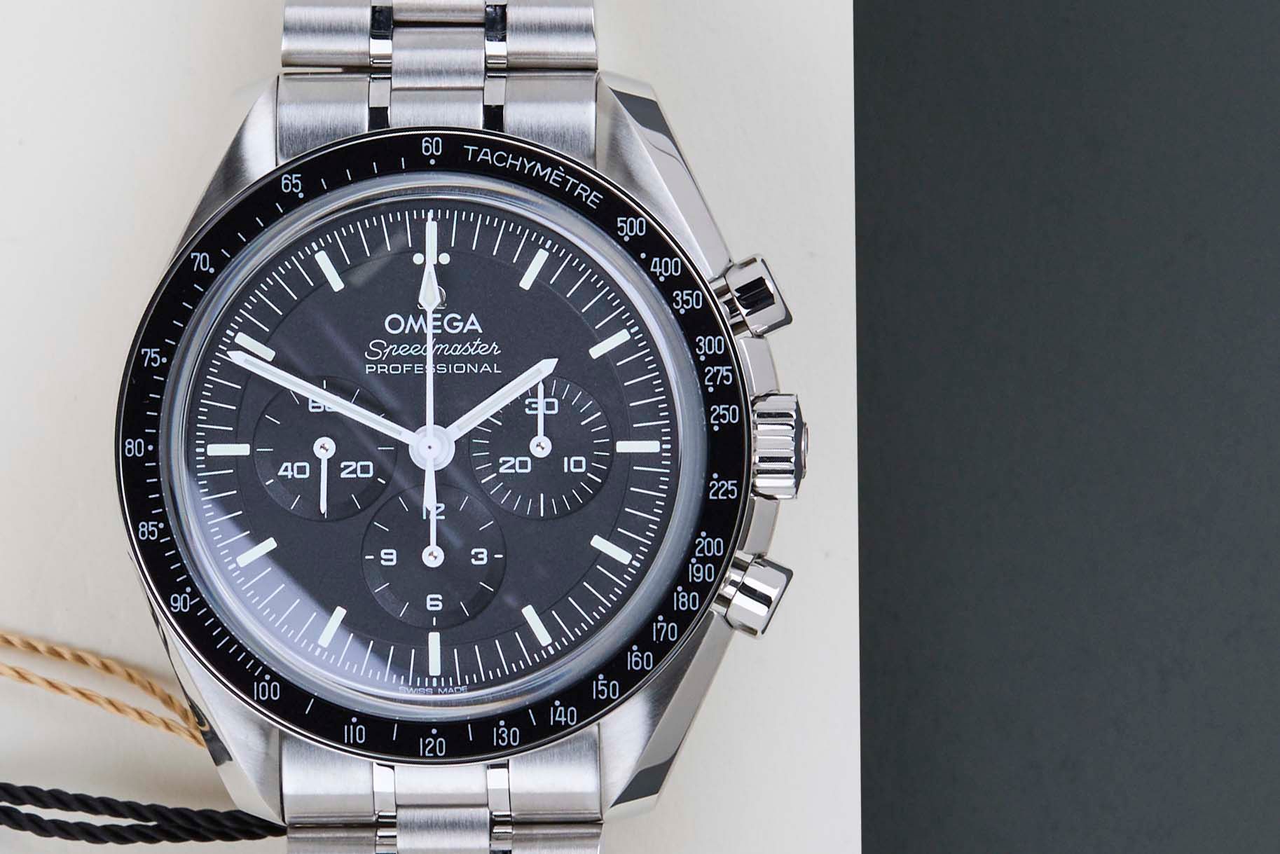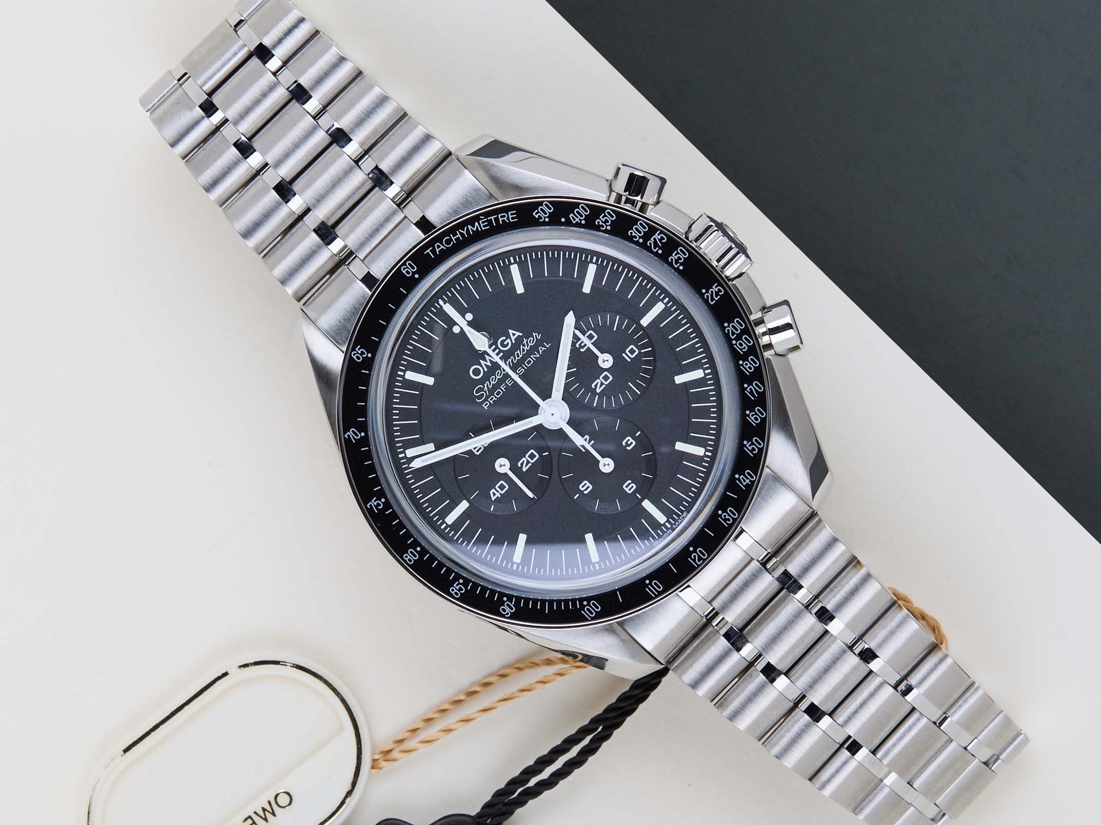 Lo Speedmaster Moonwatch Professional presenta una cassa in acciaio inossidabile con un diametro di 42mm e una lunetta tachimetrica nera. Il suo quadrante cronografo mostra tre sotto-quadranti per misurare il tempo trascorso, inclusi secondi, minuti e ore.