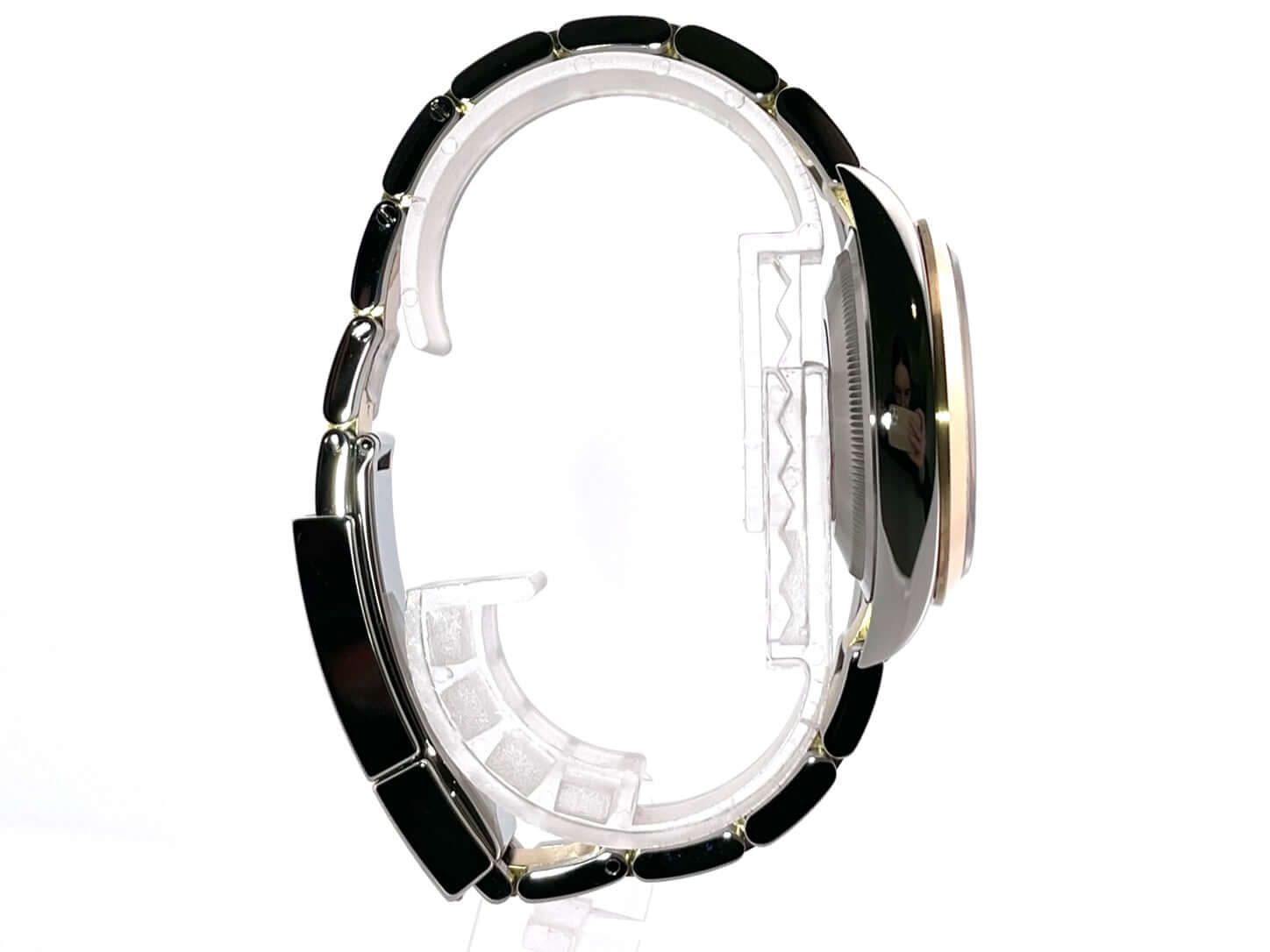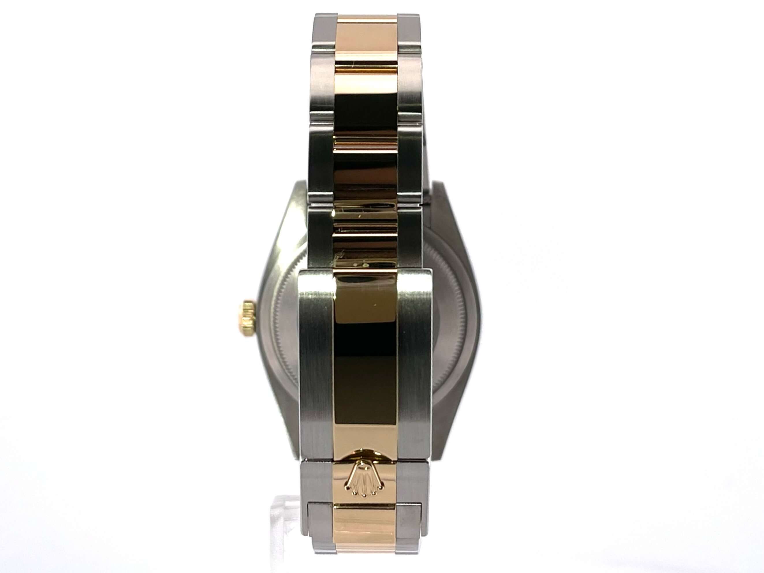 Cassa realizzata in acciaio inox lucido e satinato, diametro della cassa 36 mm, lunetta in oro giallo 18 kt lucido, bracciale Oyster in acciaio inox / oro giallo lucido e satinato con chiusura pieghevole, quadrante nero con numeri arabi luminosi applicati e indici luminosi, lancette dorate luminose, movimento automatico, calibro Rolex 3230 con 31 rubini, frequenza 28.800 A/h, riserva di carica di 70 ore, cronometro, vetro zaffiro resistente ai graffi, corona a vite, fondo cassa in acciaio inox a vite, impermeabile fino a 10 bar.