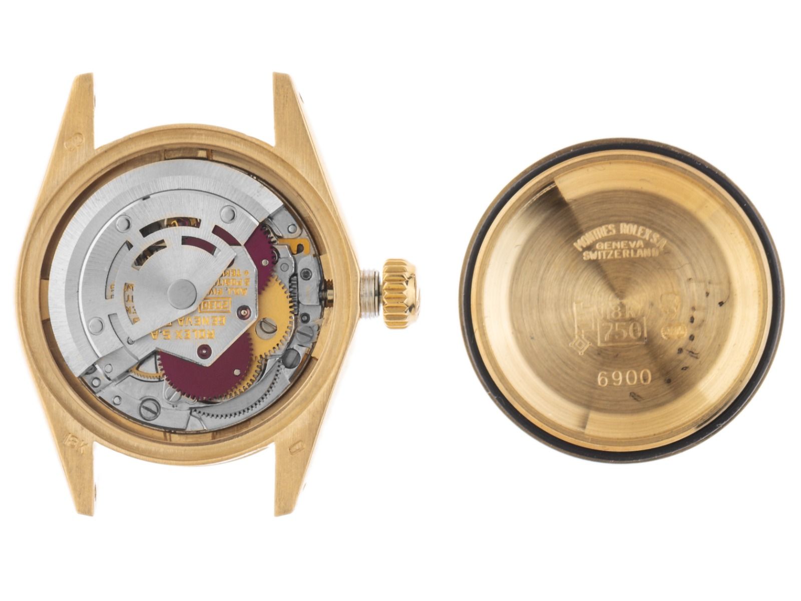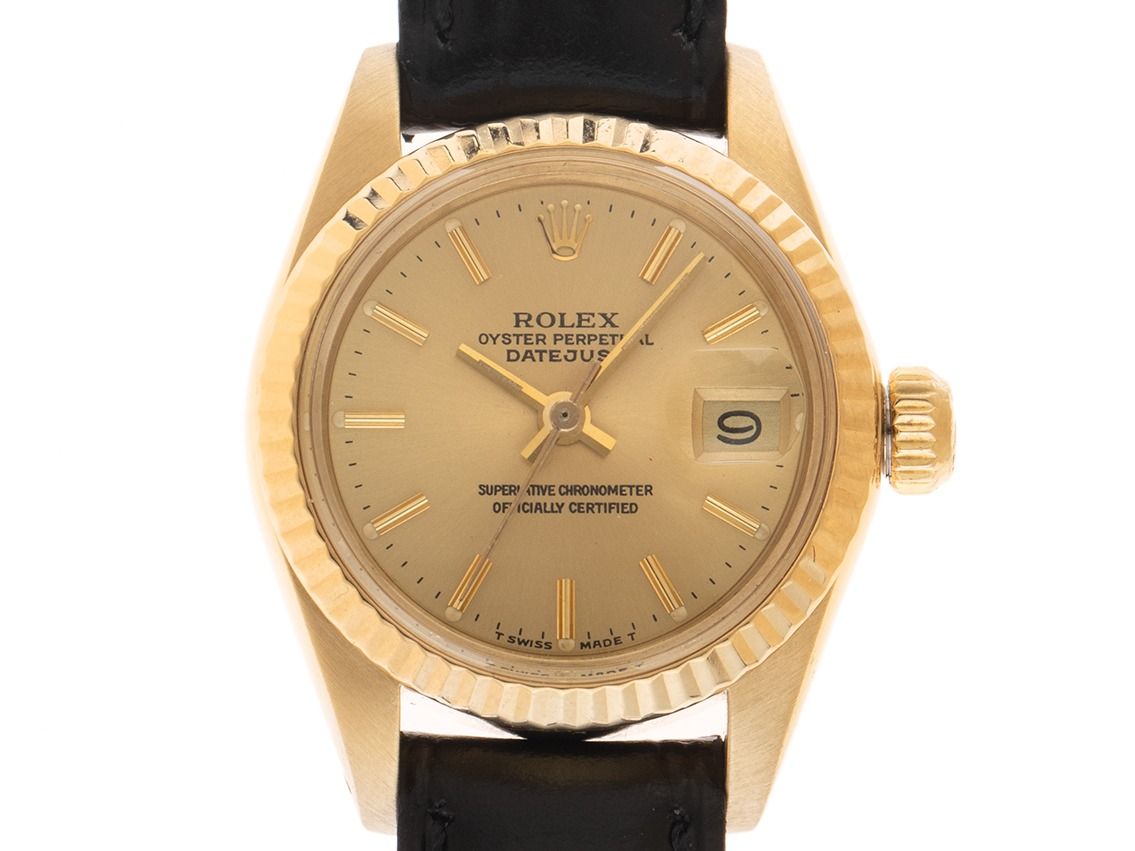 Gehäuse 18kt Gelbgold poliert und satiniert, Gehäusedurchmesser ohne Krone 26mm, Gehäusehöhe 11,2mm. Lünette 18kt Gelbgold geriffelt und poliert. Armband Krokoleder schwarz, Anstoßbreite 13mm, Stiftschließe vergoldet. Zifferblatt champagnerfarben mit aufgesetzten gelbgoldenen Indexen und gelbgoldenen Zeigern. Uhrwerk Automatik, Chronometer, Rolex Manufakturkaliber 2030 mit 28 Edelsteinen. Anzeige von Stunde, Minute und Sekunde über Zeiger aus der Mitte mit Sekundenstopp zur sekundengenauen Einstellung der Uhrzeit, Datumsanzeige unter Glaslupe bei 3 Uhr, open 6/9 (offene 6 und 9 in der Datumsanzeige). Plexiglas. Krone verschraubbar mit Hersteller-Logo. Boden 18kt Gelbgold verschraubt. Gewicht der Uhr inklusive Armband 35g. Referenznummer: 6917, Gehäusenummer: 5505XXX, Baujahr: 1978, ID: P243559600226H-7850, Artikelnummer: 10000084592. Mit Gangkontrolle und kompletter äußerlicher Aufarbeitung von Februar 2026. Original Rolex Box mit Umkarton sowie Beschreibung, Übersetzungsheft, Ledermäppchen, Rolex Chronometer-Siegel und Watchregister Auszug von Januar 2026, The Watch Register Zertifikat / ohne Eintrag (Internationale Datenbank für verlorene oder gestohlene Uhren). Kapitalanlage mit Wertsteigerungspotential, extrem seltenes Sammlerstück. Sehr guter Zustand. Lieferzeit sofort.