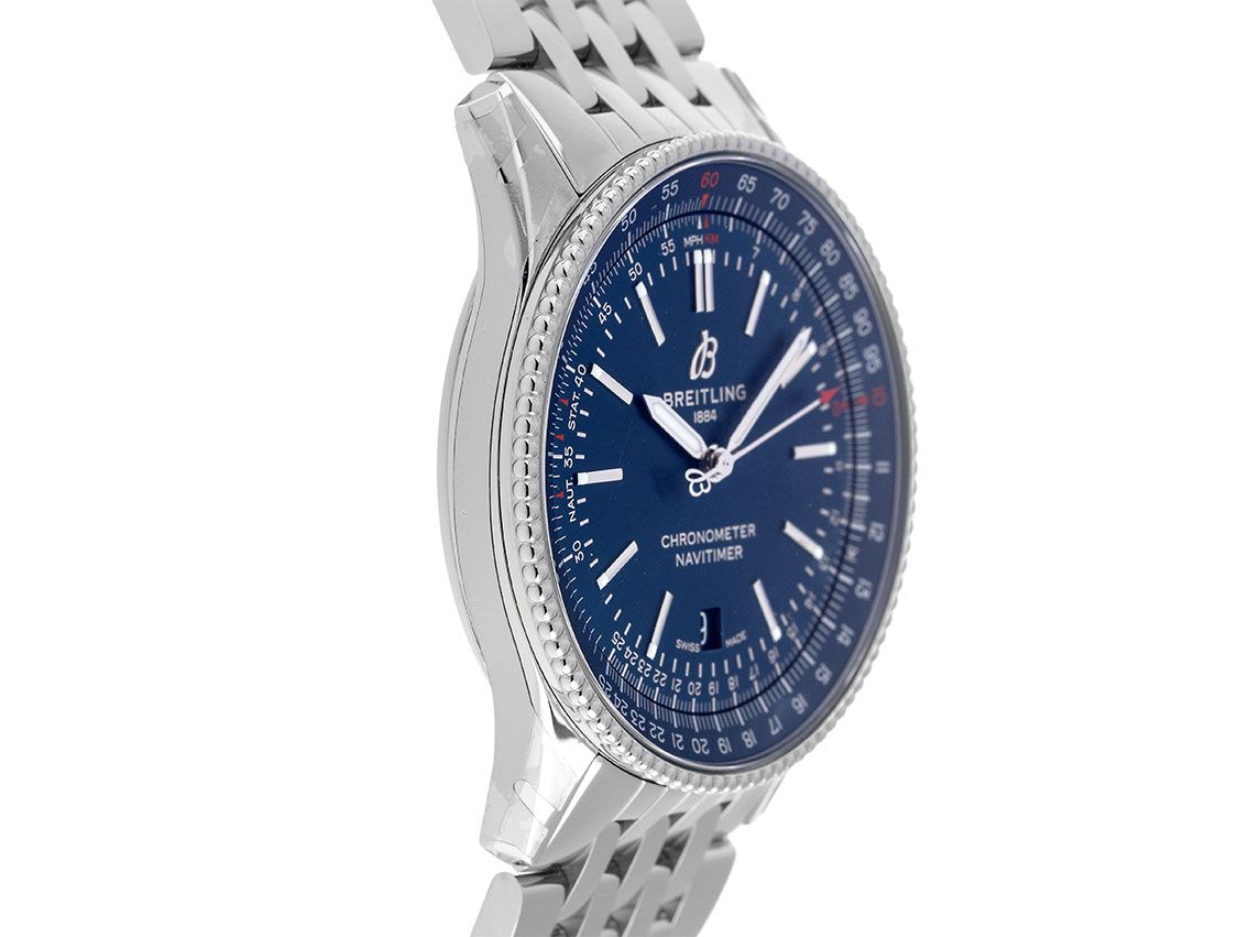 Breitling Navitimer Stahl Automatik Armband StahlGehäuse Edelstahl poliert und satiniert, Gehäusedurchmesser ohne Krone 41mm, Gehäusehöhe 10,0mm. Perlenlünette poliert, beidseitig drehbar. Armband Edelstahl poliert, Sicherheitsfaltschließe Edelstahl mit Hersteller-Logo. Zifferblatt blau mit aufgesetzten Edelstahl Indexen und Edelstahl Leuchtzeigern. Uhrwerk Automatik, Chronometer mit Zeugnis, Kaliber Breitling B17 mit 26 Edelsteinen. Anzeige von Stunde, Minute und Sekunde über Zeiger aus der Mitte mit Sekundenstopp zur sekundengenauen Einstellung der Uhrzeit, Datumsanzeige mit Schnellverstellung bei 6 Uhr. Saphirglas kratzfest und gewölbt. Krone mit Hersteller-Logo. Boden Edelstahl verschraubt und graviert. Gewicht der Uhr inklusive Armband 131g, Länge des Armbandes inklusive Gehäuse 185mm. Wasserdicht bis 3 ATM. Referenznummer: A17326161C1A1, Gehäusenummer: 6713XXX, ID: P257446000226H-5700, Artikelnummer: 10000084906. Mit Gangkontrolle und kompletter äußerlicher Aufarbeitung von Februar 2026. Original Breitling Box und Garantie Papiere von Juli 2024 (Garantie bis 07/2029) sowie Beschreibung und Watchregister Auszug von Februar 2026, The Watch Register Zertifikat / ohne Eintrag (Internationale Datenbank für verlorene oder gestohlene Uhren), Full Set. Aus erster Hand, fast nicht getragen. Wie Neu. Lieferzeit sofort.