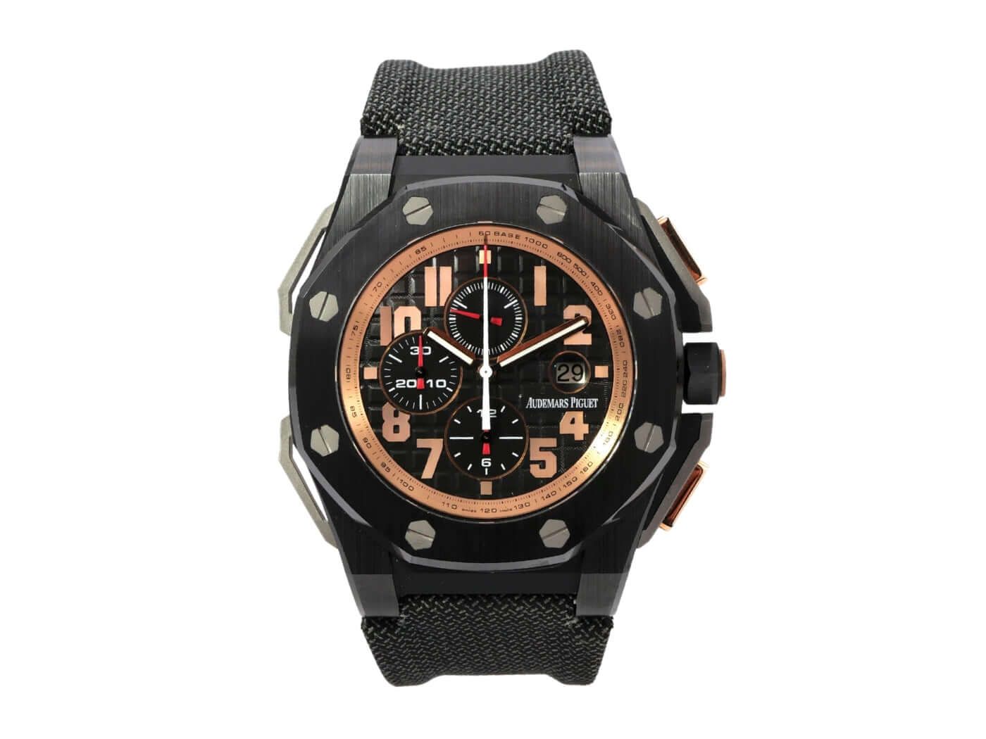 Audemars Piguet Royal Oak Offshore Arnold Schwarzenegger Legacy 26378IO.OO.A001KE.01Case made of ceramic / polished and satin-finished rose gold, case diameter 48 mm, black ceramic bezel, black leather strap with pin buckle, black dial with luminous markers, black subdials, tachymeter scale, self-winding movement, stopwatch, date display, anti-reflective sapphire glass, water-resistant up to 10 bar, limited to 1500 pieces.