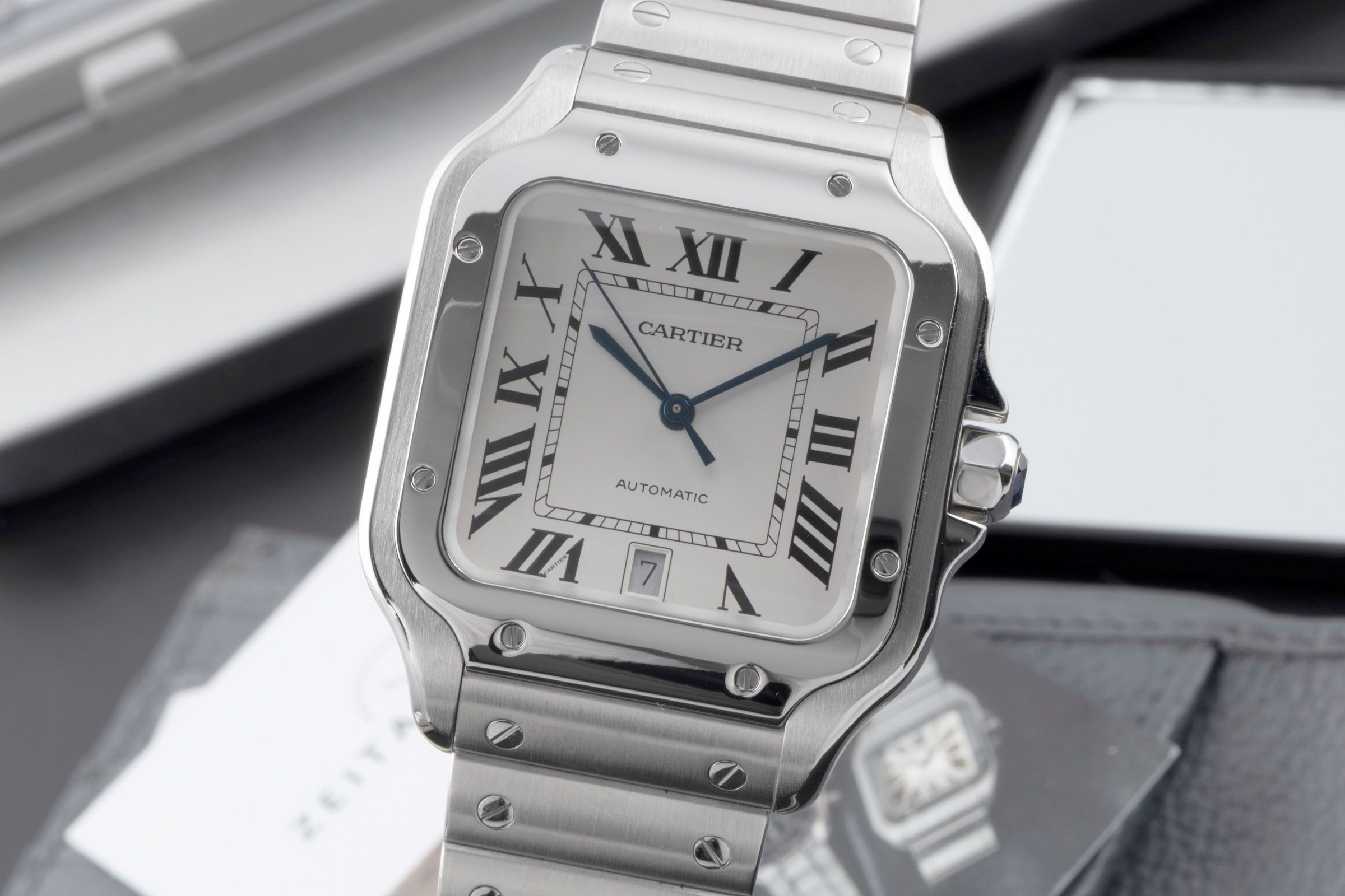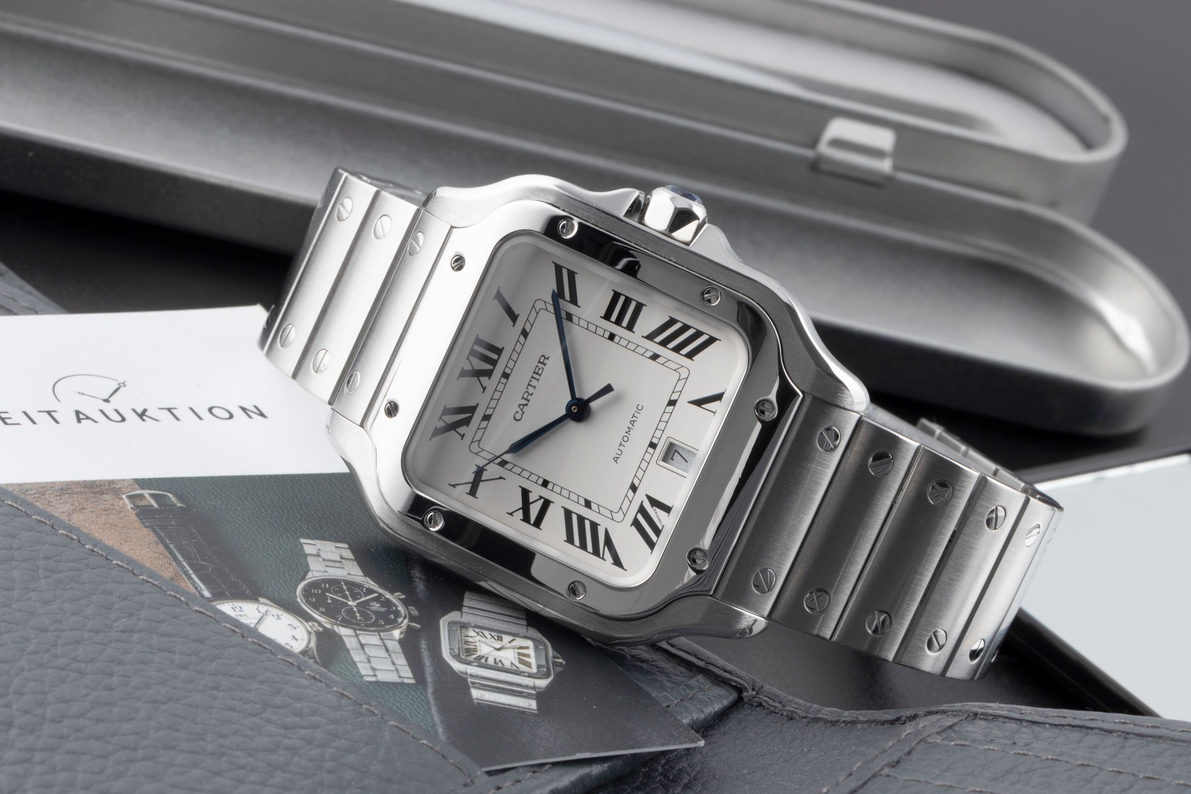 Alternative title: Cartier WSSA0009 Santos; Cartier Santos de Cartier Stahl Automatik Herrenuhr Ref. WSSA0009 VP: 8850,- € [2506510]