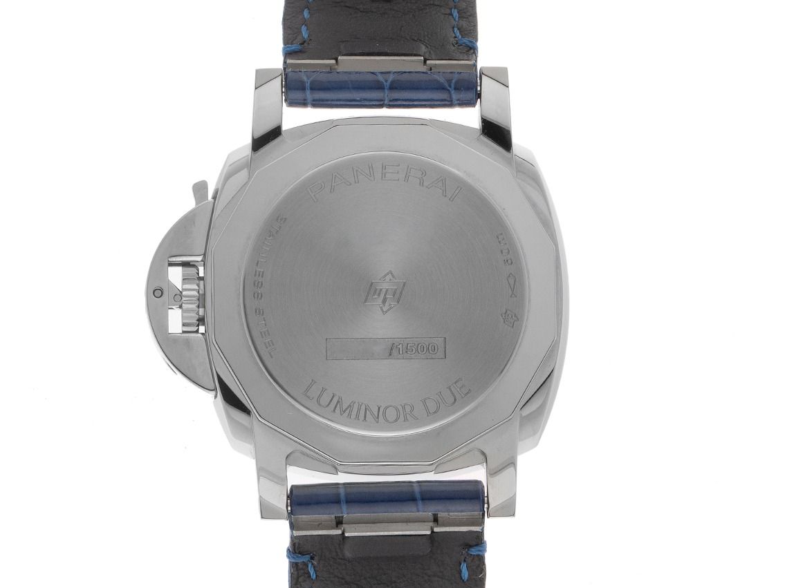 Panerai Luminor Due Luna Stahl Automatik Armband LederGehäuse Edelstahl poliert, Gehäusedurchmesser ohne Krone 38mm, Gehäusehöhe 12,9mm. Lünette Edelstahl glatt und poliert. Armband Leder blau mit Ziernaht, Anstoßbreite 20mm, Stiftschließe Edelstahl mit Hersteller-Logo. Zifferblatt blau mit Leuchtindexen, arabischen Ziffern und roségoldenen Leuchtzeigern. Uhrwerk Automatik, Chronometer mit Zeugnis, Panerai Manufakturkaliber P.900/MP mit 23 Edelsteinen, Gangreserve ca. 72 Stunden. Anzeige von Stunde und Minute über Zeiger aus der Mitte, kleine Sekunde bei 9 Uhr, Mondphasenanzeige mit Schnellverstellung bei 3 Uhr. Saphirglas kratzfest, doppelseitig entspiegelt und bombiert. Krone mit patentiertem Panerai Schutzbügel. Boden Edelstahl verschraubt und graviert. Gewicht der Uhr inklusive Armband 87g. Wasserdicht bis 5 ATM. Referenznummer: PAM01179, ID: ST1160142280326H-10000, Artikelnummer: 10000085004. Original Panerai Box mit Umkarton und Garantie Papiere von Dezember 2025 sowie Beschreibung, Full Set. Ungetragen. Lieferzeit sofort.