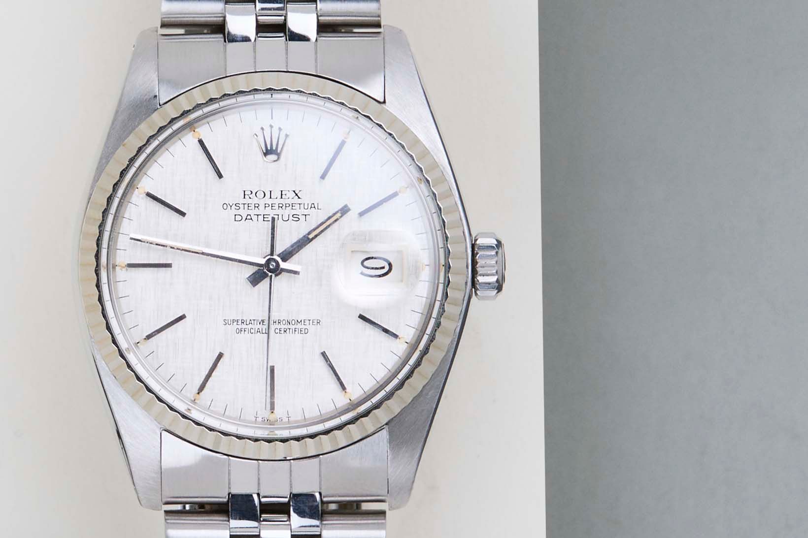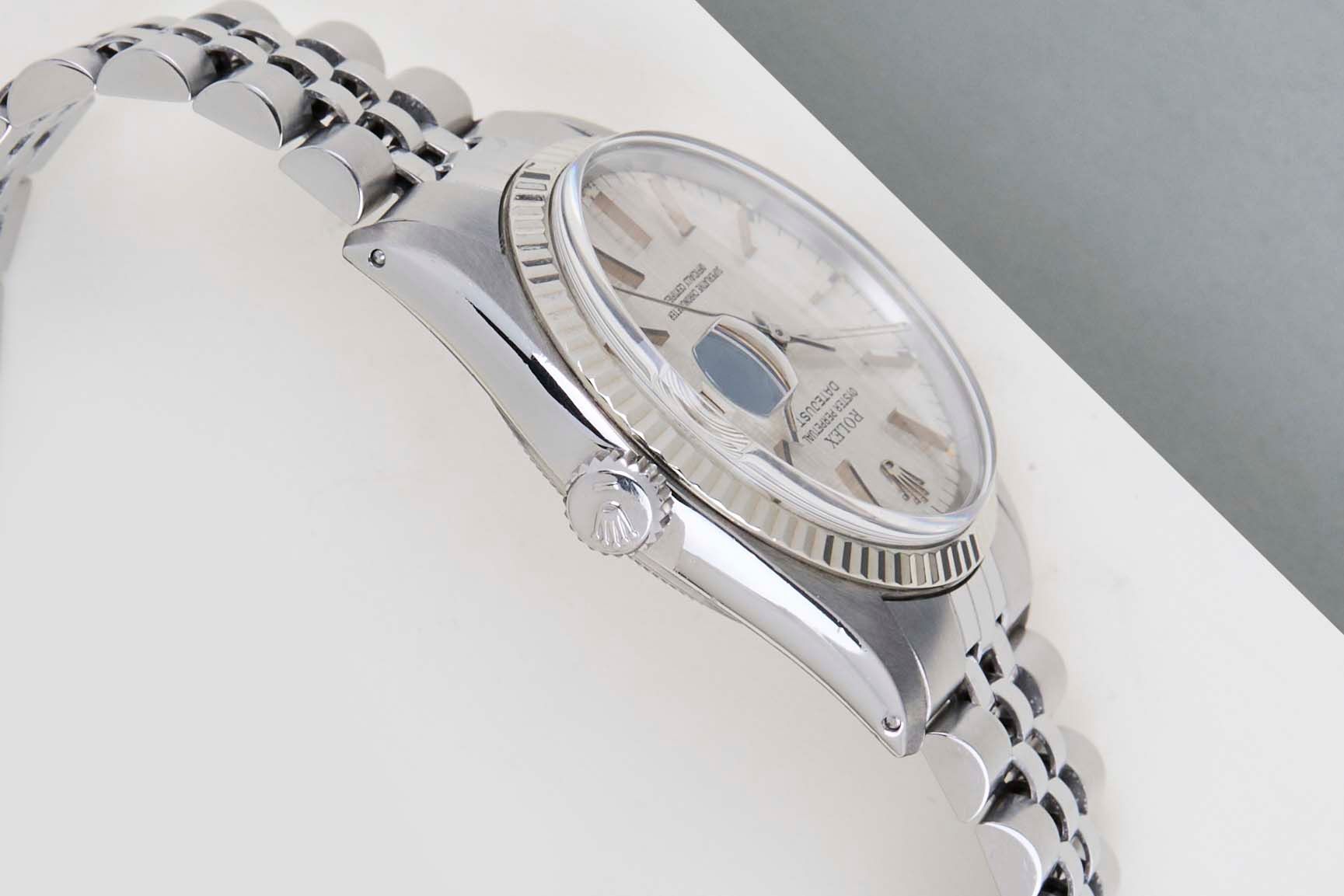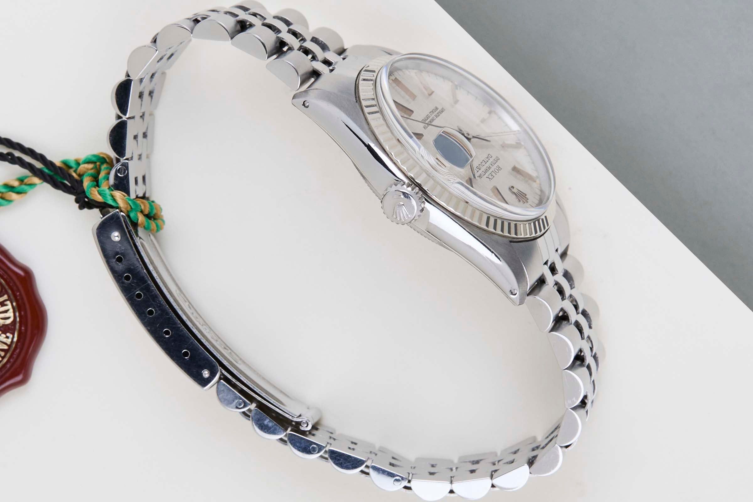 Clasp Code L12 | Endlink Code 555 | Bracelet Code 62510H Rolex introduced the original Datejust in 1945 to celebrate the company's 40th anniversary. Due to the various case sizes and materials, the Datejust has been ingrained in Rolex's history and remains incredibly popular for 75 years.This Datejust is made of a combination of 18k White Gold and stainless steel and is fitted with a Jubilee bracelet. This 16014 is equipped with an original T Swiss T 'Silver Linen' Dial. In addition, the Datejust is equipped with an open 6 & 9 Date Wheel. The main benefit of a 16014 over a 1601 is the quick-set function for the date.This Rolex Datejust 36 is in mint condition. Furthermore, the watch has been serviced by our watchmaker, and therefore it comes with one year of Steiner warranty.