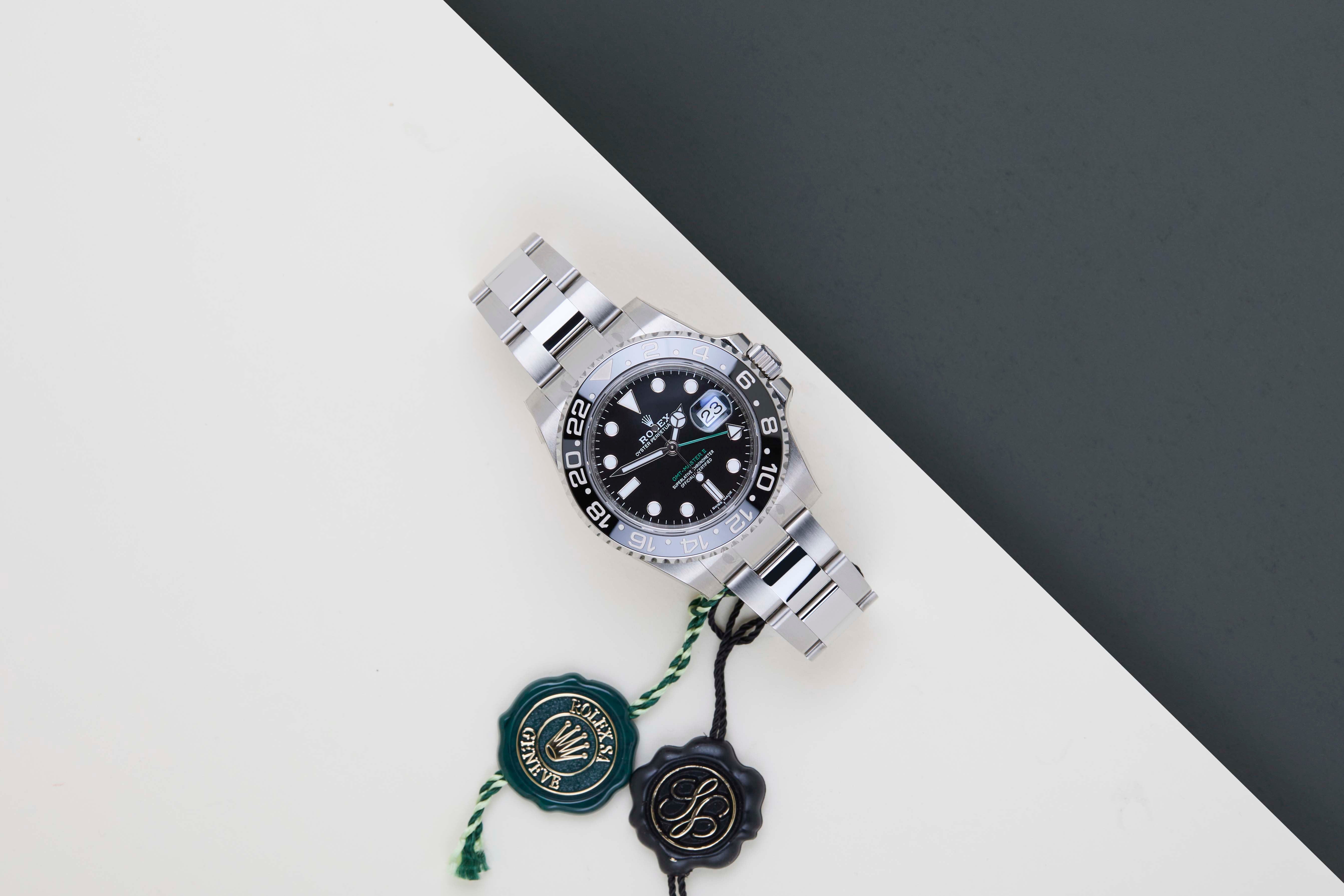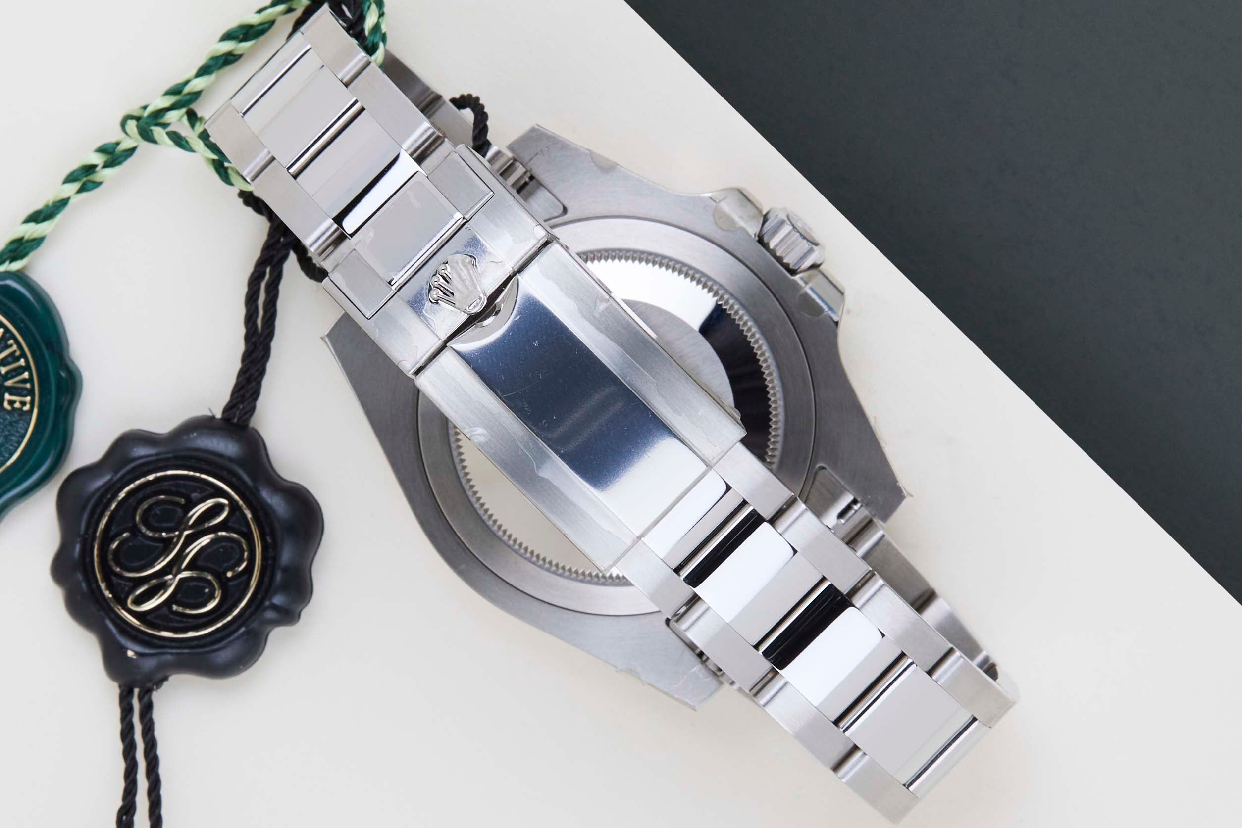 Questo Rolex GMT-Master II è Nuovo & Mai Indossato (NOS) e viene fornito con la Carta di Garanzia originale Rolex e la Scatola. Inoltre, l'orologio è stato controllato dal nostro orologiaio e quindi viene fornito con un anno di Garanzia Steiner.