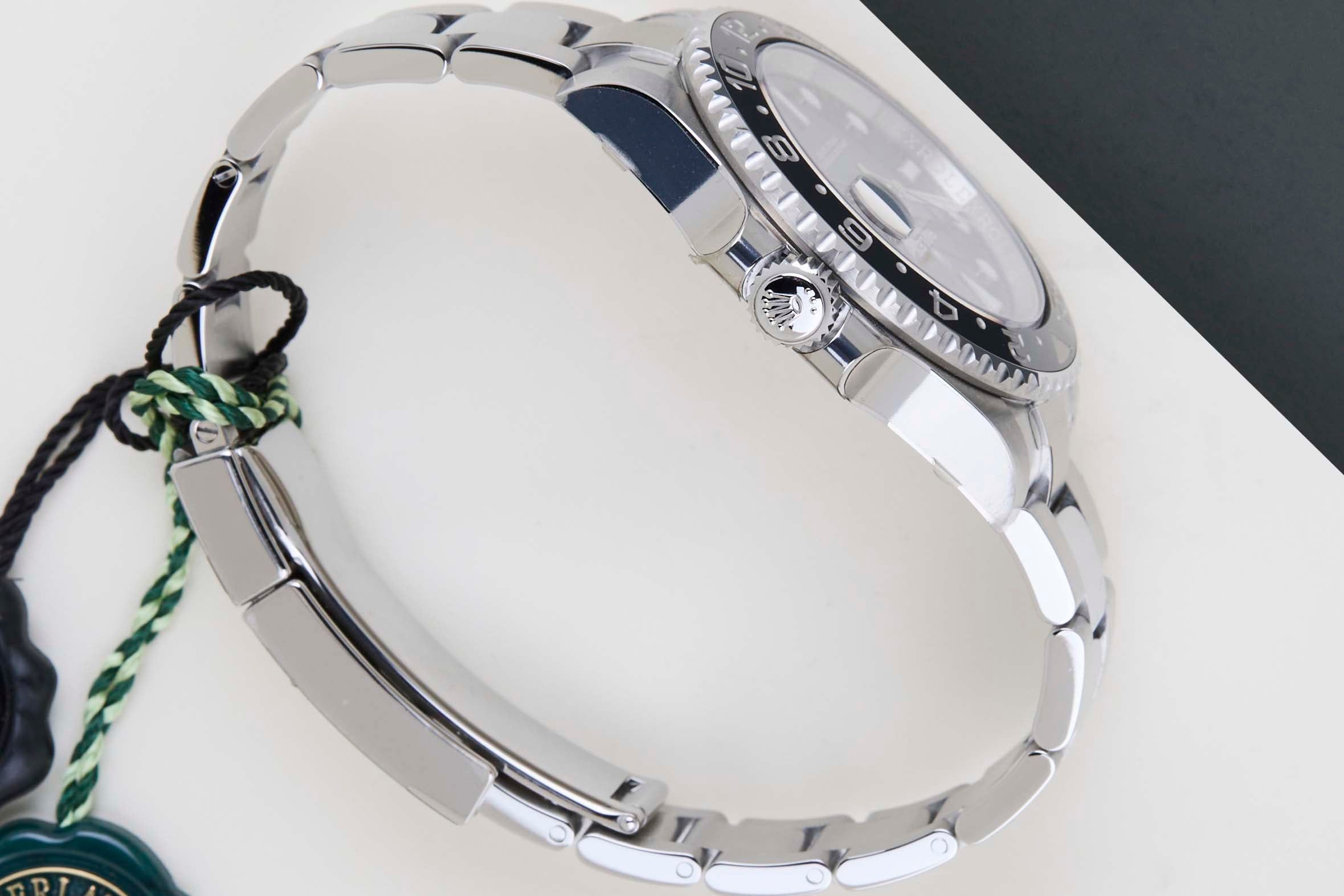 New & Unworn | NOS (Full Stickers) | Full Set The Rolex GMT was originally designed in collaboration with Pan American Airways and issued to their crews on long-haul flights. The dual time zone can track local and home time, which is a useful tool for pilots and those who are traveling a lot across different time zones.The reference 116710 is the first generation of the GMT-Master II with a Ceramic Bezel. The material to make this bezel is called 'Cerachrom', which was developed completely in-house by Rolex to be highly scratch-resistant.This Rolex GMT-Master II was sold for the first time in March 2019.This GMT-Master is made of stainless steel and is fitted with an Oyster Bracelet, which is equipped with the Easylink. This extension, allows the wearer to either extend or shorten the bracelet by 5 millimetres, improving the wearability and usability of the watch. This GMT is equipped with Black Bezel, which can be derived from the reference 116710LN, Lunette Noir.This Rolex GMT-Master II is New & Unworn (NOS) and comes with the original Rolex Warranty Card and Box. Furthermore, the watch has been checked by our watchmaker and therefore it comes with one year of Steiner Warranty.