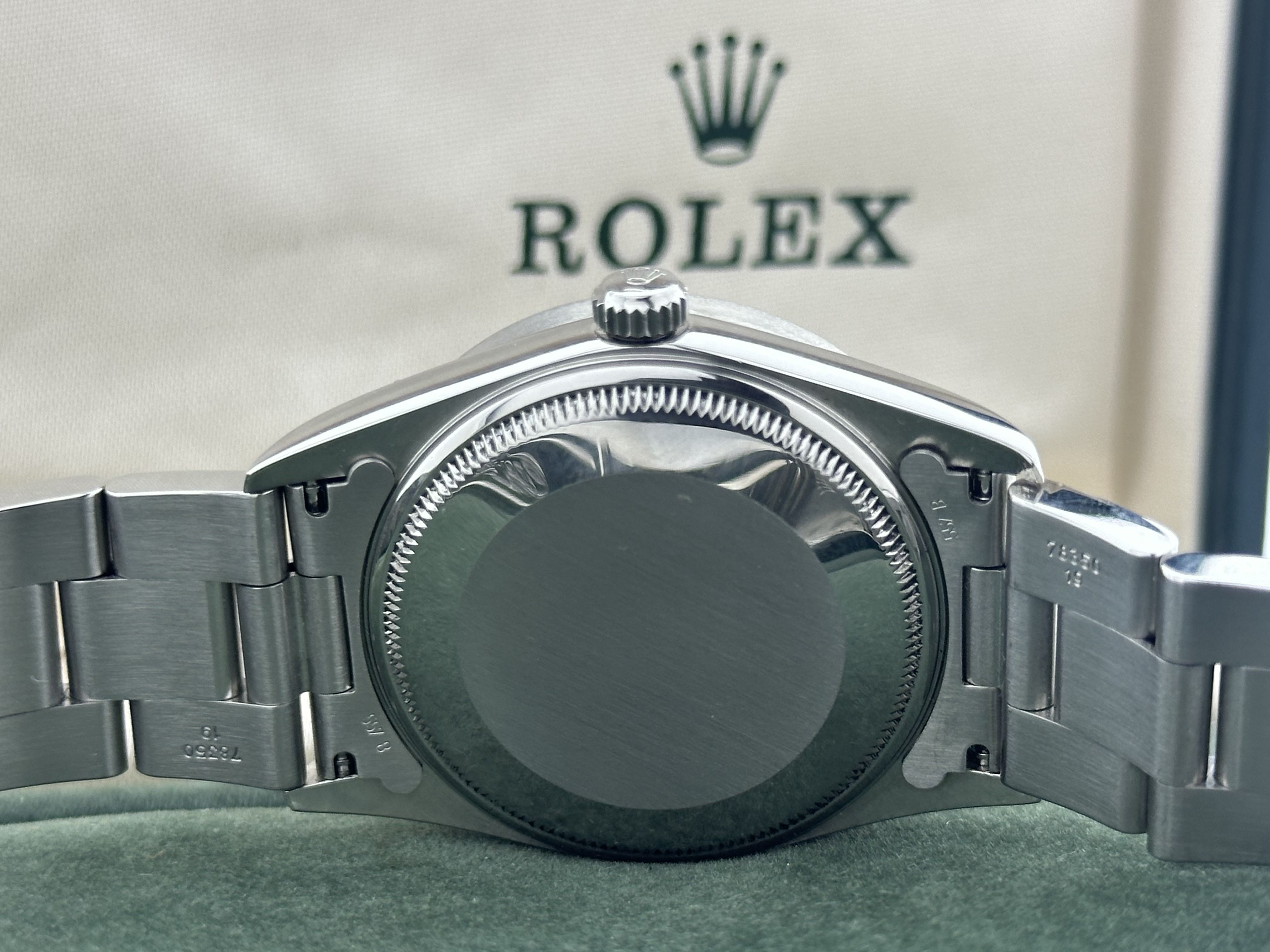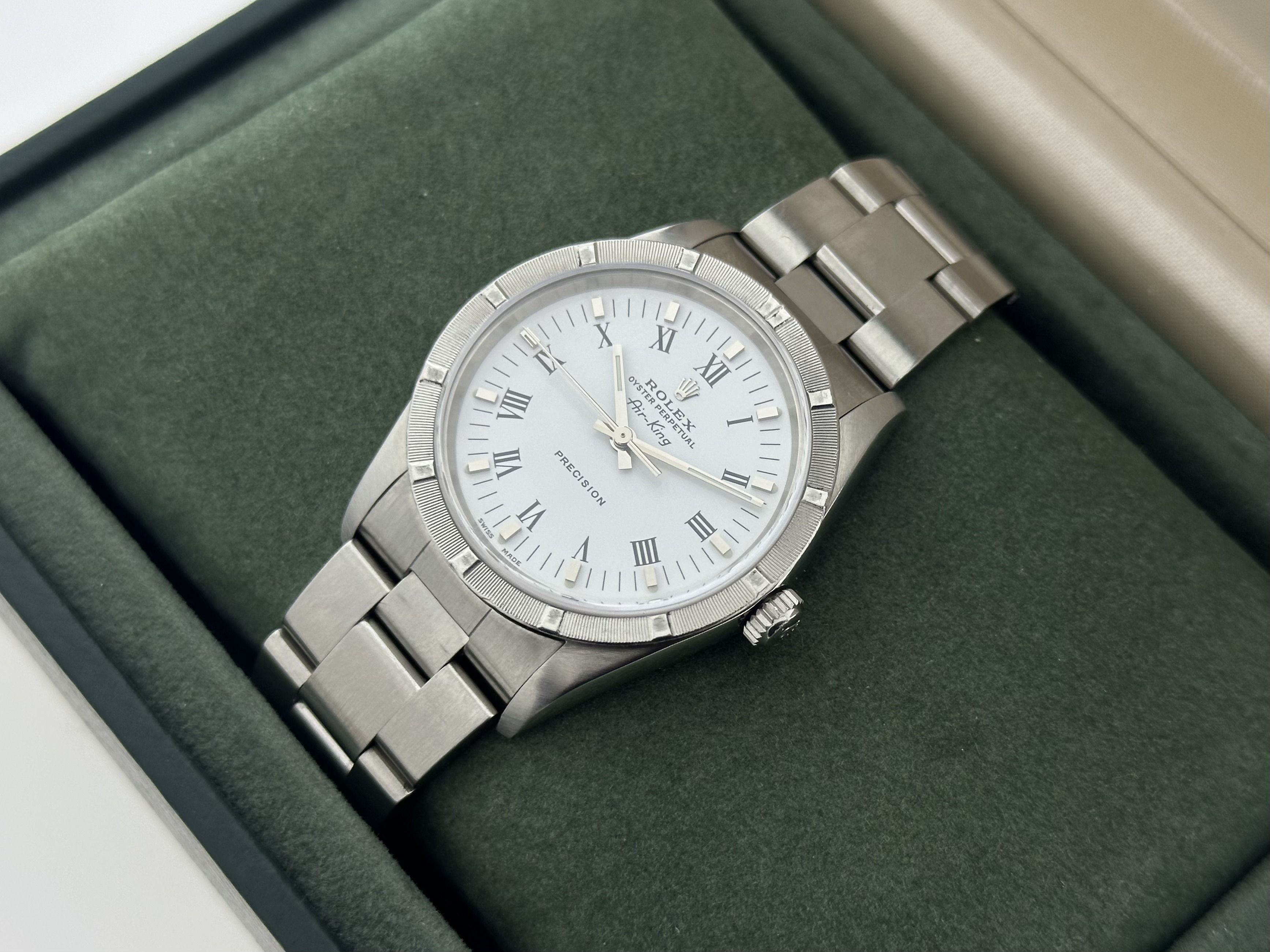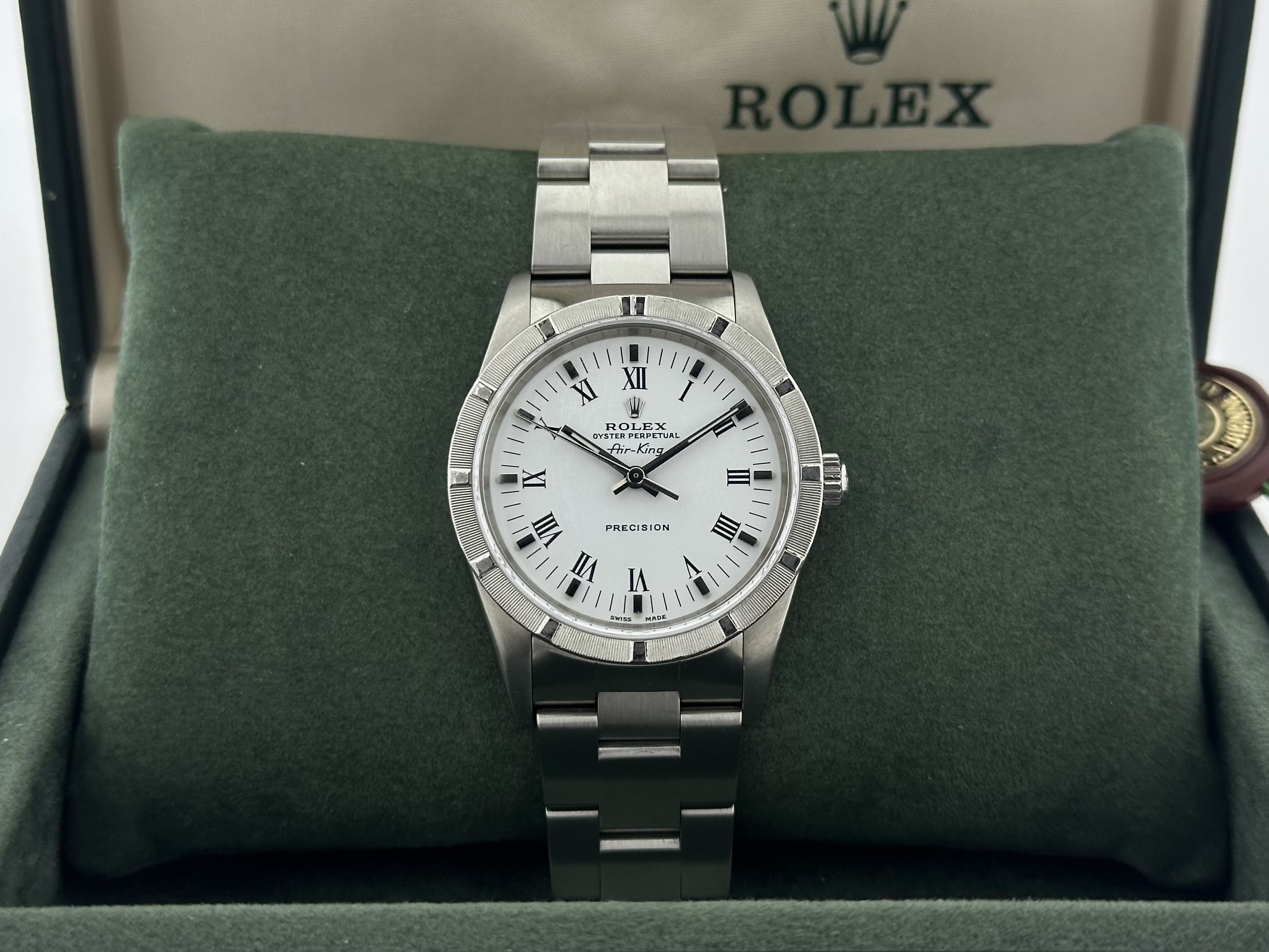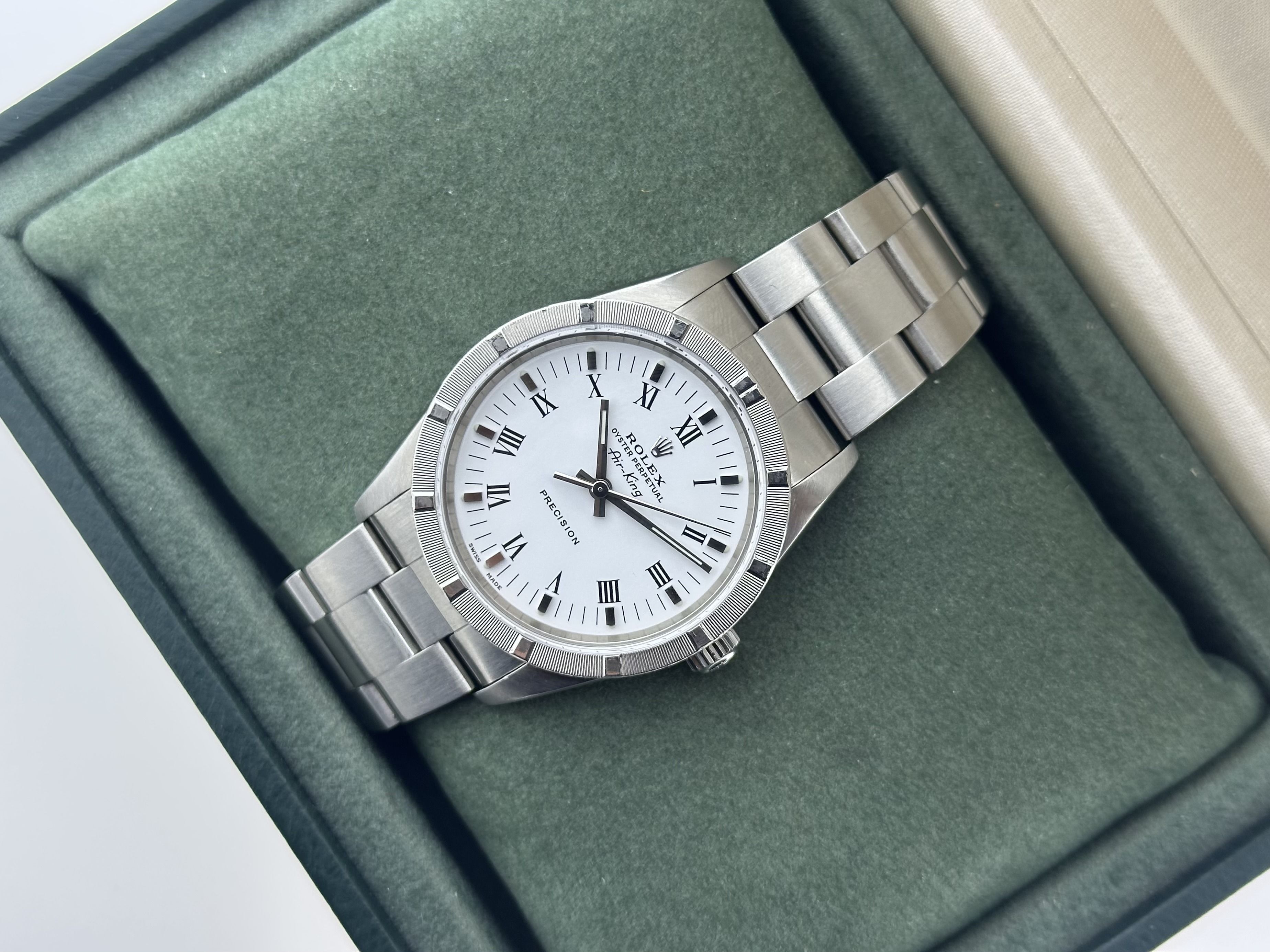 The Rolex comes with 24 months of warranty.A steel vintage Rolex Air-King 34, ref. 14010M. The Rolex has a 34mm case with a steel Oyster-bracelet. The watch has a white dial with Roman numerals. The watch is from 2006/2007. The Rolex has been serviced recently and is in a good condition. The Air-King comes with its originel box.