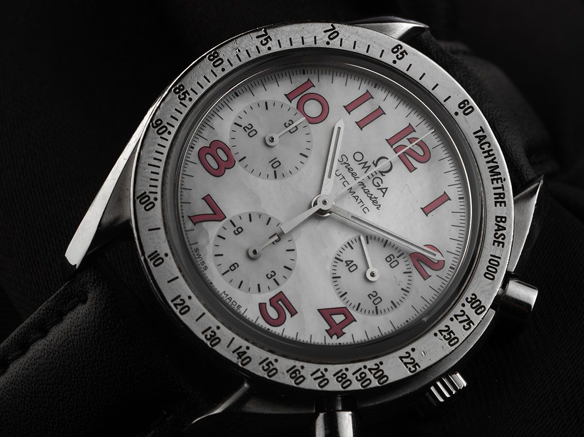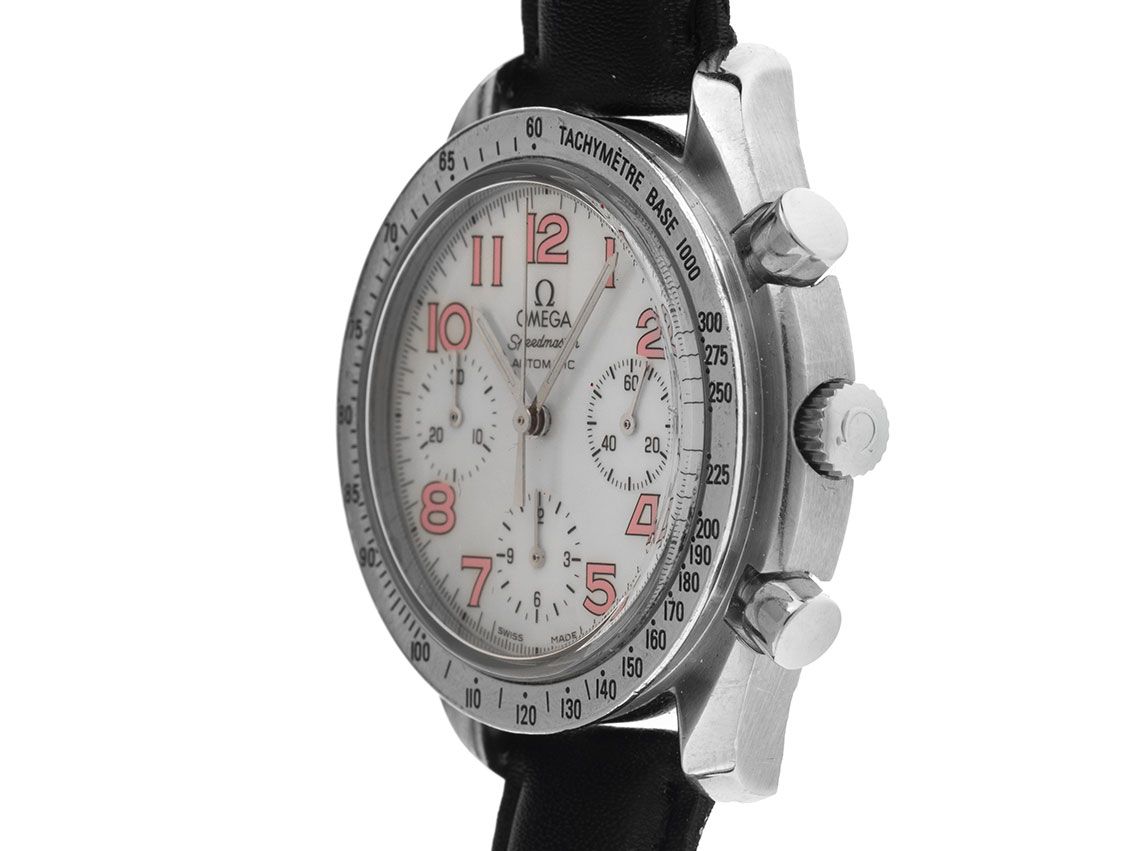 Cassa in acciaio lucido e satinato, diametro della cassa senza corona 39mm, altezza della cassa 11,2mm. Lunetta in acciaio lucido con scala tachimetrica. Cinturino in pelle nera con cucitura decorativa, larghezza dell'ansa 18mm, fibbia ad ardiglione in acciaio. Quadrante madreperla chiaro con numeri arabi rosa e lancette in acciaio. Movimento automatico, cronografo, cronometro, calibro Omega 3220A con 47 pietre preziose. Indicazione di ore e minuti tramite lancette centrali, piccolo secondo con arresto dei secondi per la regolazione precisa dell'ora a 3 ore. Vetro zaffiro antigraffio. Corona in acciaio con logo del produttore. Fondello in acciaio inciso. Peso dell'orologio incluso il cinturino 66g. Numero di riferimento: 175.0042, numero della cassa: 59594XXX, anno di costruzione: 1996, ID: P256436000226HW-5600, numero articolo: 10000084887. Scatola originale Omega con imballaggio e descrizione, estratto dal Watch Register di febbraio 2026, certificato The Watch Register / senza registrazione (database internazionale per orologi smarriti o rubati). Originale non lucidato, può essere ripristinato gratuitamente su richiesta. Tempi di consegna immediati.