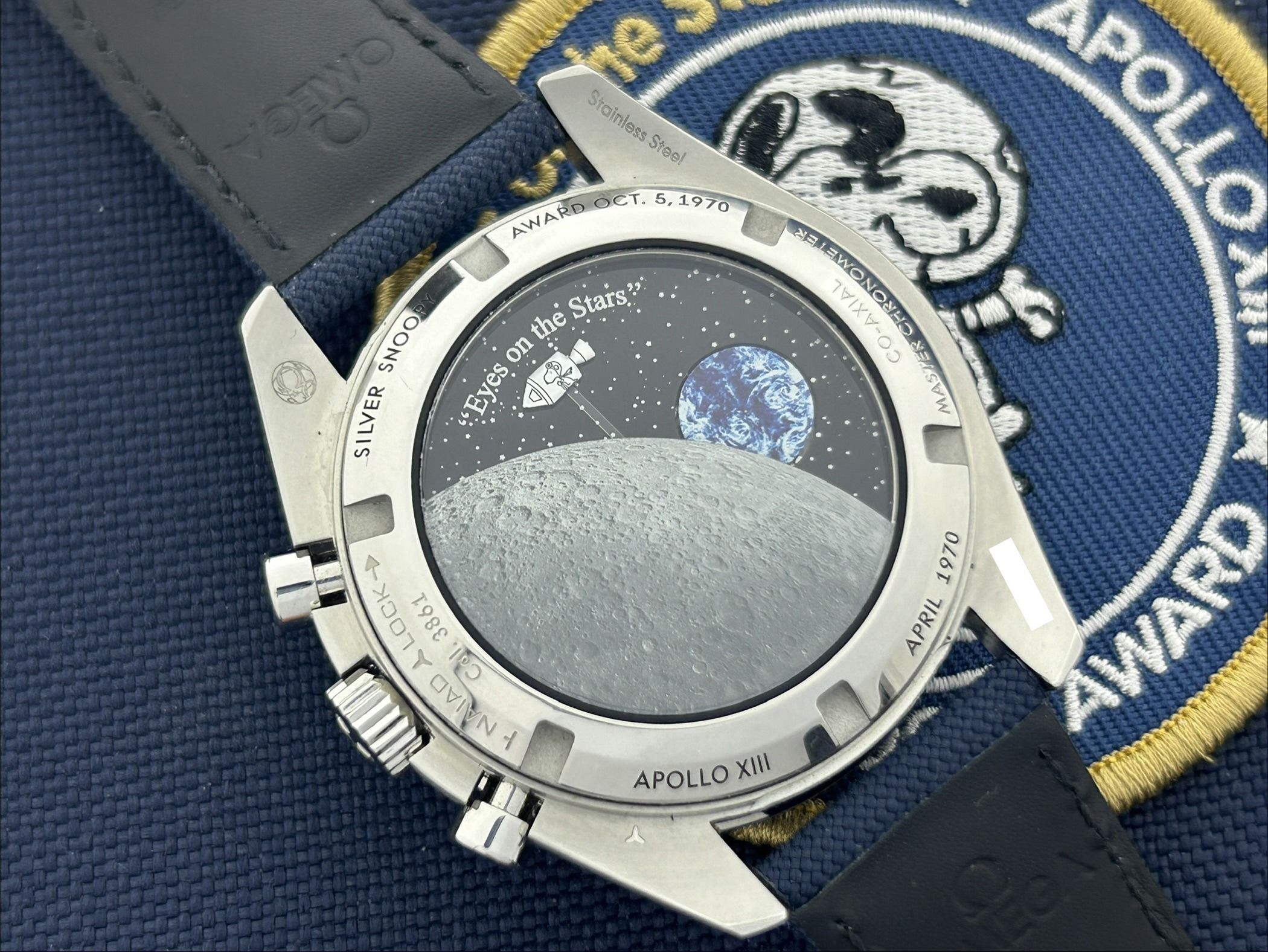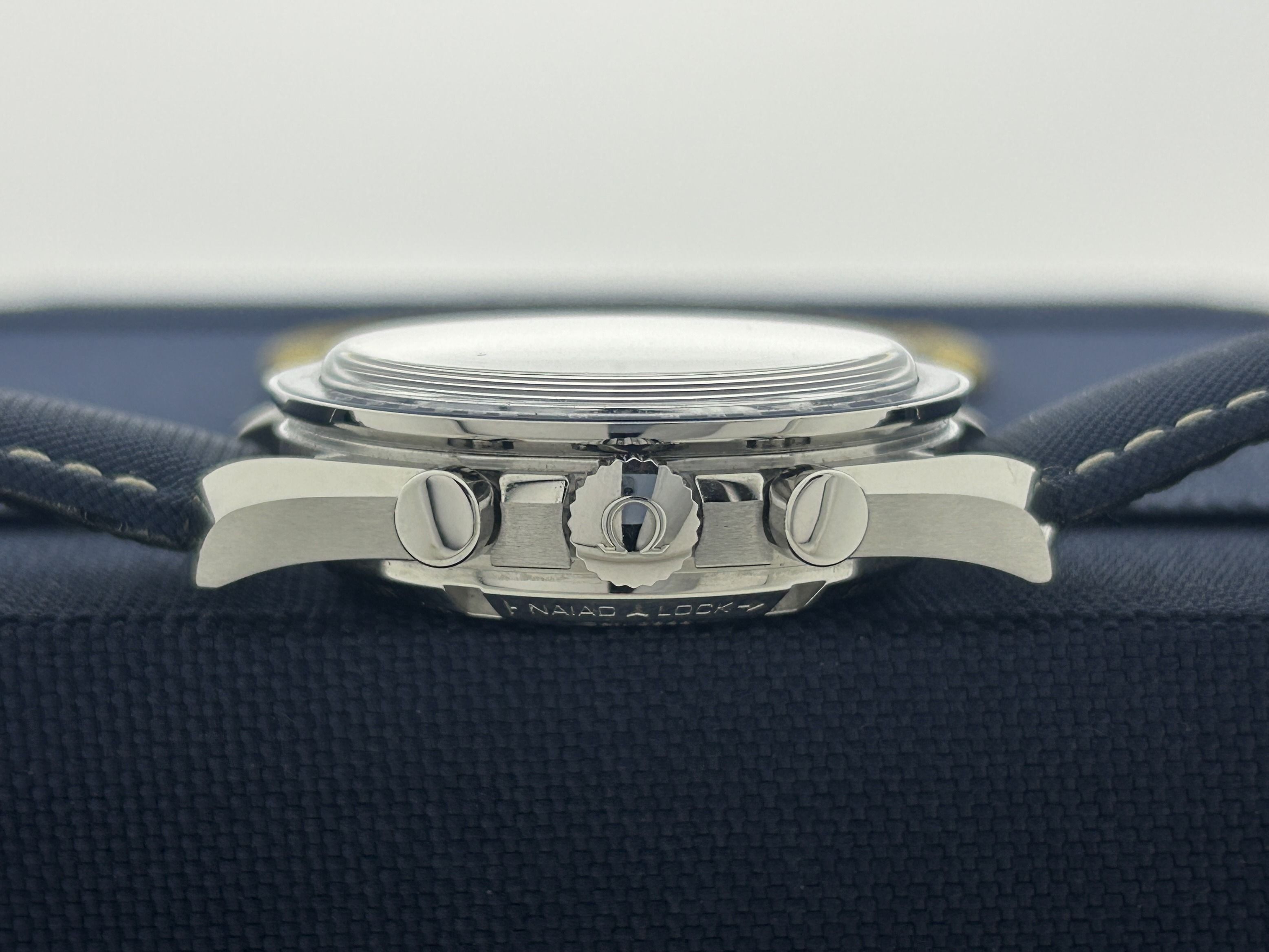 Un orologio Omega Speedmaster Silver Snoopy, rif. 310.32.42.50.02.001, fullset, del 2025. L'orologio ha una cassa in acciaio da 41 mm con un cinturino in nylon/tessuto blu. La traiettoria reale della missione Apollo 13 è rappresentata in rilievo all'interno del cinturino. L'Omega ha un quadrante in argento massiccio, contrassegnato con "Ag925" al centro del quadrante. L'orologio ha 3 sotto-quadranti, il sotto-quadrante sinistro presenta un Snoopy in argento in rilievo. Il retro della cassa mostra il lato nascosto della luna e sullo sfondo la Terra ruota in modo sincronizzato con l'indicatore dei secondi. Snoopy nel suo modulo di comando/servizio (CSM) decolla dalla luna utilizzando solo la funzione cronografo dell'orologio. L'Omega ha un movimento a carica manuale con funzione cronografo. L'orologio è del 2025 ed è completo della sua scatola originale e del certificato. Questo Snoopy conta pazientemente alla rovescia fino alla prossima missione!