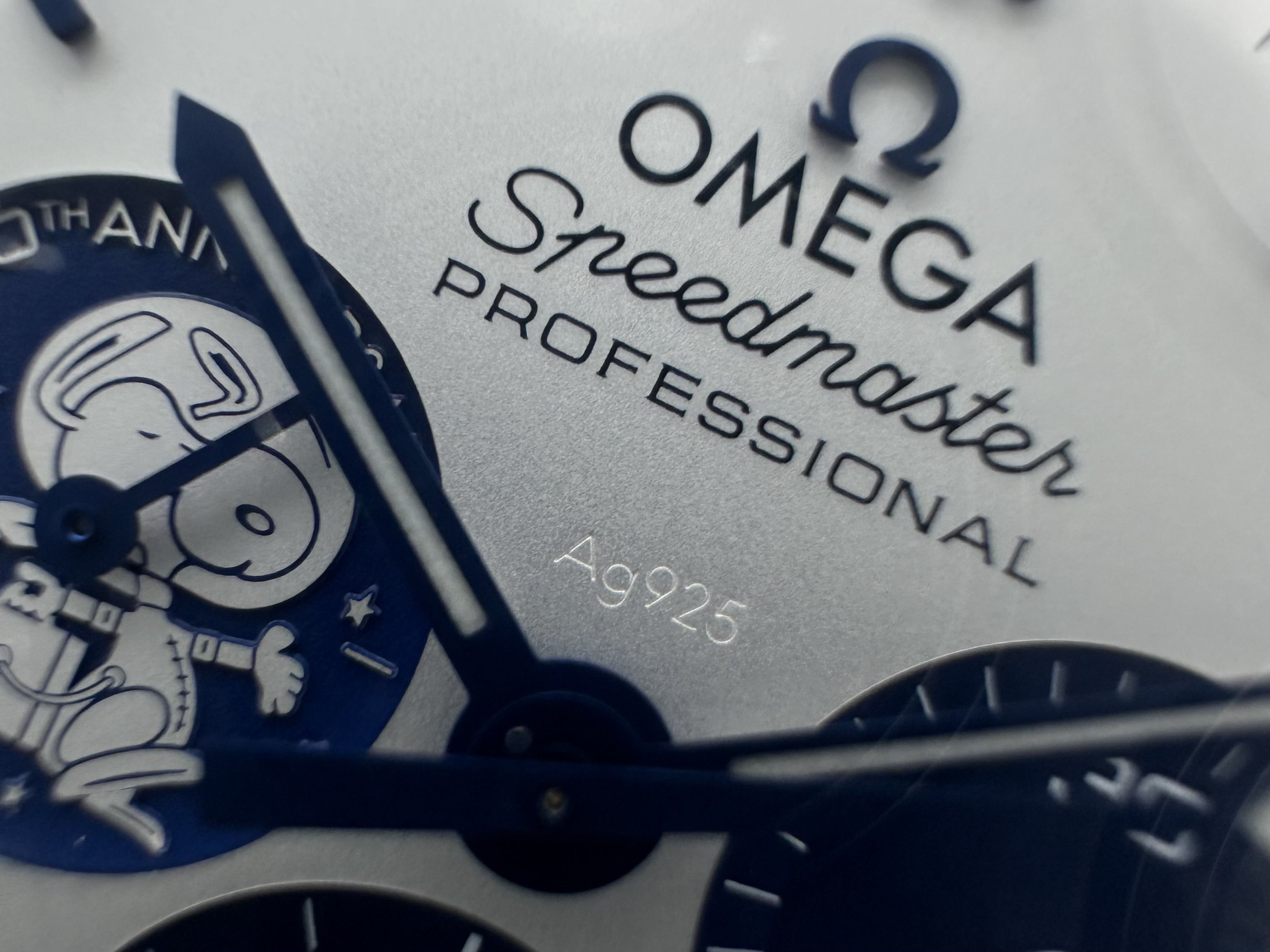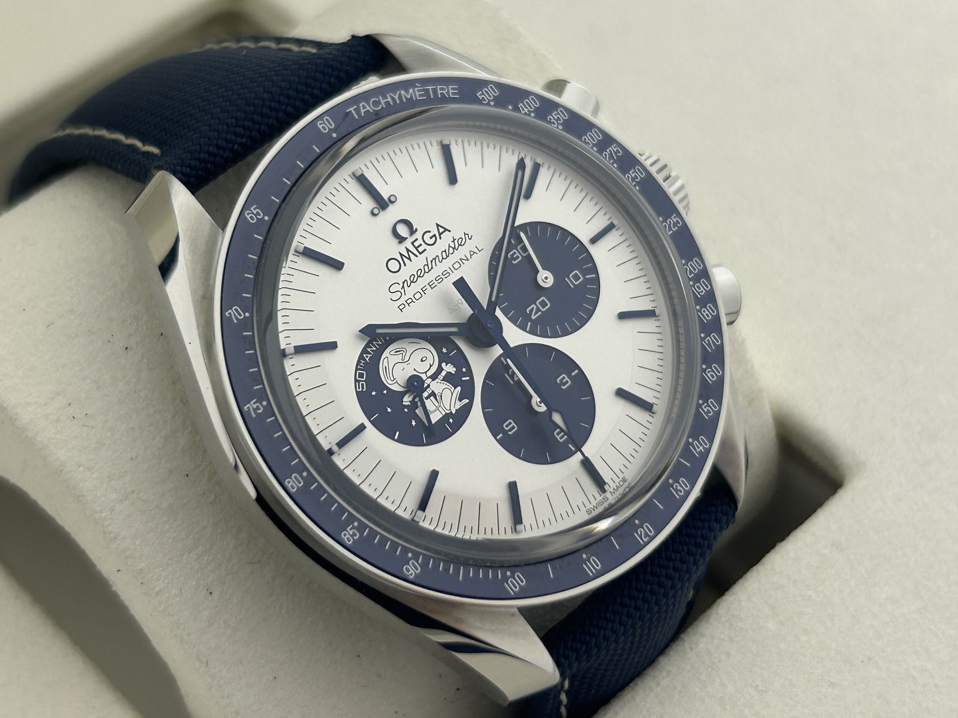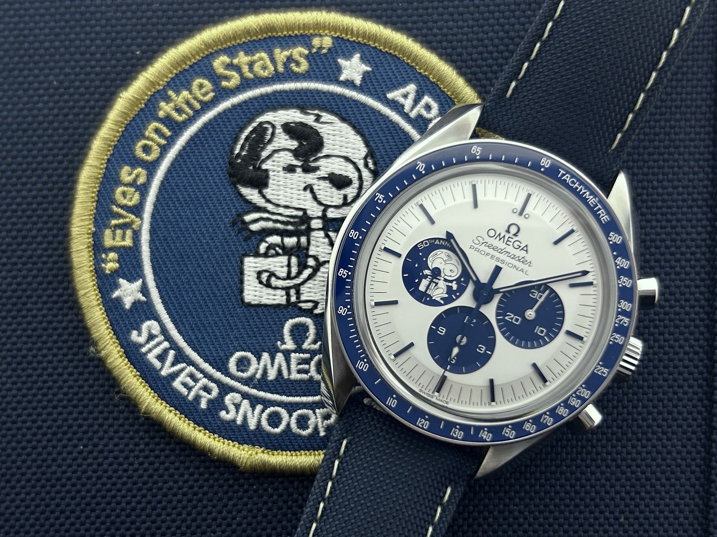 The Omega comes with the international Omega warranty.An Omega Speedmaster Silver Snoopy watch, ref. 310.32.42.50.02.001, fullset, from 2025. The watch has a 41mm steel case with a blue nylon/textile strap. The actual trajectory of the Apollo 13 mission is depicted in relief on the inside of the strap. The Omega has a solid silver dial, hallmarked with "Ag925" in the center of the dial. The watch has 3 subdials, the left subdial features a silver Snoopy in relief. The back of the case shows the actual far side of the moon and in the background the Earth rotates synchronously with the seconds indicator. Snoopy in his command/service module (CSM) takes off from the moon only by using the chronograph function on the watch. The Omega has a manual winding movement with a chronograph function. The watch is from 2025 and is complete with its original box and certificate. This Snoopy patiently counts down till the next mission!
