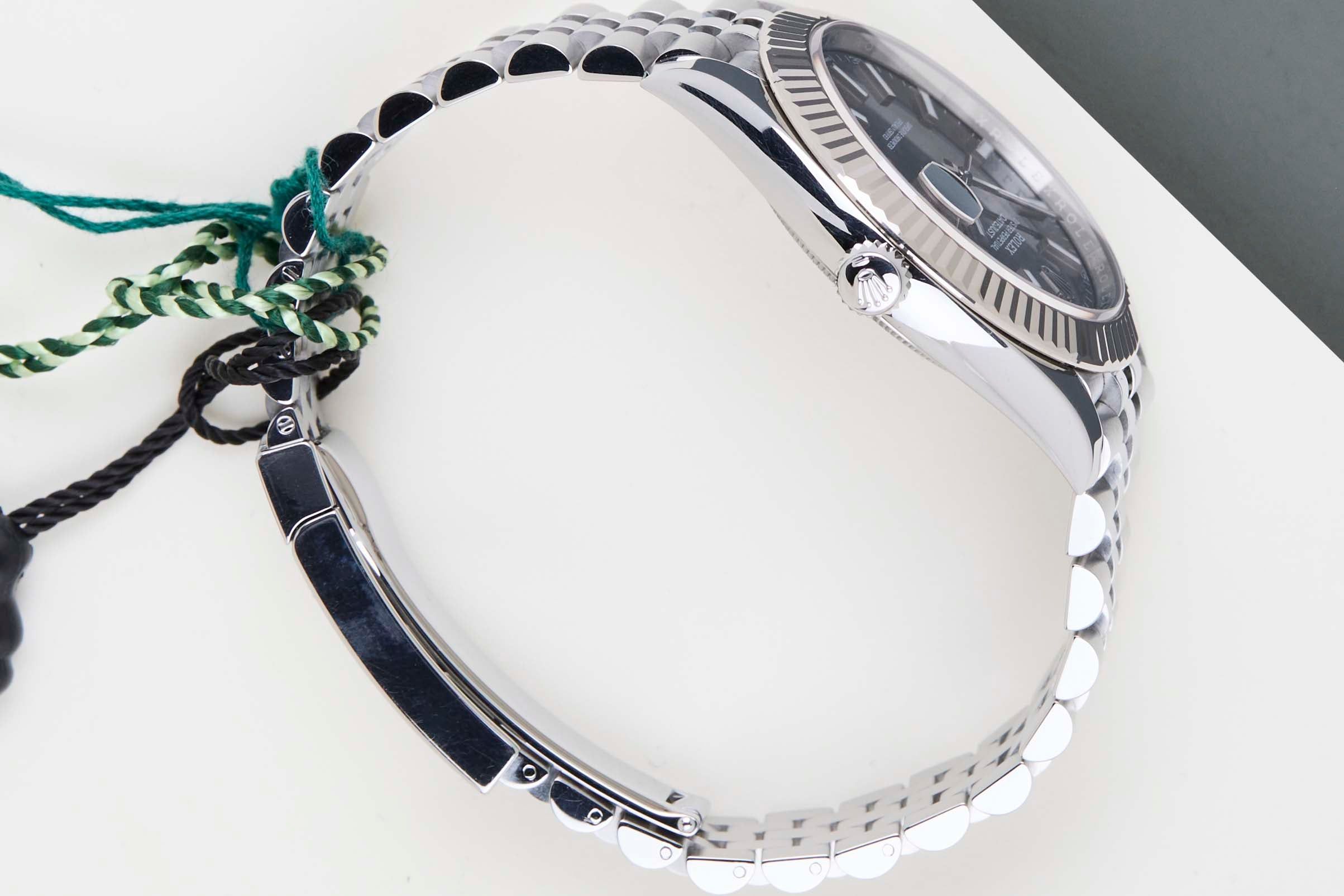 Full Set | International Rolex Warranty Until July 2028 | Including Rolex White TagRolex introduced the original Datejust in 1945 to celebrate the company's 40th anniversary. Due to the various case sizes and materials, the Datejust has been ingrained in Rolex's history and remains incredibly popular for 75 years.This Rolex Datejust 41 'Slate Dial - Jubilee' was sold for the first time in July 2023.This Datejust is made of a combination of 18k White Gold and stainless steel and is fitted with a Jubilee bracelet, which is equipped with the Easylink. This extension, allows the wearer to either extend or shorten the bracelet by 5 millimeters, improving the wearability and usability of the watch.This Rolex Datejust 41 is in Mint condition and comes with the original Rolex Warranty Card and box. Furthermore, the watch still has Worldwide Rolex Warranty until July 2028.