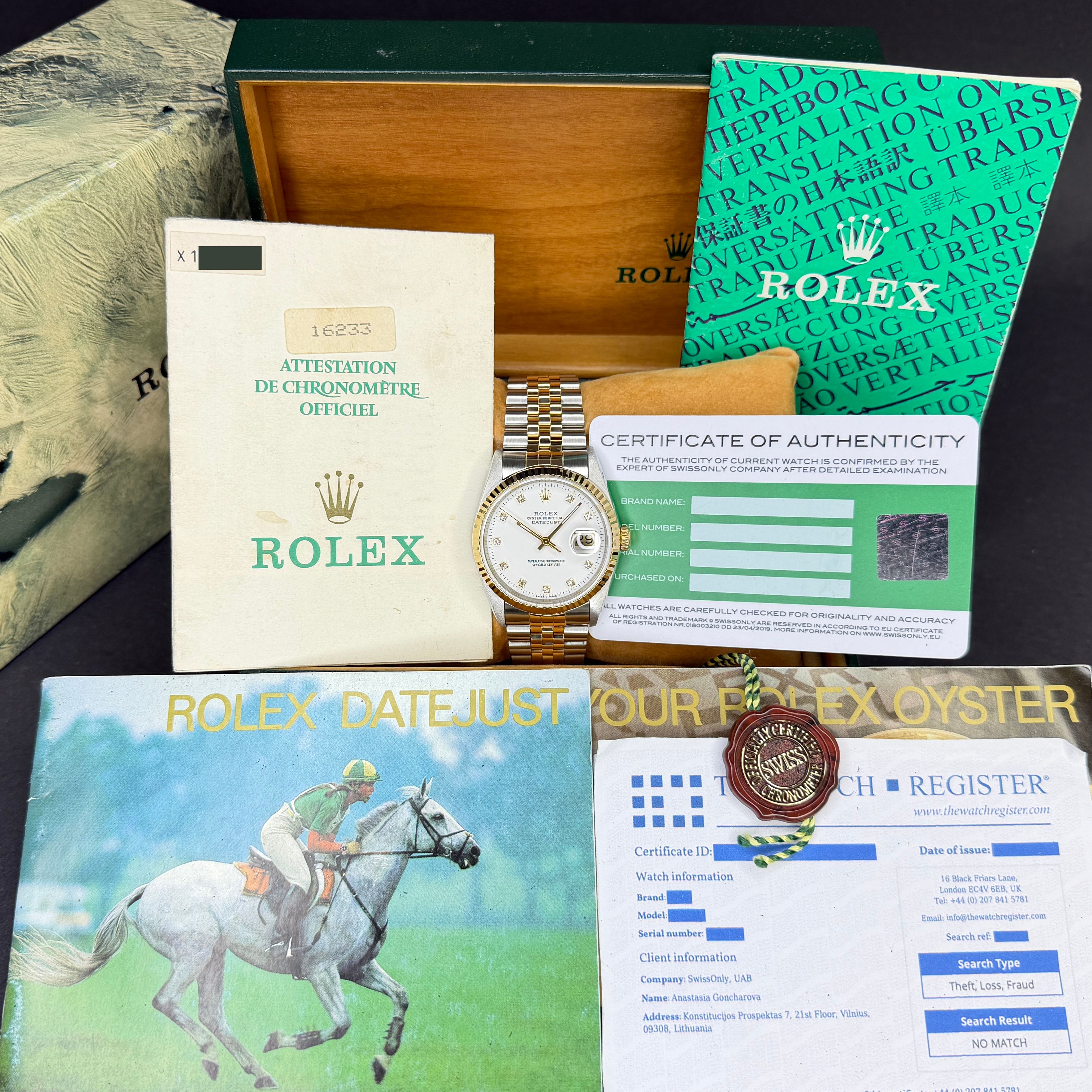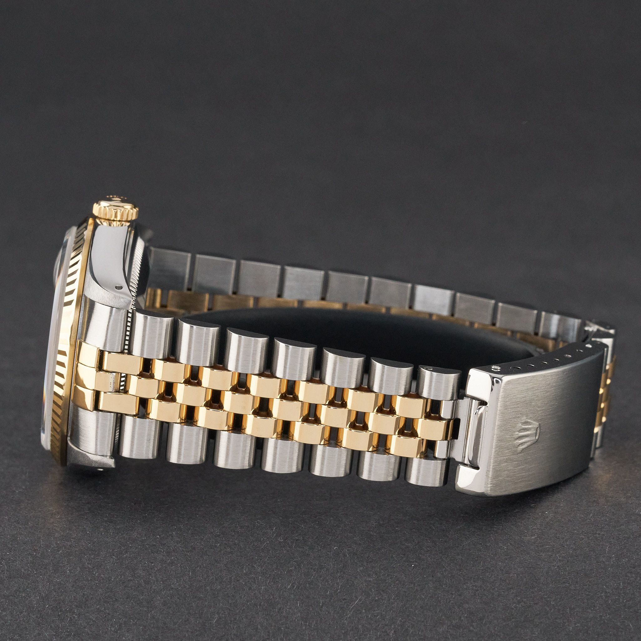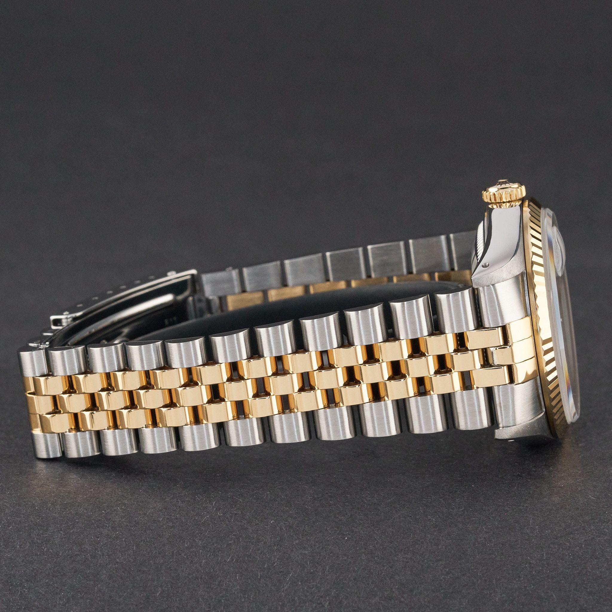 This Rolex Datejust 16233 features a White small diamond dial and is crafted from 18K yellow gold and stainless steel, with a production year of 1991.Case No: X16XXXX