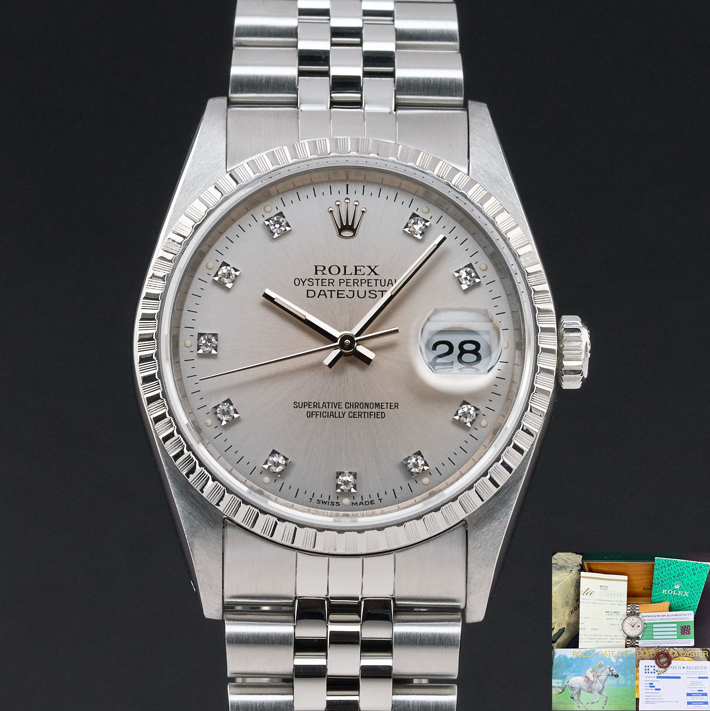 Rolex Datejust, 16220, 36mm, 1991, Steel, Silver Small Diamond dial, Fullset, 1y warranty