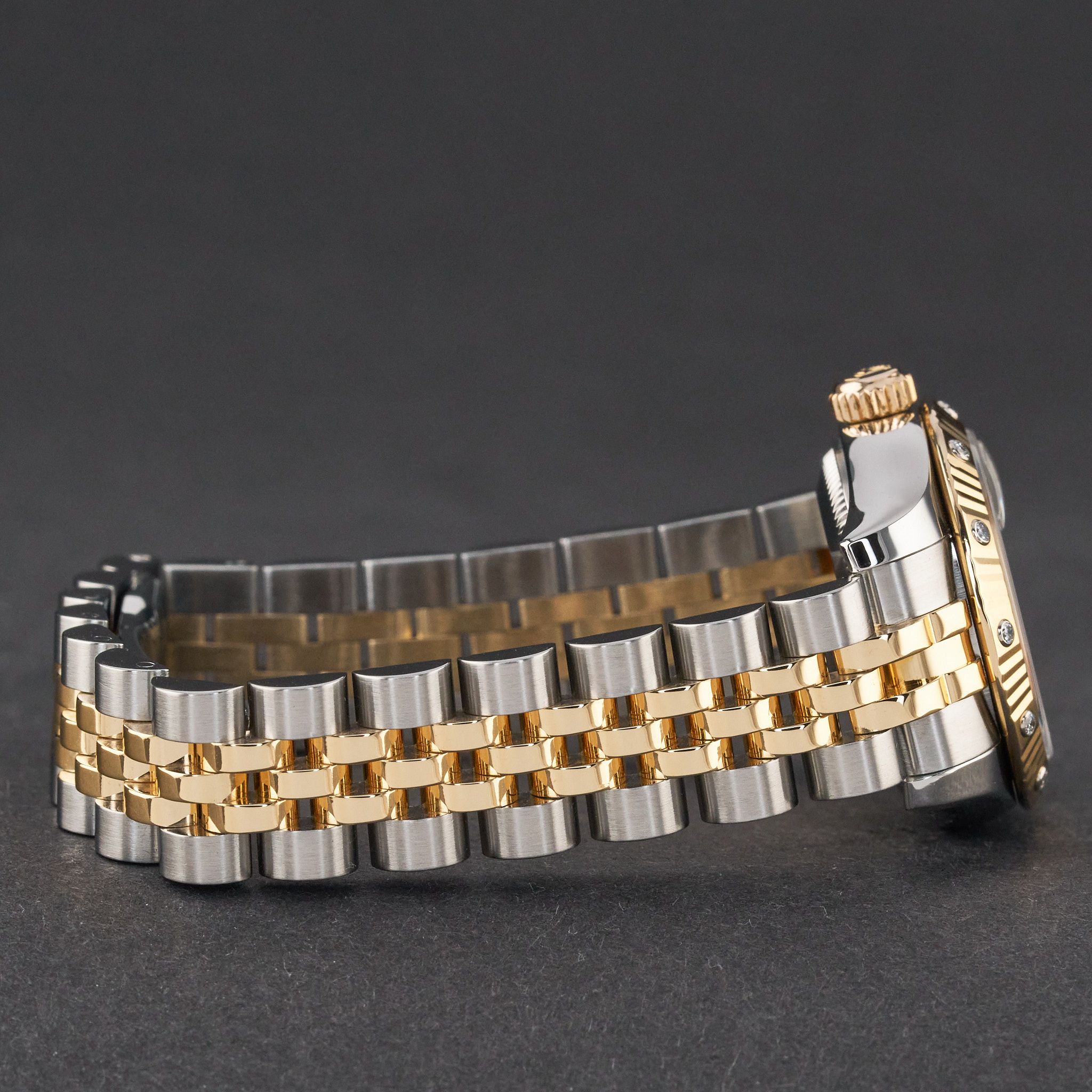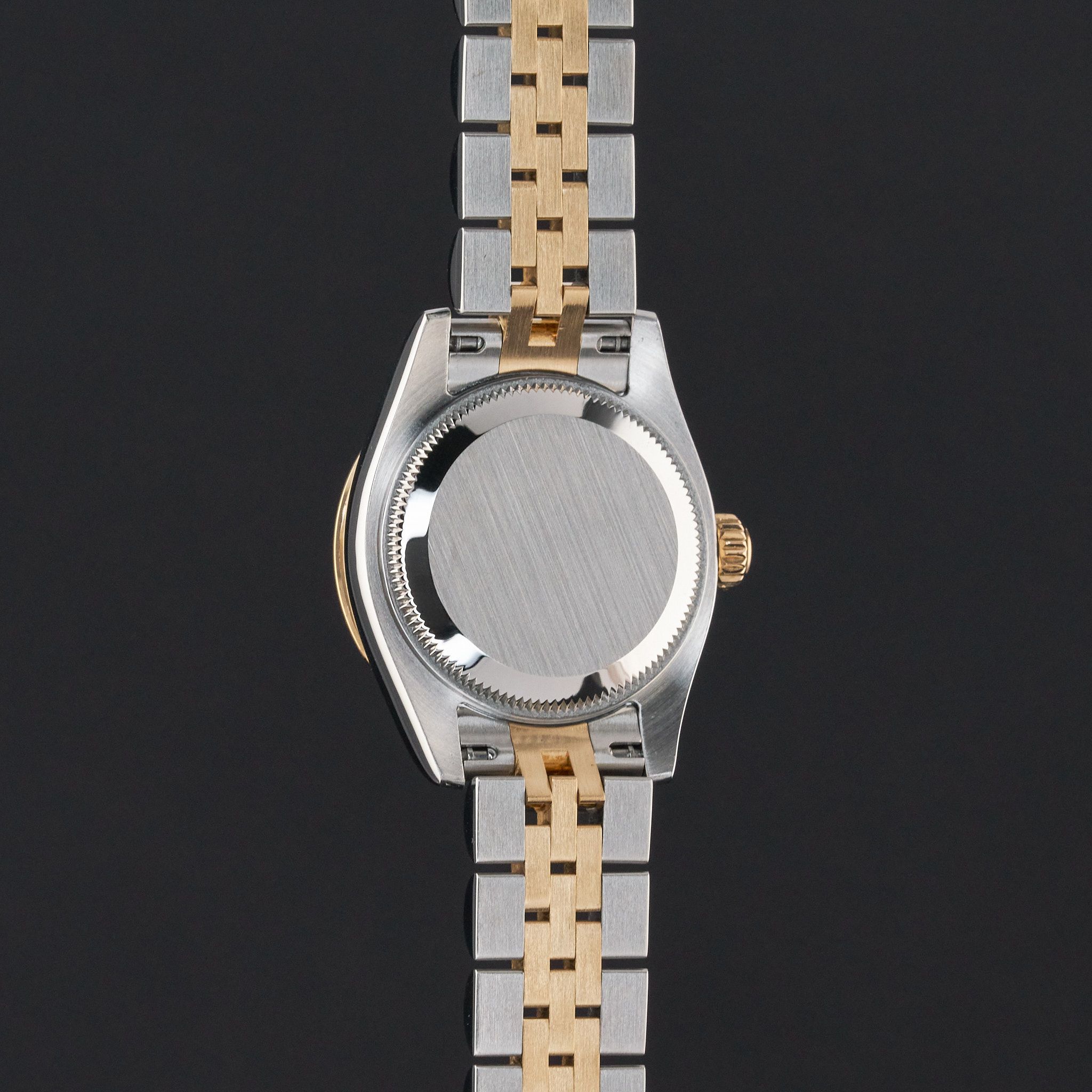 This Rolex Lady-Datejust 179313 features a Black sunbeam Roman dial and is crafted from 18K yellow gold and stainless steel, with a production year of 2006.Case No: D51XXXX