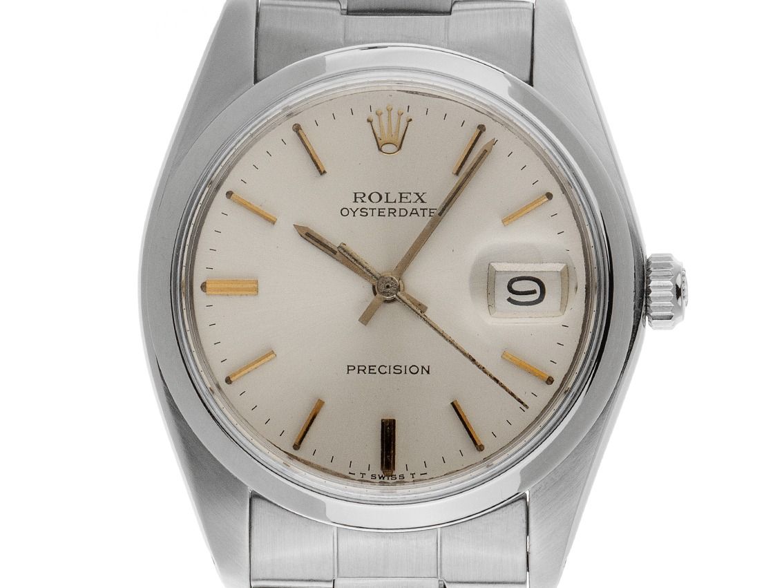 Rolex Oysterdate Precision Stahl Handaufzug Armband OysterGehäuse Edelstahl poliert und satiniert, Gehäusedurchmesser ohne Krone 35mm, Gehäusehöhe 11,7mm. Lünette Edelstahl glatt und poliert. Armband Oyster Edelstahl gefaltet, poliert und satiniert, Faltschließe Edelstahl mit Hersteller-Logo. Zifferblatt silberfarben mit aufgesetzten gelbgoldenen Indexen und gelbgoldenen Zeigern. Uhrwerk Handaufzug, Rolex Manufakturkaliber 1225 mit 17 Edelsteinen. Anzeige von Stunde, Minute und Sekunde über Zeiger aus der Mitte, Datumsanzeige unter Glaslupe bei 3 Uhr, open 6/9 (offene 6 und 9 in der Datumsanzeige). Plexiglas. Krone verschraubbar mit Hersteller-Logo. Boden Edelstahl verschraubt. Gewicht der Uhr inklusive Armband 66g, Länge des Armbandes inklusive Gehäuse 175mm. Referenznummer: 6694, Gehäusenummer: 3851XXX, Baujahr: 1975, ID: P249853000226H-6100, Artikelnummer: 10000084758. Mit Gangkontrolle und kompletter äußerlicher Aufarbeitung von März 2026. Original Rolex Box mit Umkarton und Beschreibung, Übersetzungsheft, Ledermäppchen, Tag, Rolex Chronometer-Siegel und Watchregister Auszug von Februar 2026, The Watch Register Zertifikat / ohne Eintrag (Internationale Datenbank für verlorene oder gestohlene Uhren). Superschnäppchen, Kapitalanlage mit Wertsteigerungspotential, fast nicht getragen. Sehr guter Zustand. Lieferzeit sofort.