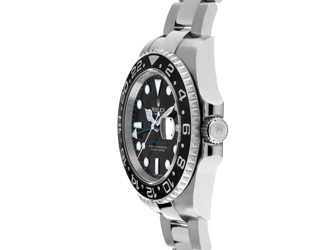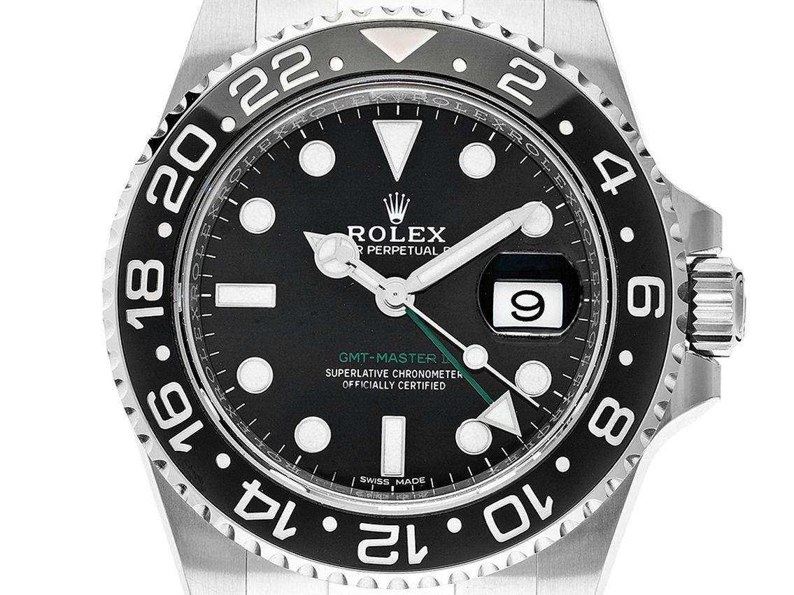 Cassa in acciaio lucido e satinato, diametro della cassa senza corona 40mm, altezza della cassa 12,0mm. Lunetta in acciaio zigrinato con inserto in ceramica nera a sfera, incisa con scala delle 24 ore, girevole su entrambi i lati. Bracciale Oyster in acciaio lucido e satinato, chiusura pieghevole di sicurezza in acciaio con logo del produttore. Quadrante nero con indici e punti in oro bianco applicati e lancette in oro bianco. Movimento automatico, cronometro con certificato, calibro Rolex 3186 con 31 rubini. Indicazione di ore, minuti e secondi tramite lancette centrali con fermo dei secondi per la regolazione precisa dell'ora, indicazione della data con regolazione rapida sotto lente di ingrandimento alle 3, seconda zona oraria (GMT) leggibile tramite lunetta, regolabile tramite lancetta verde centrale. Vetro zaffiro antigraffio. Corona a vite con protezione laterale e logo del produttore. Fondello in acciaio avvitato. Peso dell'orologio incluso il bracciale 151g, lunghezza del bracciale incluso la cassa 190mm. Numero di riferimento: 116710LN, numero di cassa: 45241XXX, ID: P2641190000326HW-15900, numero articolo: 10000085056. Con controllo del movimento e completa revisione esterna di marzo 2026. Scatola originale Rolex con imballaggio e documenti di garanzia di agosto 2019, LC 100 / Germania UE, oltre a descrizione, astuccio in pelle, sigillo del cronometro Rolex, estratto del registro di data e orologio di marzo 2026, certificato The Watch Register / senza registrazione (database internazionale per orologi smarriti o rubati), Full Set. Investimento con potenziale di apprezzamento, di prima mano, quasi non indossato. Come nuovo. Tempo di consegna immediato.