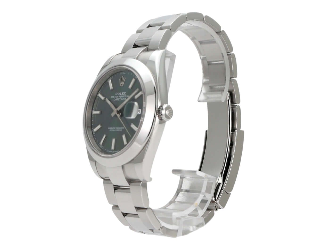 Rolex Datejust 41 Ref. 126300 Stainless Steel Mint Green Oyster BraceletCase made of polished and satin-finished stainless steel, case diameter 41 mm, polished stainless steel bezel, Oyster stainless steel bracelet polished and satin-finished with folding clasp, mint green dial with 18 kt white gold luminous indices, luminous hands, automatic movement, Rolex manufacture caliber 3235, chronometer, 70 hours power reserve, date display, scratch-resistant sapphire crystal, screw-down crown, screw-down stainless steel case back, water-resistant up to 10 bar.