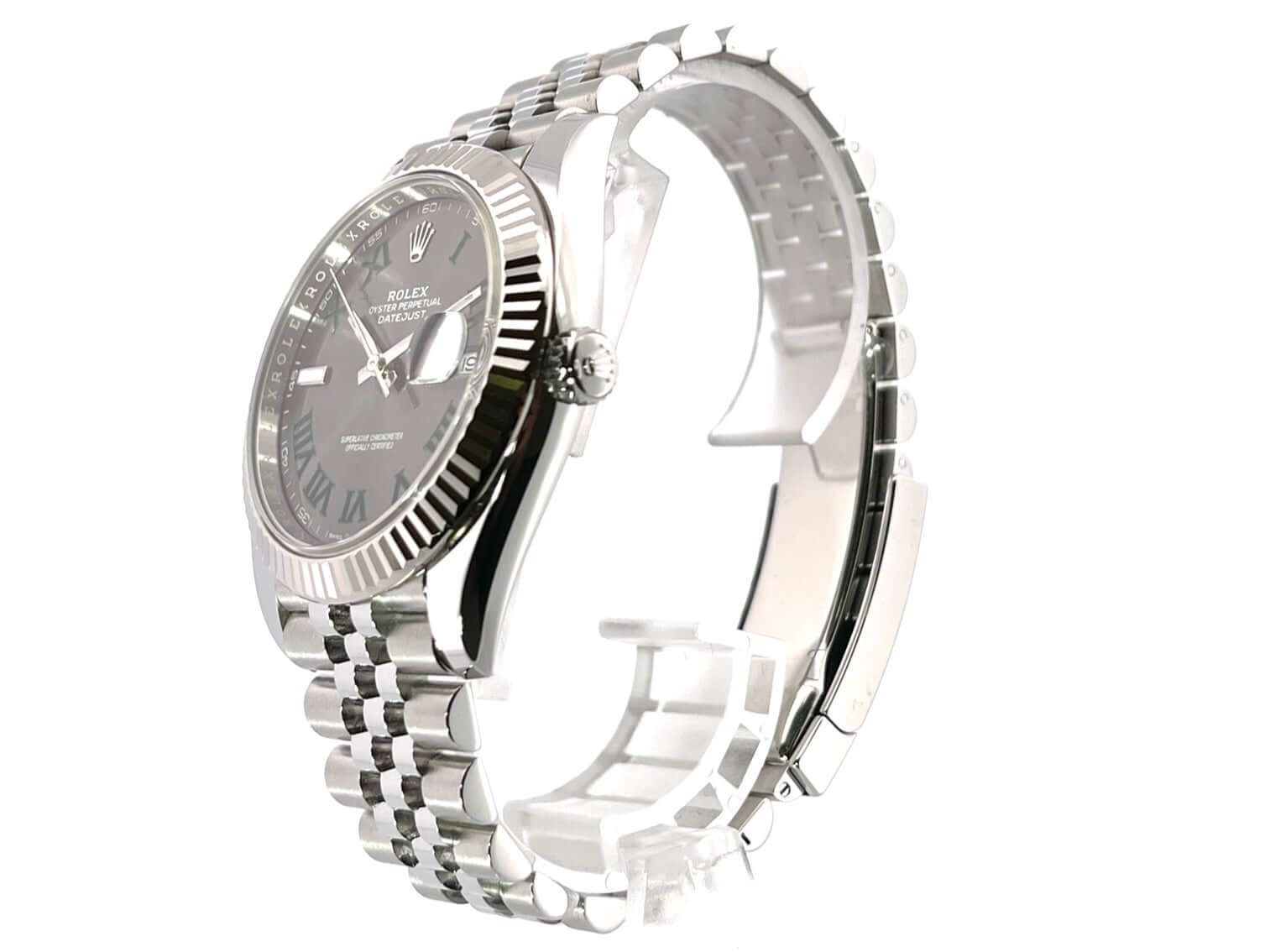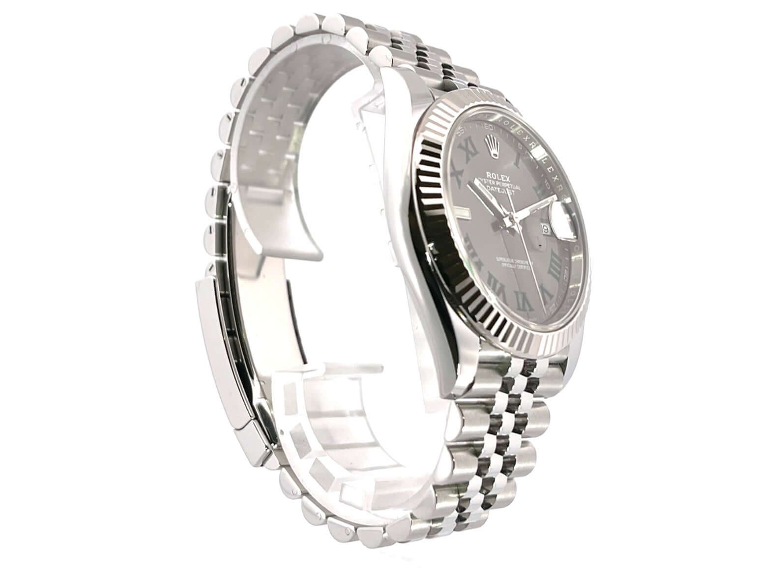 Rolex Datejust 41 Ref. 126334 Acciaio Inossidabile / Oro Bianco Cassa in acciaio inossidabile lucidato e satinato, diametro della cassa 41 mm, lunetta scanalata in oro bianco 18 kt, bracciale Jubile in acciaio inossidabile lucidato e satinato con chiusura pieghevole, quadrante in rodio con numeri romani, lancette luminescenti, movimento automatico, calibro Rolex 3235, cronometro, riserva di carica di 70 ore, indicazione della data, vetro zaffiro antigraffio, corona a vite, fondello in acciaio inossidabile a vite, impermeabile fino a 10 bar.