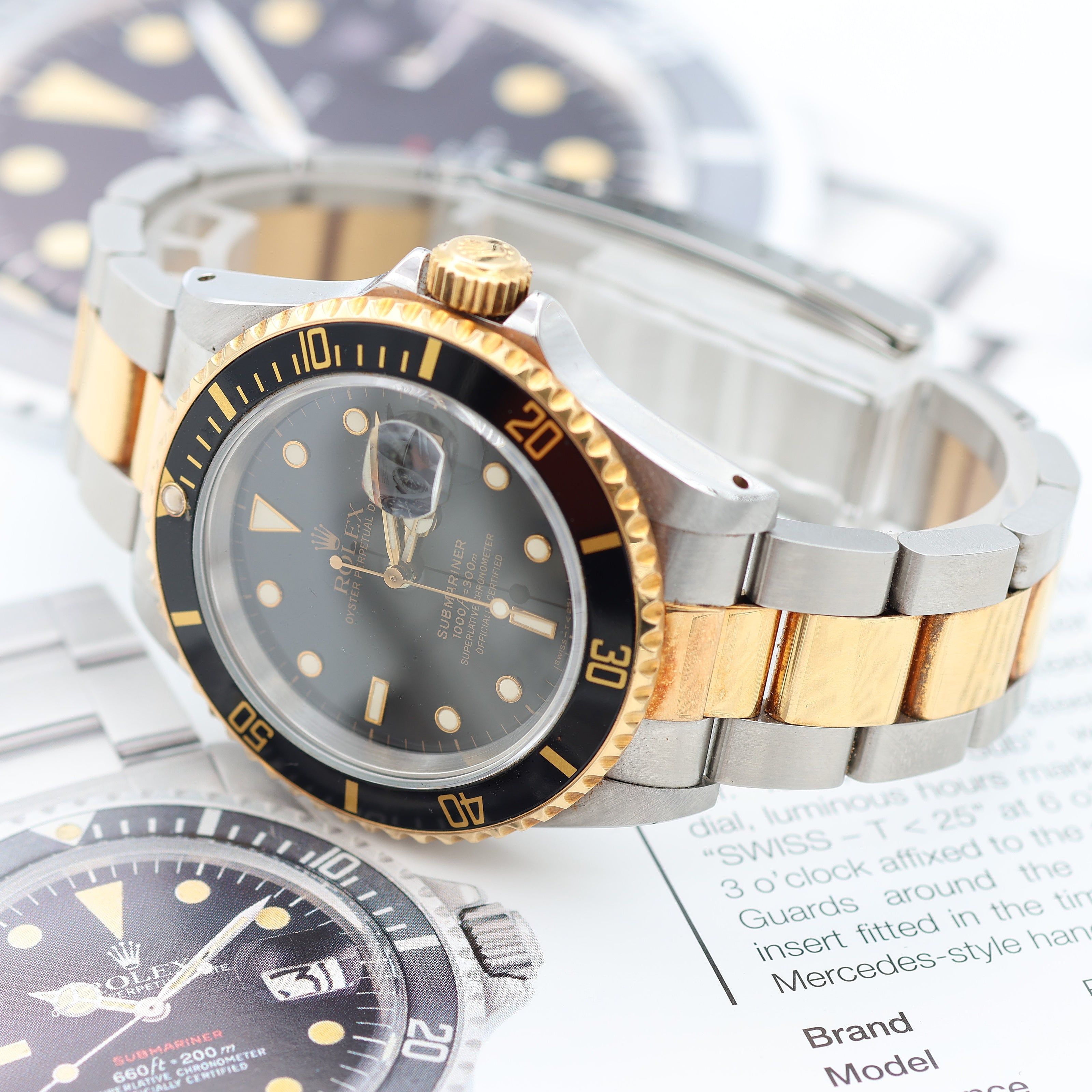 For sale at Debonar Watches: pre-owned Rolex Submariner Date 16613LN, full set. The Rolex Submariner Date 16613LN is a classic two-tone dive watch from the Rolex Submariner collection. Produced mainly from the late 1980s until around 2010, it combines stainless steel with 18-karat yellow gold and features the iconic black dial and black bezel. The watch has a 40 mm Oyster case with a yellow-gold unidirectional rotating bezel and a black dial with luminous hour markers for underwater visibility. The bracelet is the two-tone Oyster style, made from steel and yellow gold, giving it a sporty yet luxurious look.The Rolex 16613 stands as a testament to the brand’s commitment to innovation and luxury. Born from the legendary Rolex Submariner collection, this model marked a significant milestone in Rolex’s history. Inside is the automatic Rolex Calibre 3135 movement, known for reliability and chronometer-level accuracy. The watch includes a sapphire crystal with the Cyclops magnifier over the date and is water-resistant to 300 meters (30 ATM), reflecting its design as a professional diving watch. Overall, the 16613LN is recognized as one of the most iconic two-tone Submariners, combining the durability of a professional dive watch with the luxury look of steel and gold.The 16613 retains a vintage charm with its aluminum bezel insert and slightly thinner case profile, compared to the modern ref. 116613. The unidirectional rotatable bezel of the Rolex 16613 is both a functional diving tool and a design element. BRAND ROLEX MODEL SUBMARINER DATE REFERENCE 16613LN CASE MATERIAL STEEL/GOLD MOVEMENT AUTOMATIC DIMENSION 40 MM DIAL BLACK BEZEL ALUMINIUM/YELLOW GOLD CRYSTAL SAPPHIRE BRACELET TYPE & Lenght OYSTER BRACELET 18 CM BRACELET MATERIAL STEEL/GOLD ORIGINAL BOX YES ORIGINAL PAPERS YES YEAR 1989 CONDITION VERY GOOD