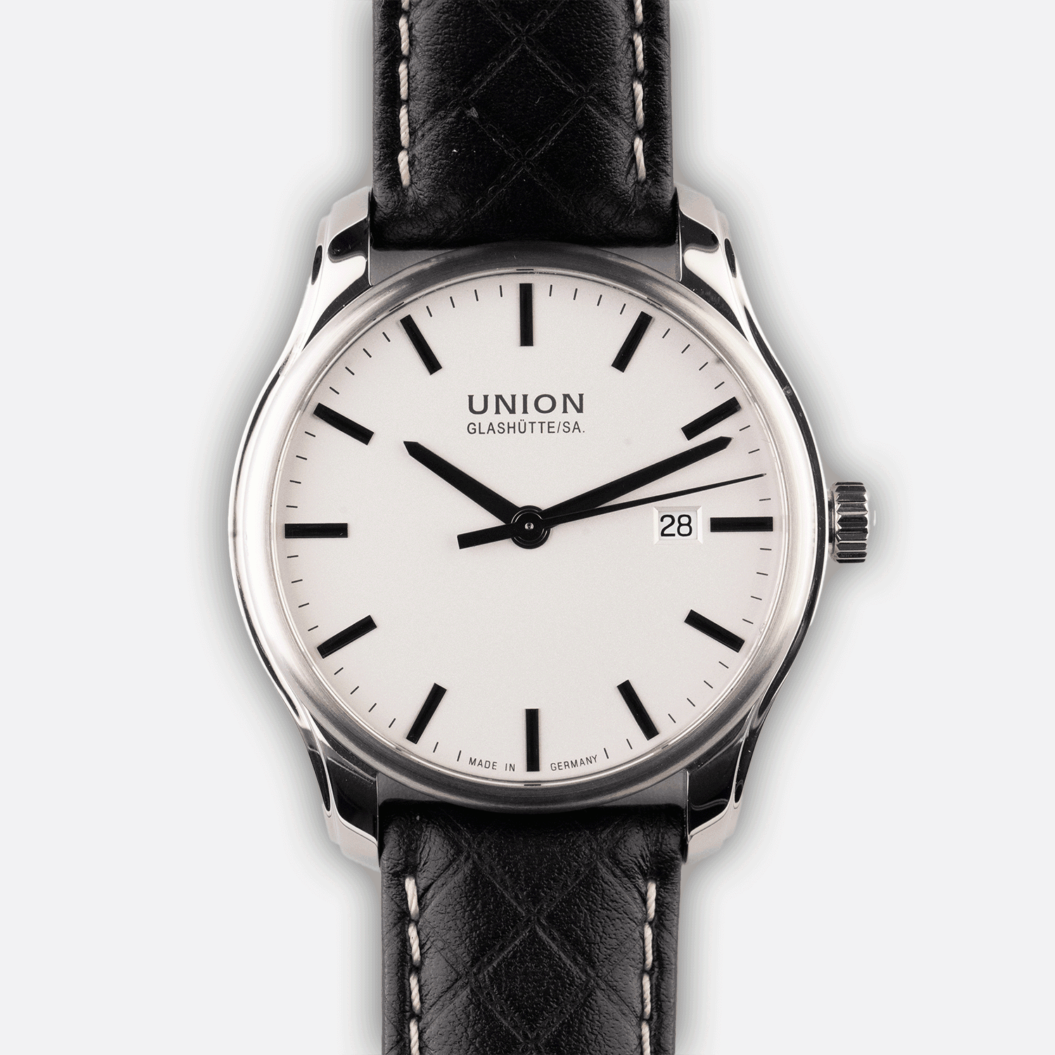Un orologio da dress a un rapporto qualità-prezzo imbattibile: fibbia pieghevole, fondo in vetro e movimento automatico. Questo Union Glashütte viene fornito con un bracciale originale Union mai indossato con cuciture a contrasto.