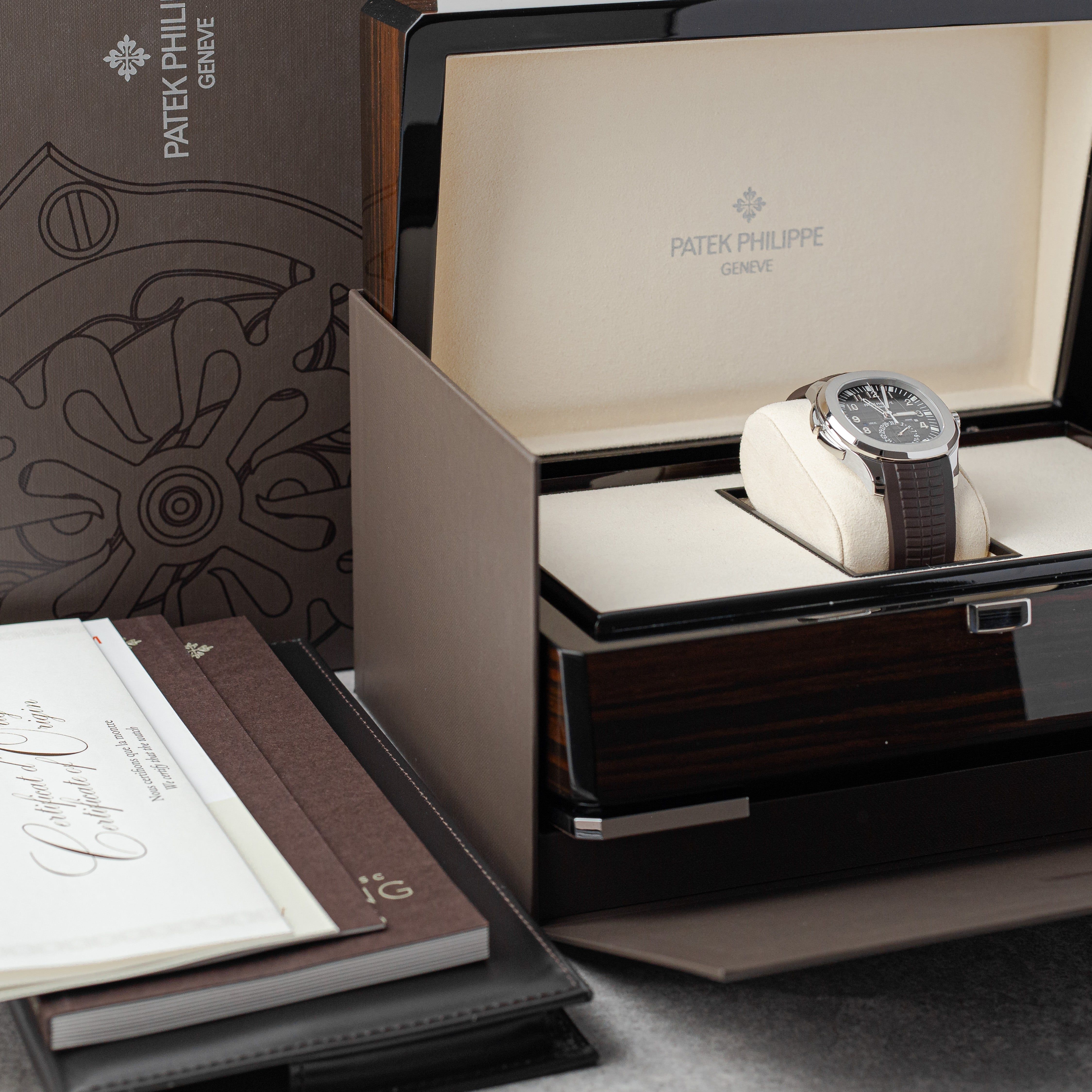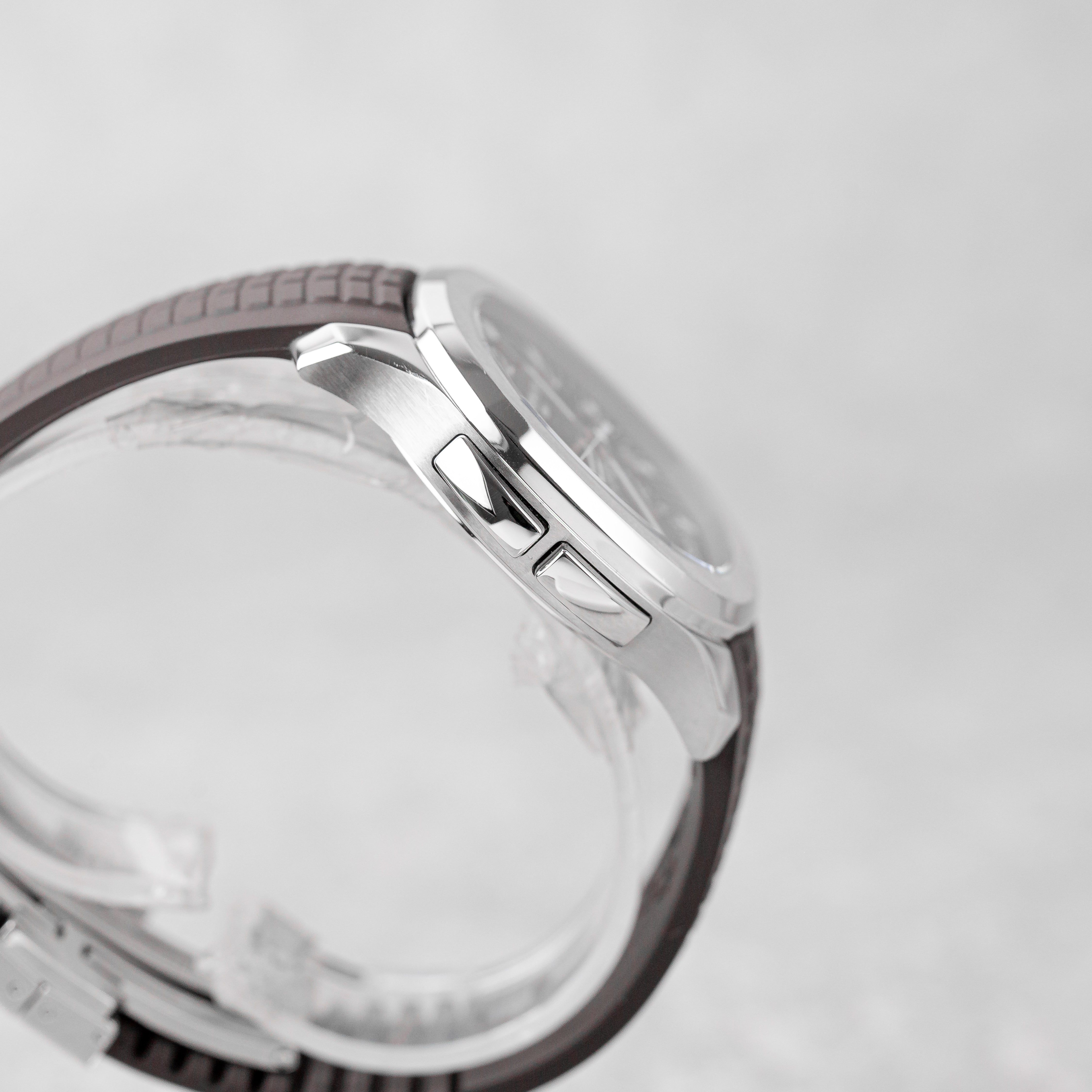 A highly sought-after travel watch, this Patek Philippe Aquanaut Travel Time combines sporty elegance with the practical dual-time complication. This example from 2019, originally sold in Portugal, comes as a Full Set and is presented in perfect condition. The case remains unpolished, while the clasp has received a light professional polish. The watch includes two original Patek Philippe rubber straps: a brown strap that has been cut and used, and an additional brand-new black strap. Fully inspected and running perfectly, it is offered with 12 months of guarantee from us—a superb opportunity to acquire one of the most desirable modern Patek Philippe models