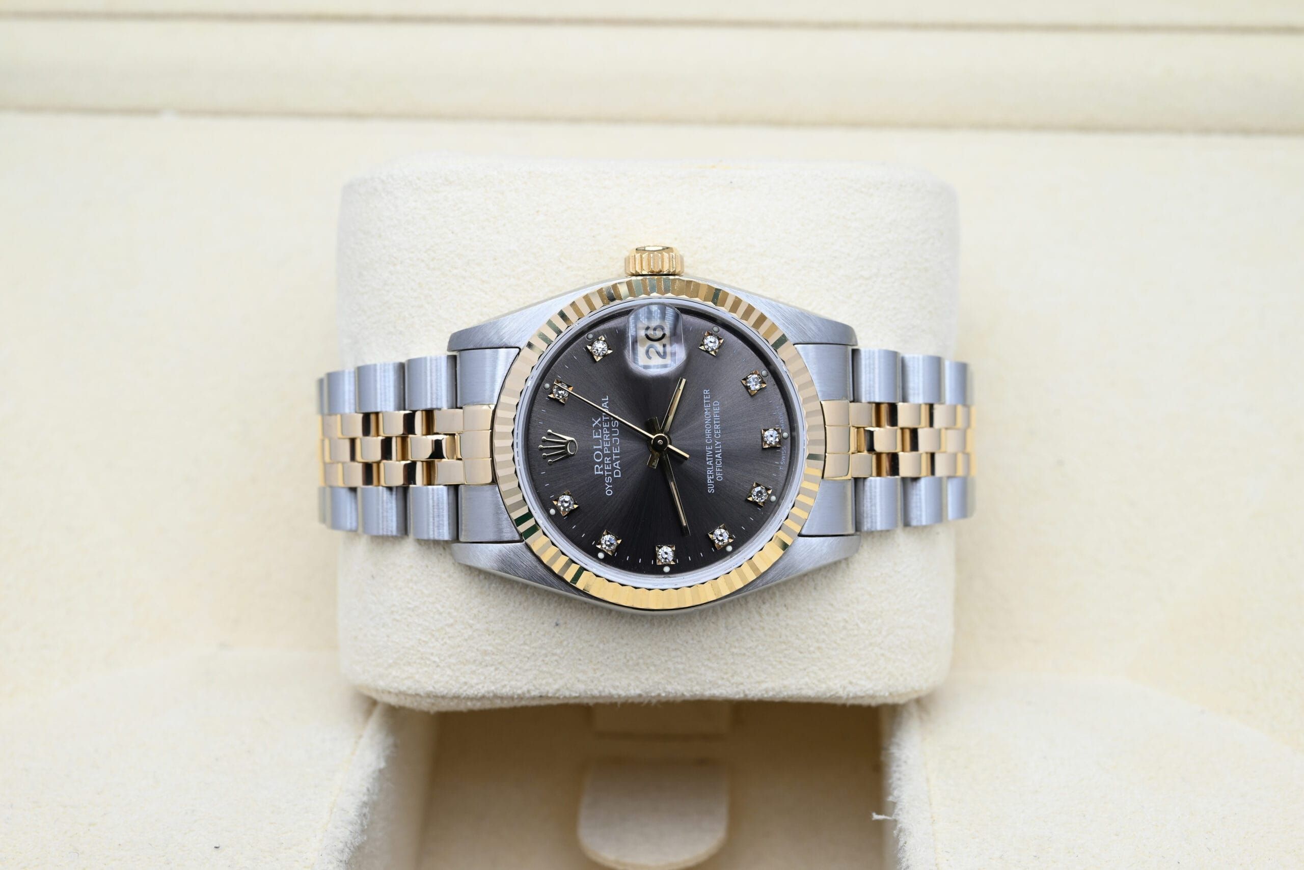 Rolex Datejust Ref. 68273 from 1991 with the grey diamond dial in excellent condition, including the original box and papers.All of our watches have been thoroughly checked by our own watchmaker and serviced when needed.