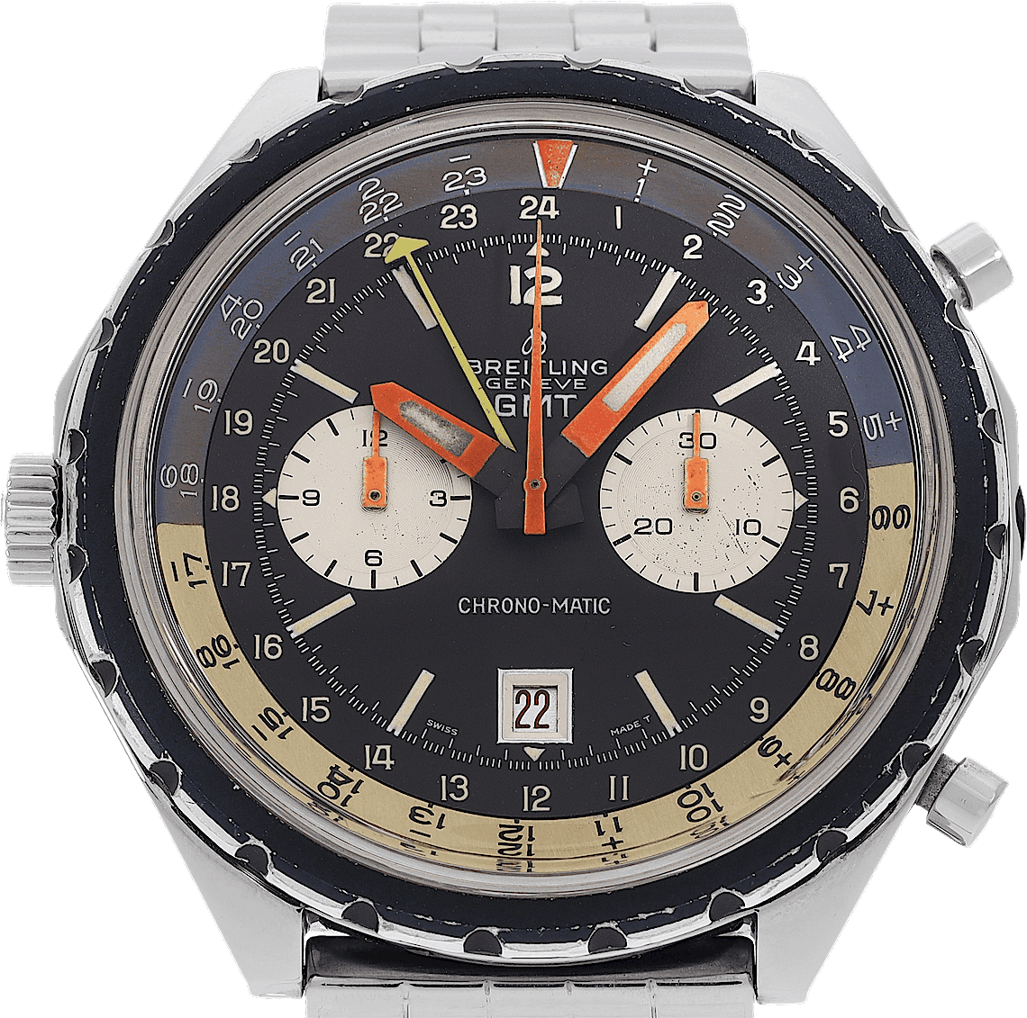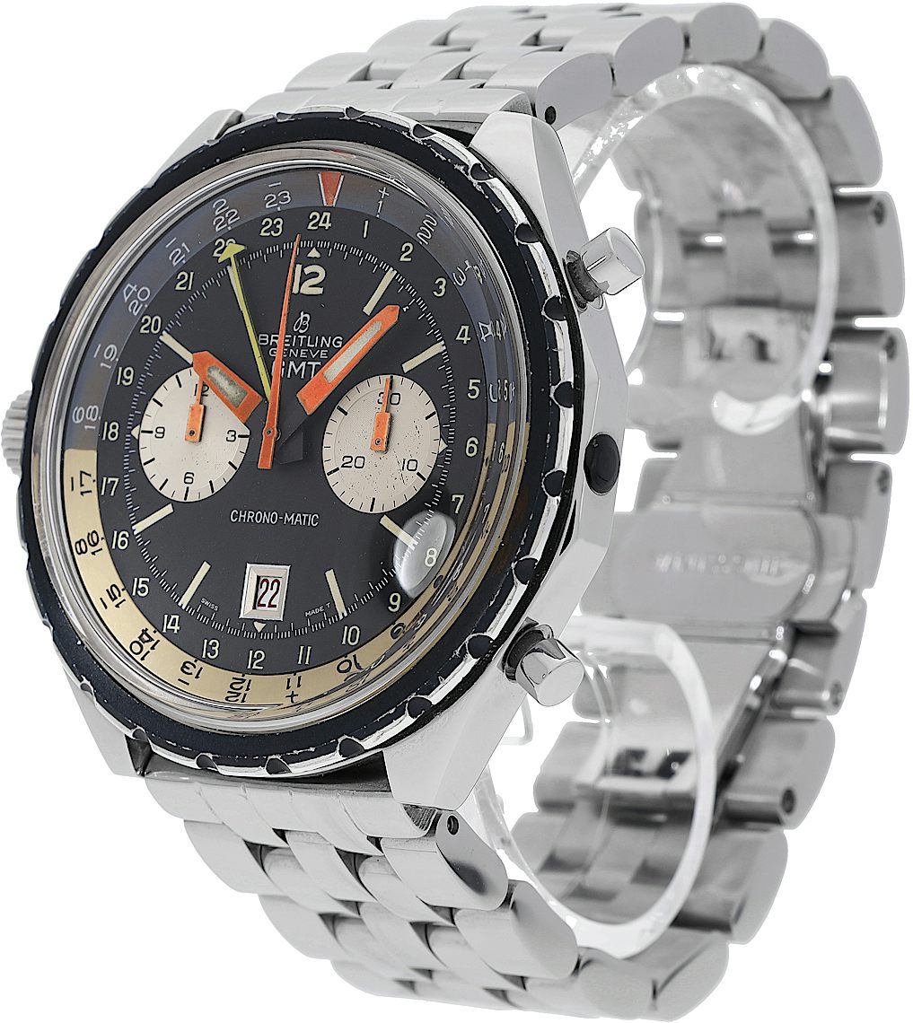 Breitling Chrono-Matic GMT, Riferimento: 2115, Genere: Maschile, Dimensione: 47mm, Colore del quadrante: Nero, Materiale del cinturino: Acciaio Inossidabile, Movimento: Carica Manuale, Condizioni: Orologio usato in condizioni originali. È stato ispezionato, regolato e autenticato da orologiai certificati CHRONEXT., Documenti: Certificato Chronext