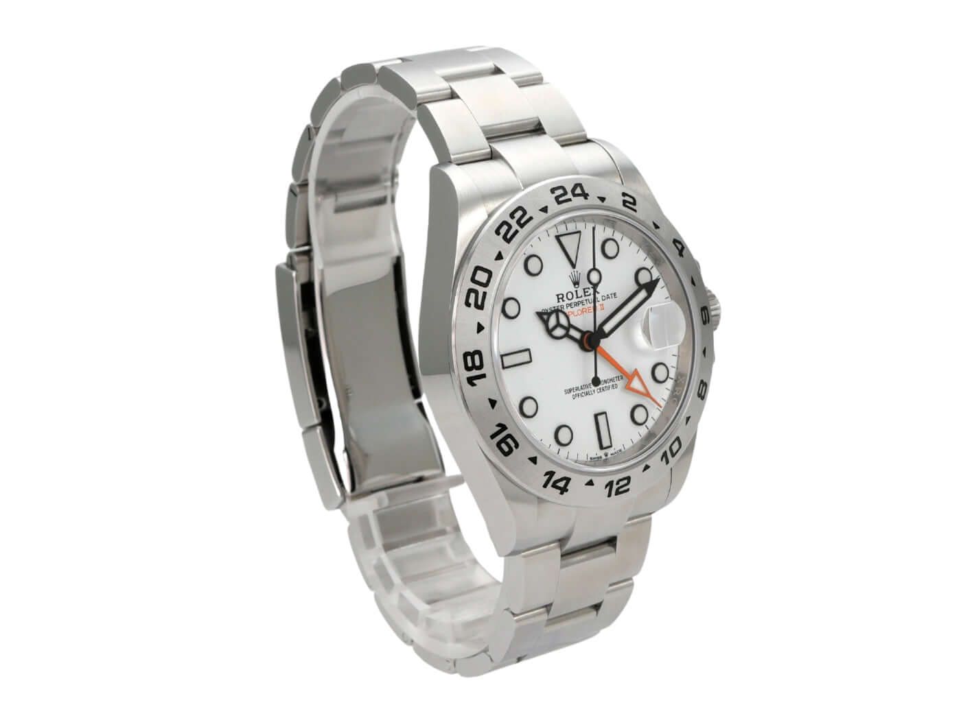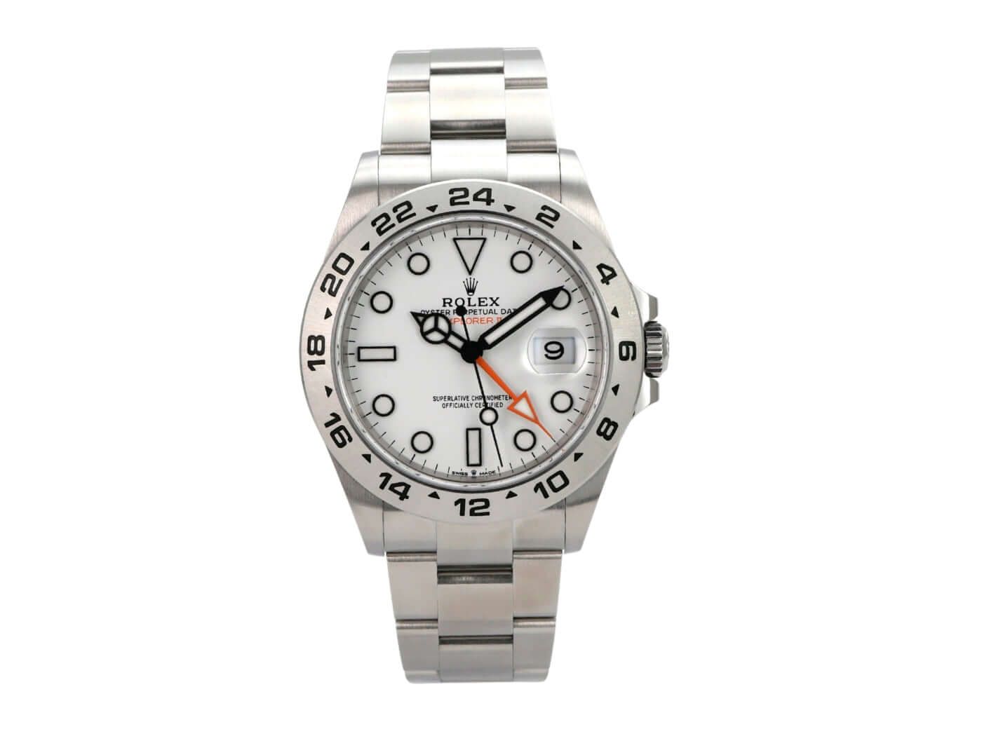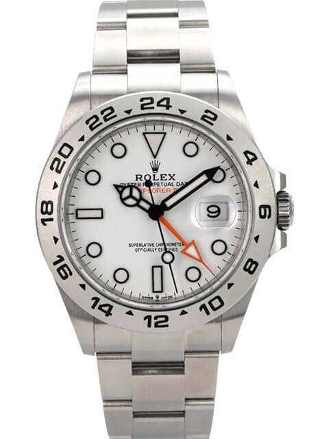 Rolex Explorer II 42 Stainless Steel Ref. 226570 White from 2022Case made of polished and satin-finished stainless steel, case diameter 42 mm, case height 12.5 mm, satin-finished stainless steel bezel with 24-hour scale, satin-finished Oyster stainless steel bracelet with safety folding clasp, white dial with applied luminous indices and luminous dots, luminous hands, automatic movement, Rolex manufacture caliber 3285 with 31 jewels, 28,800 vibrations per hour, 70-hour power reserve, date display, second time zone, chronometer, sapphire crystal, screw-down crown with crown guards, screw-down stainless steel case back, water-resistant up to 10 bar.