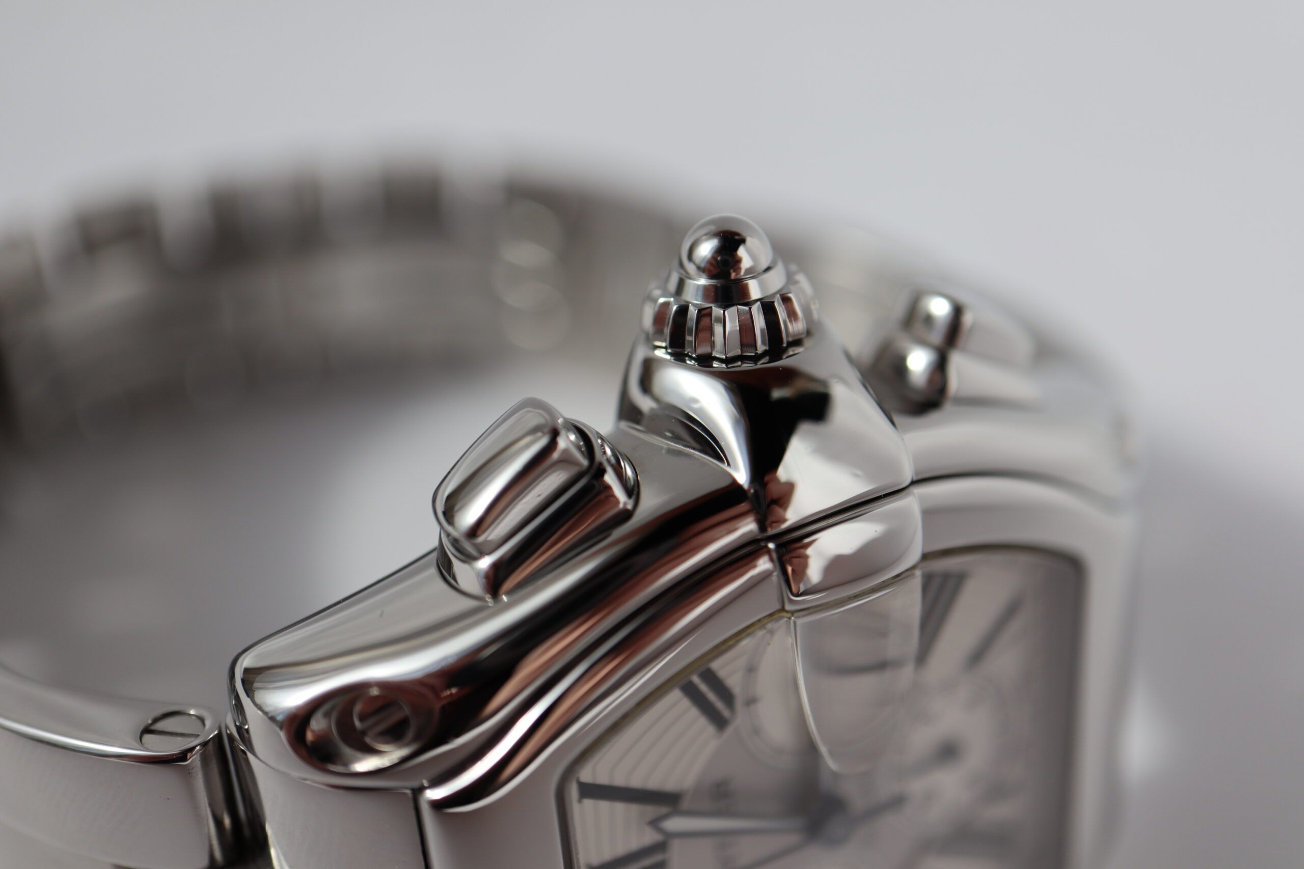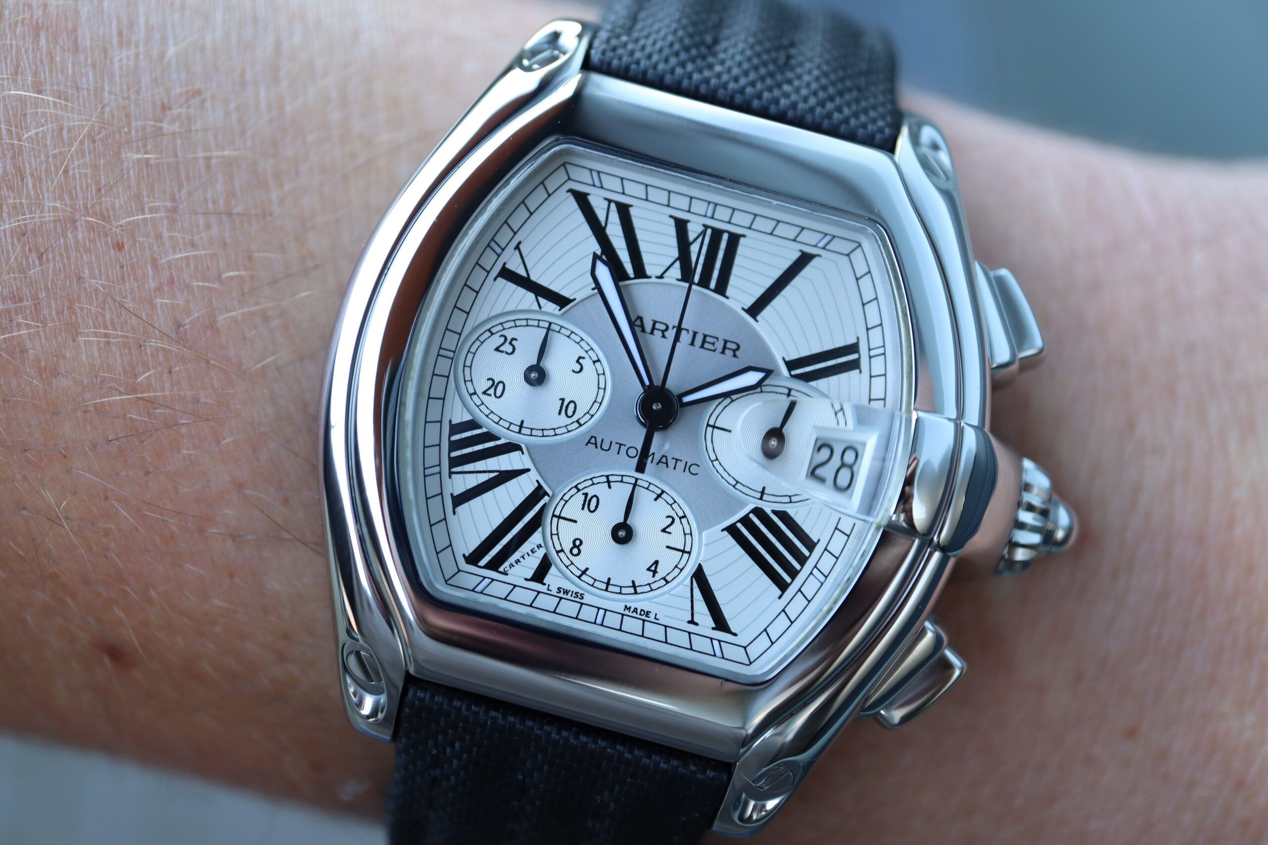 The Cartier Roadster has an iconic look of a tonneau-shaped case (tonneau means “barrel” in French), a shape that was used by Cartier around 1906. It was inspired by sports cars from the 1960s. It became a popular sport and dress watch.