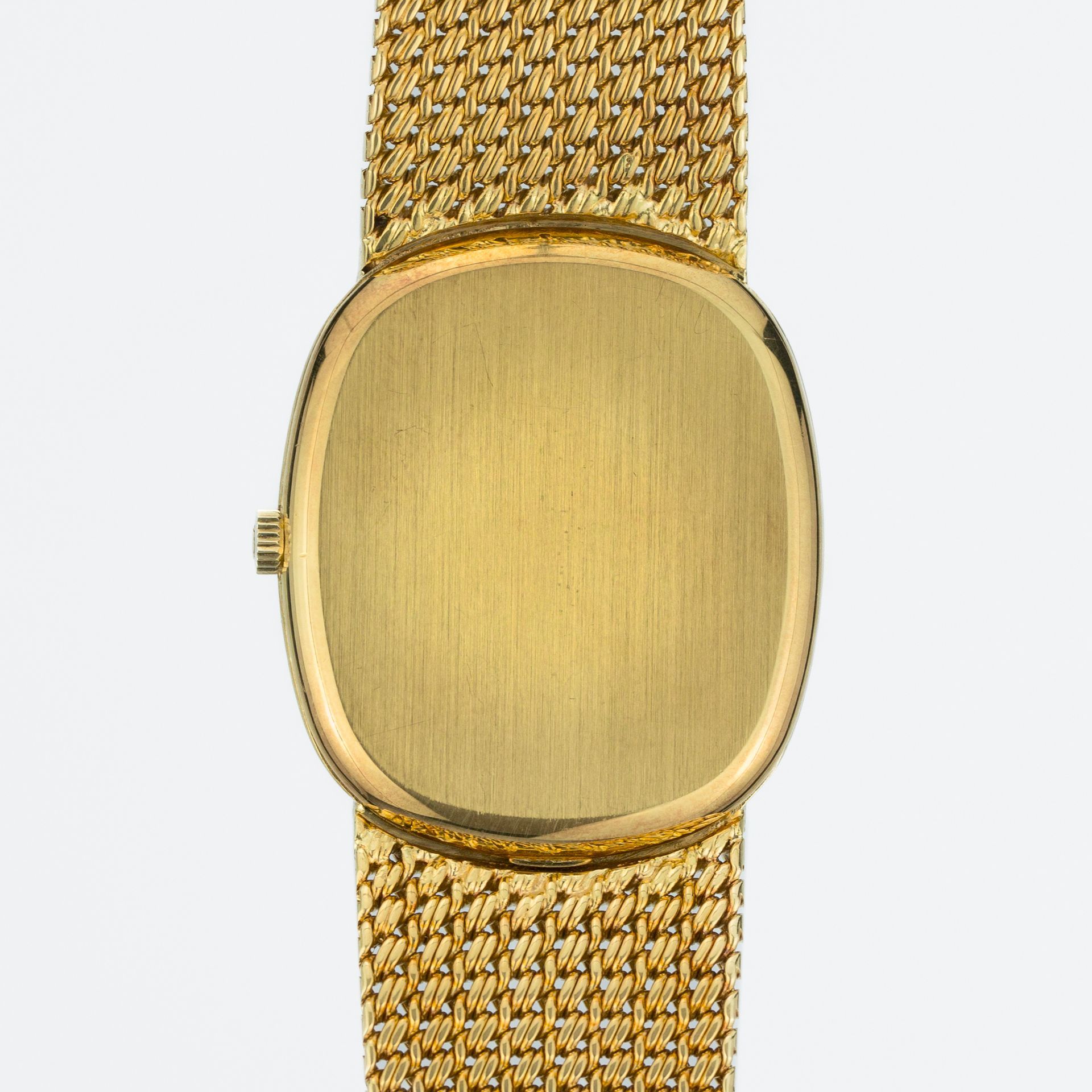 This distinctive Omega De Ville demonstrates the refined elegance of Swiss watchmaking from the late 1970s to the early 1980s with its sophisticated oval case design. The solid 18-karat yellow gold case measuring 33 mm x 39 mm houses the reliable automatic Caliber 1002 movement, ensuring Swiss precision in a beautiful, compact form. The matte gold dial creates a subtle texture that beautifully catches the light, while the date window at 3 o'clock adds practical functionality. The integrated 18-karat yellow gold woven bracelet flows seamlessly from the case, creating a continuous line of precious metal that embodies the bold aesthetic of the era. The smooth polished bezel perfectly frames the dial, and the acrylic crystal preserves the era's authenticity. This De Ville represents Omega's mastery in designing elegant timepieces during one of the most stylish decades in watchmaking, combining Swiss mechanical excellence with the distinctive flair that made this era unforgettable.