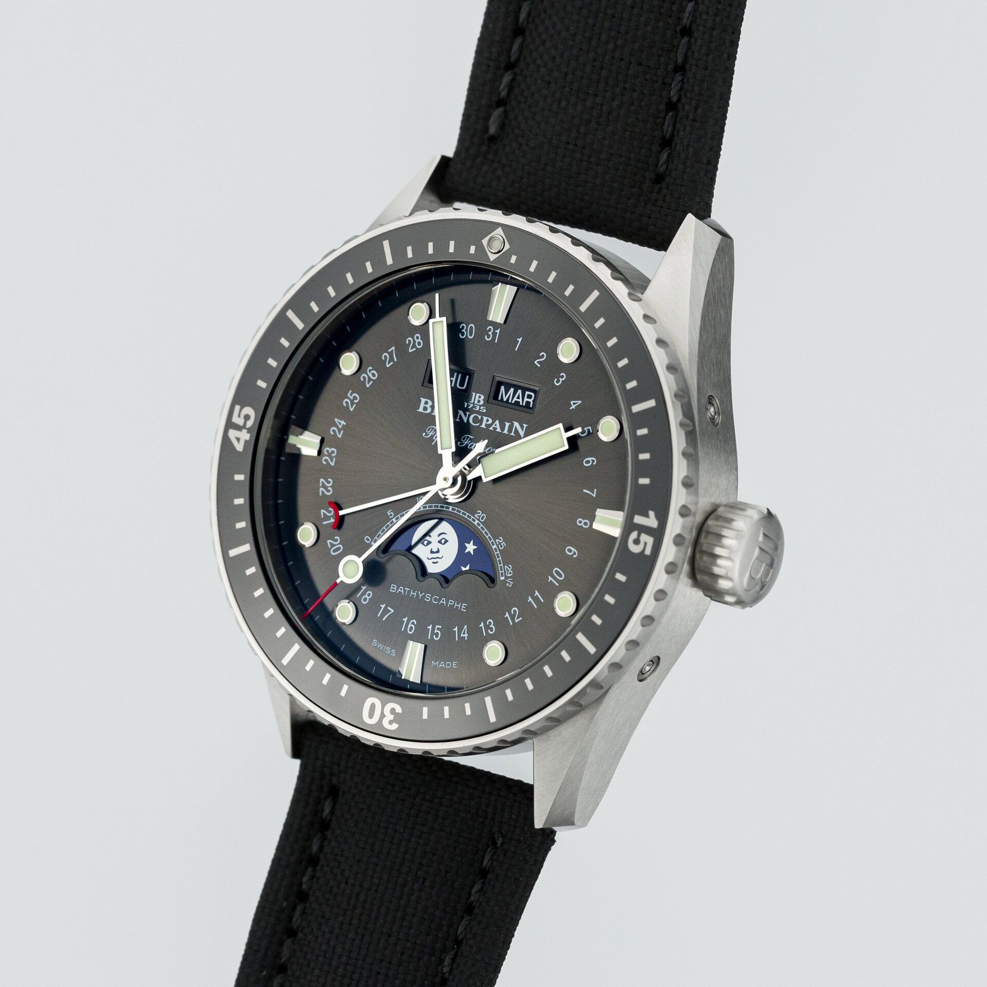 The presented model is part of the Bathyscaphe series – whose task is to satisfy the tastes of those Fifty Fathoms admirers who cannot fit the huge cases of the "original" FF with its impressive 45 mm on their wrist. The presented watch has a case size of 43 mm and despite the fact that the diameter is not much smaller than the FF, due to the case construction it looks and wears much more compact than it. Besides the size, the other significant difference is that the model offers not only the functions of an annual calendar, but also the moon phases. We have a fondness for watches with a moon phase, and this one offers this feature in combination with a full annual calendar, all in a model with water resistance up to 300 m – what better proposition could an active traveler ask for. The version with a dark grey dial (Blancpain calls it “Grey meteor”) and a bezel with a black ceramic insert was launched in 2018 and became highly sought-after by all fans of the brand. And the classic for the FF series “sail-canvas” strap with a standard buckle only enhances its presence. On the other hand are all the features that show this watch carries the DNA of a true Fifty Fathoms – water resistance of 300 m, the abundant SuperLumiNova on the indices, bezel, and hands – all of this confirms the timepiece's affiliation with the famous line of this respected manufacturer.