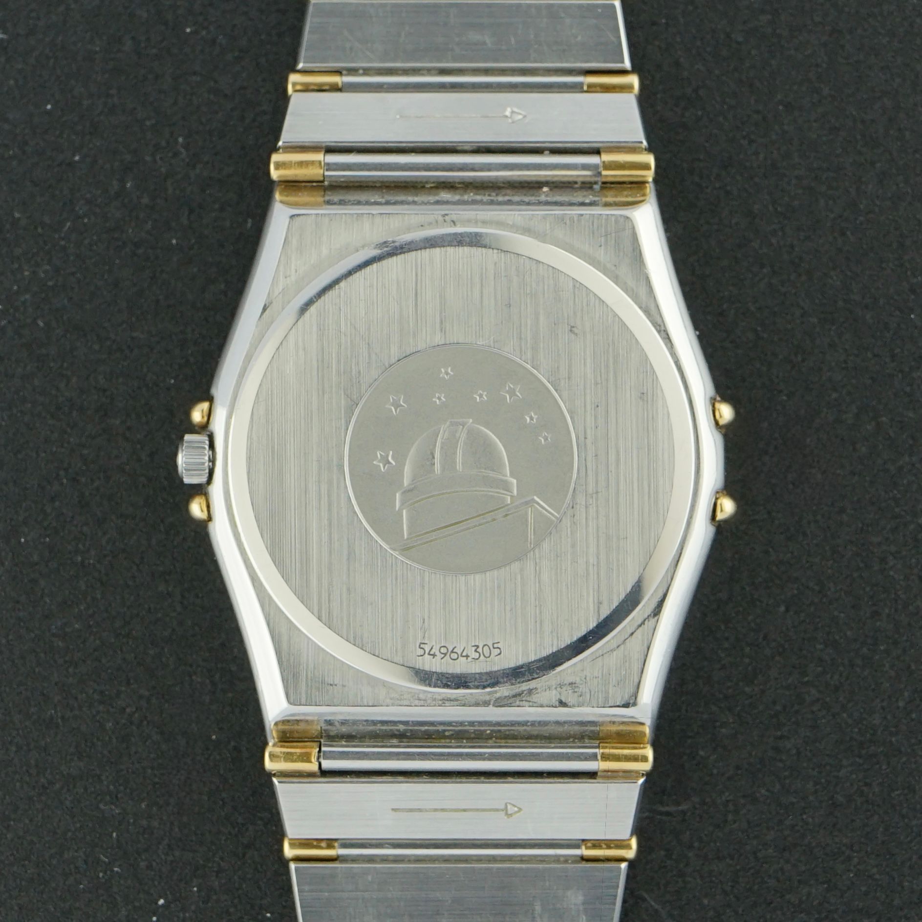 Vintage Omega Constellation from 1993, featuring a beautiful champagne-colored dial in impeccable condition. The watch has an 18-carat yellow gold bezel with black lacquer Roman numerals. The stainless steel case is complemented by partially golden-toned links. The bracelet is near full length, suitable for wrists from 14 up to 19.5 cm. Powered by a quartz caliber 1438 movement, overhauled in March 2026, running and functioning excellently. Overall condition is good, ideal as a daily wearer or dress watch.Year of production: 1993