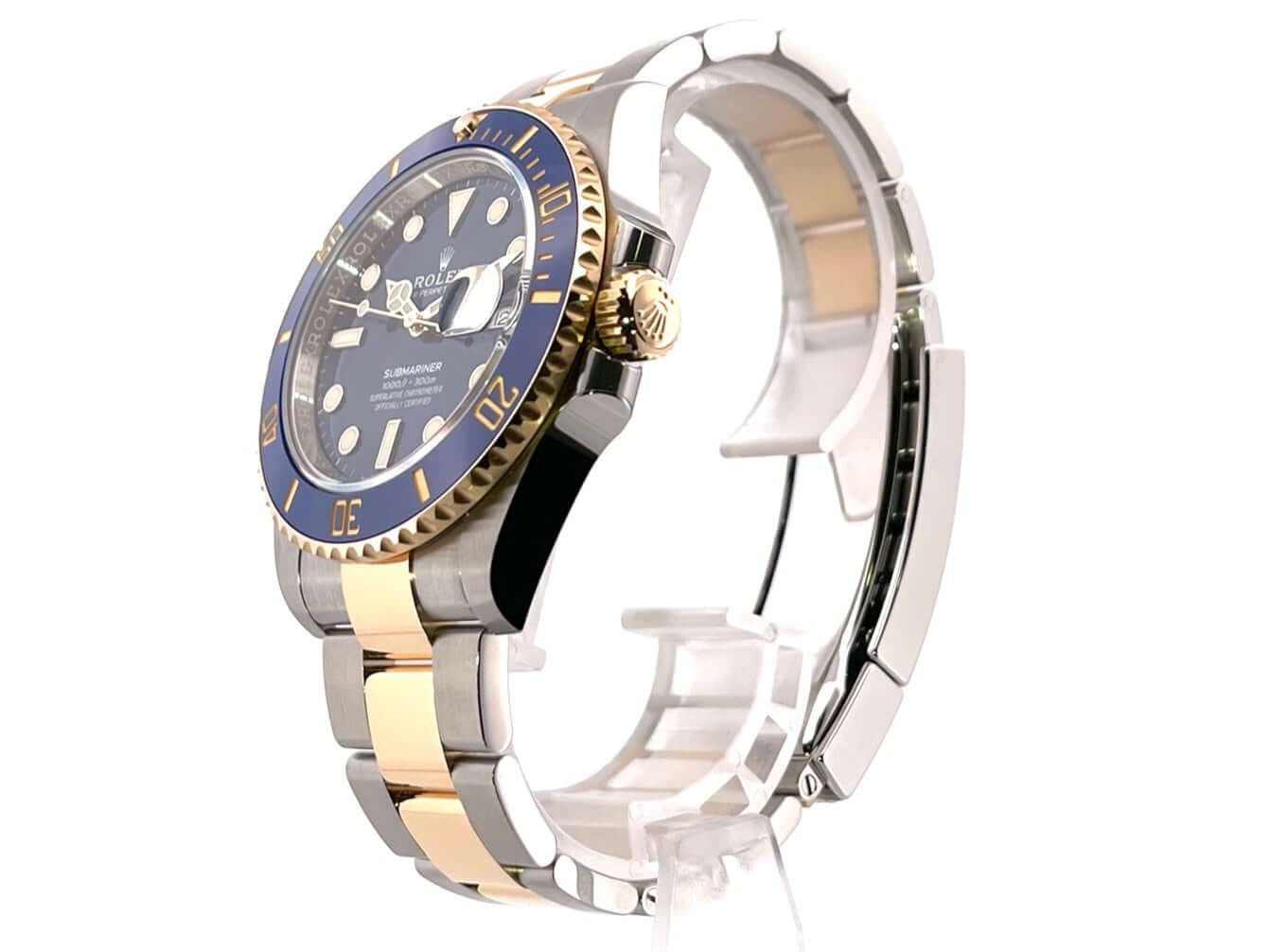 Rolex Submariner Date 41 stainless steel / yellow gold Ref. 126613LB Case made of polished and satined stainless steel, case diameter 41 mm, case height 12.5 mm, 18 carat yellow gold fluted bezel with blue ceramic inlay, 60 minute scale and rotating luminous dot, Oyster stainless steel / 18 carat yellow gold bracelet polished and satin finished with safety folding clasp, blue dial with applied luminous indices and luminous dots, luminous hands, automatic movement, Rolex 3235 caliber with 31 jewels, 28,800 A/h, 70 hour power reserve, date display with quick adjustment and magnifying glass, chronometer, sapphire crystal, screwed crown with side protection, screwed stainless steel base, water resistant up to 30 bar.