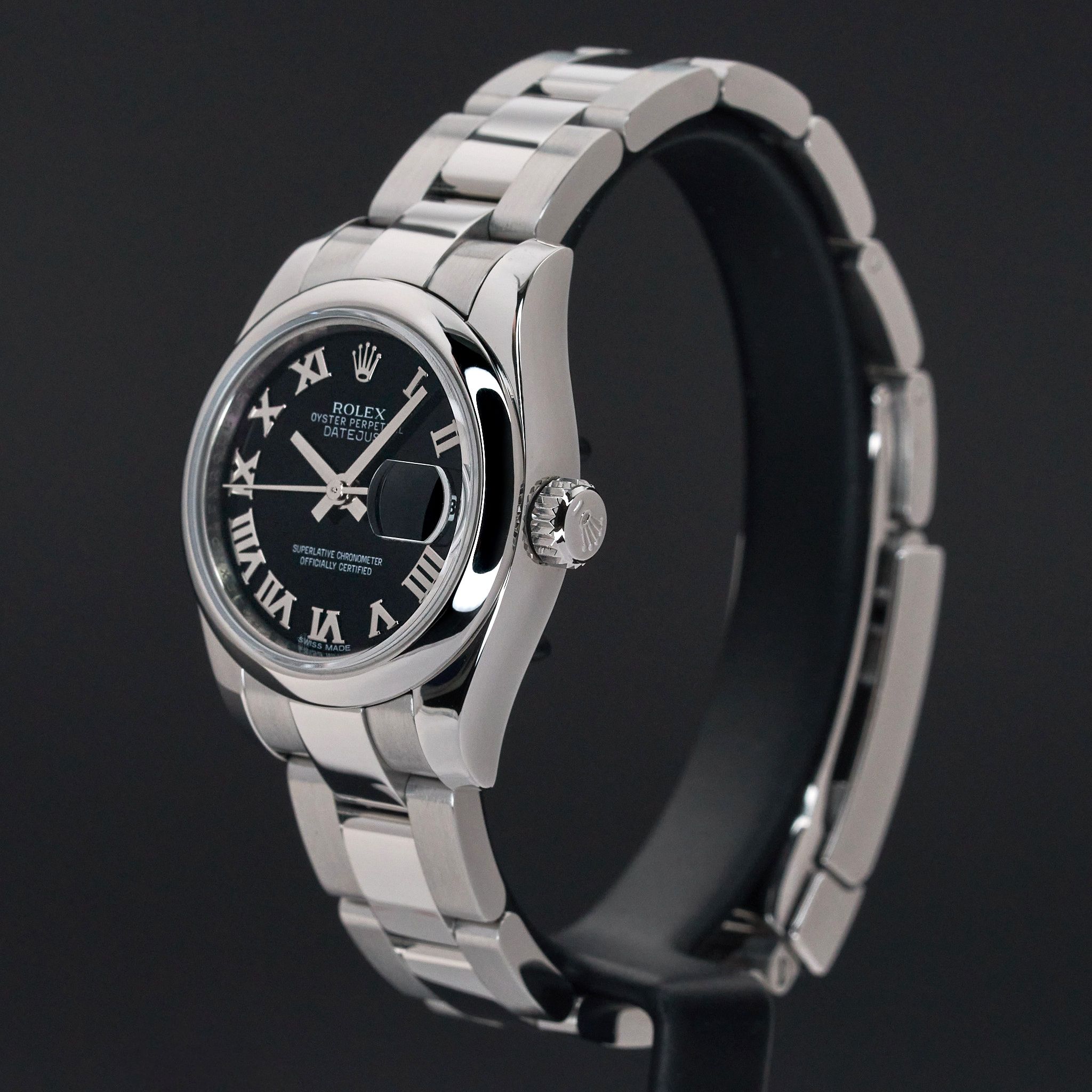 This Rolex Lady-Datejust 179160 features a Black Roman dial and is crafted from stainless steel, with a production year of 2010.