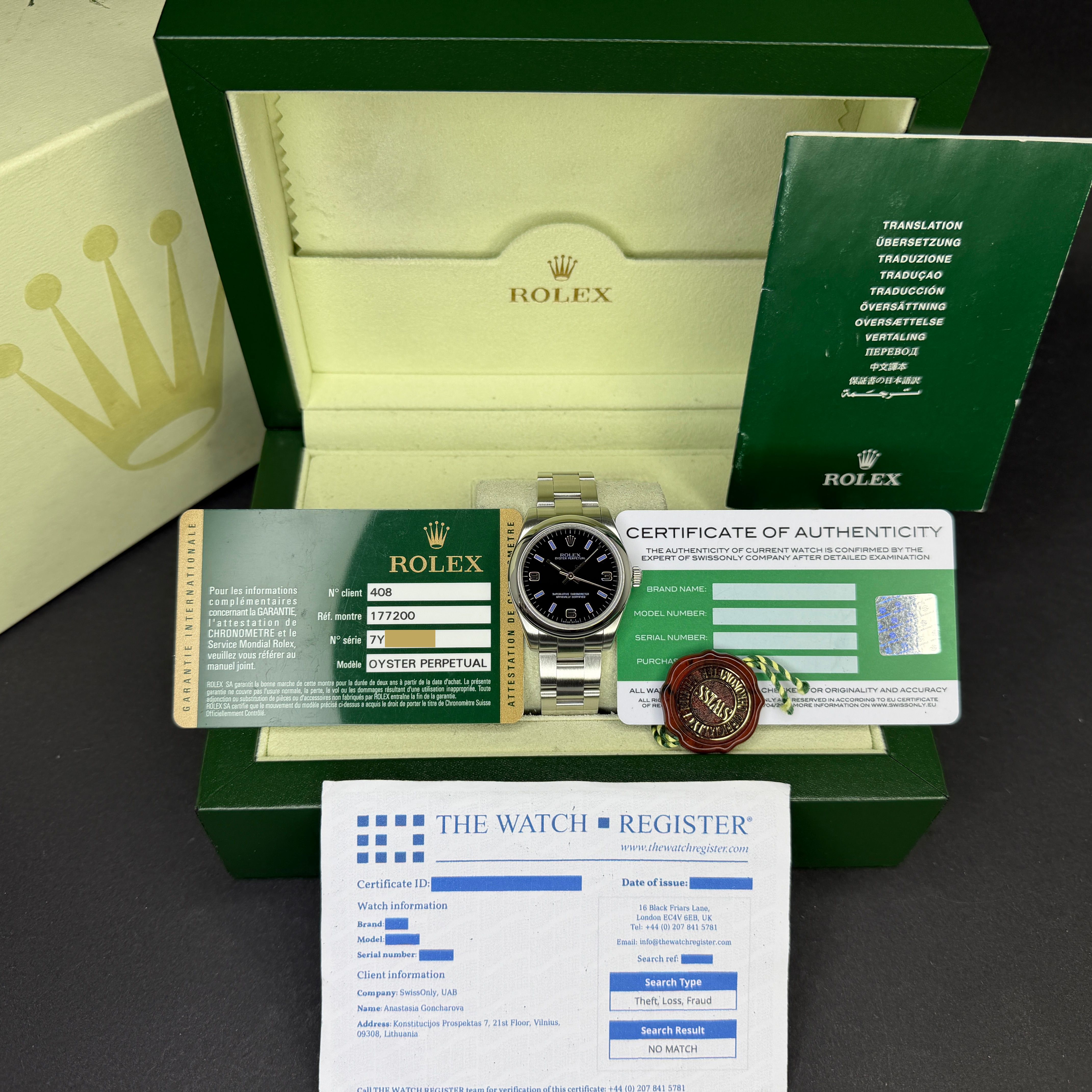 Rolex Oyster Perpetual, 177200, 31mm, 2010, Steel, Black Arabic dial, Fullset, 1y warranty