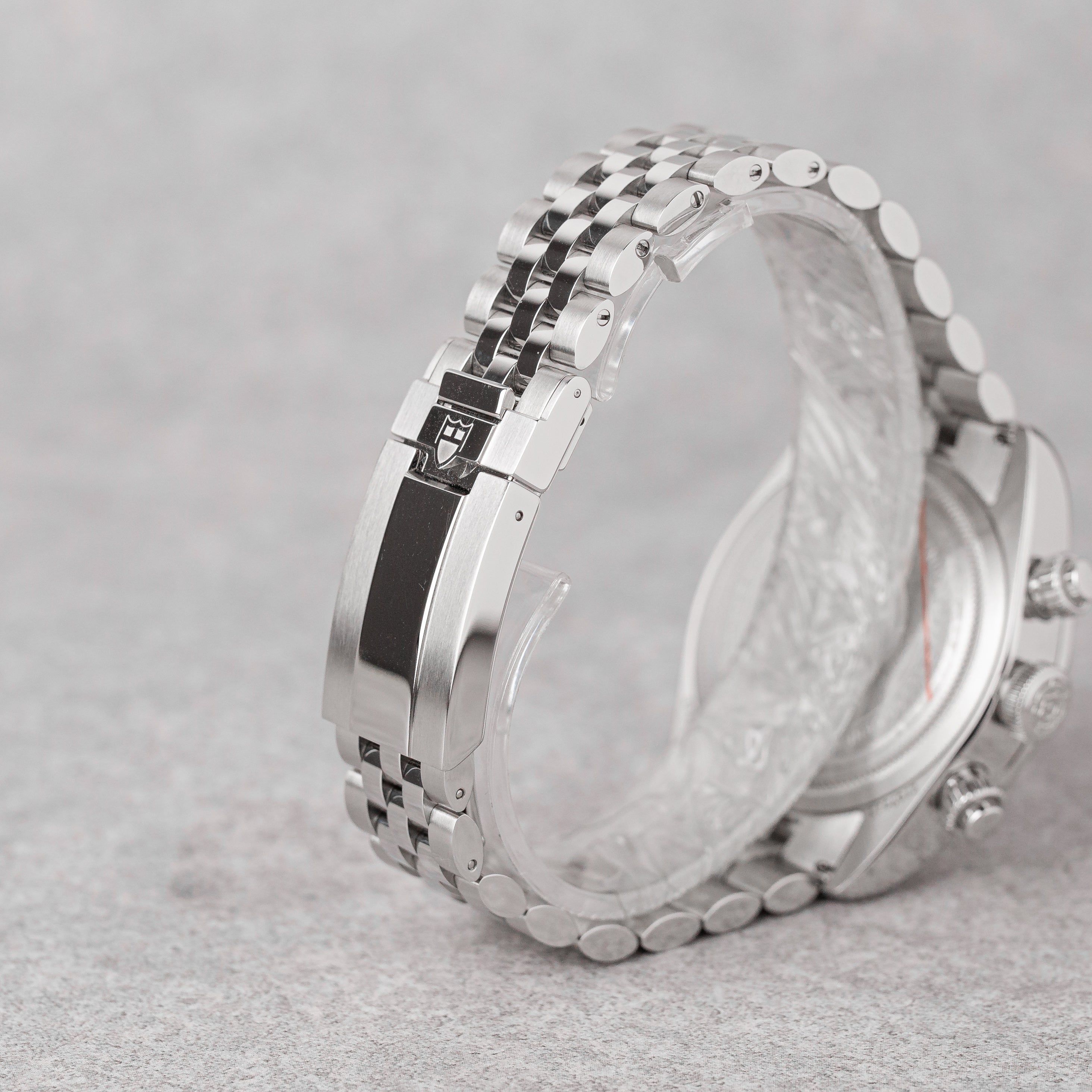 Questo cronografo come nuovo del 05/2025 viene fornito come Full Set e presenta un'elegante quadrante nero con il nuovo bracciale in stile Jubilee. Alimentato da un movimento automatico certificato COSC e supportato dalla garanzia internazionale Tudor di 5 anni, è un audace mix di fascino vintage e prestazioni moderne.