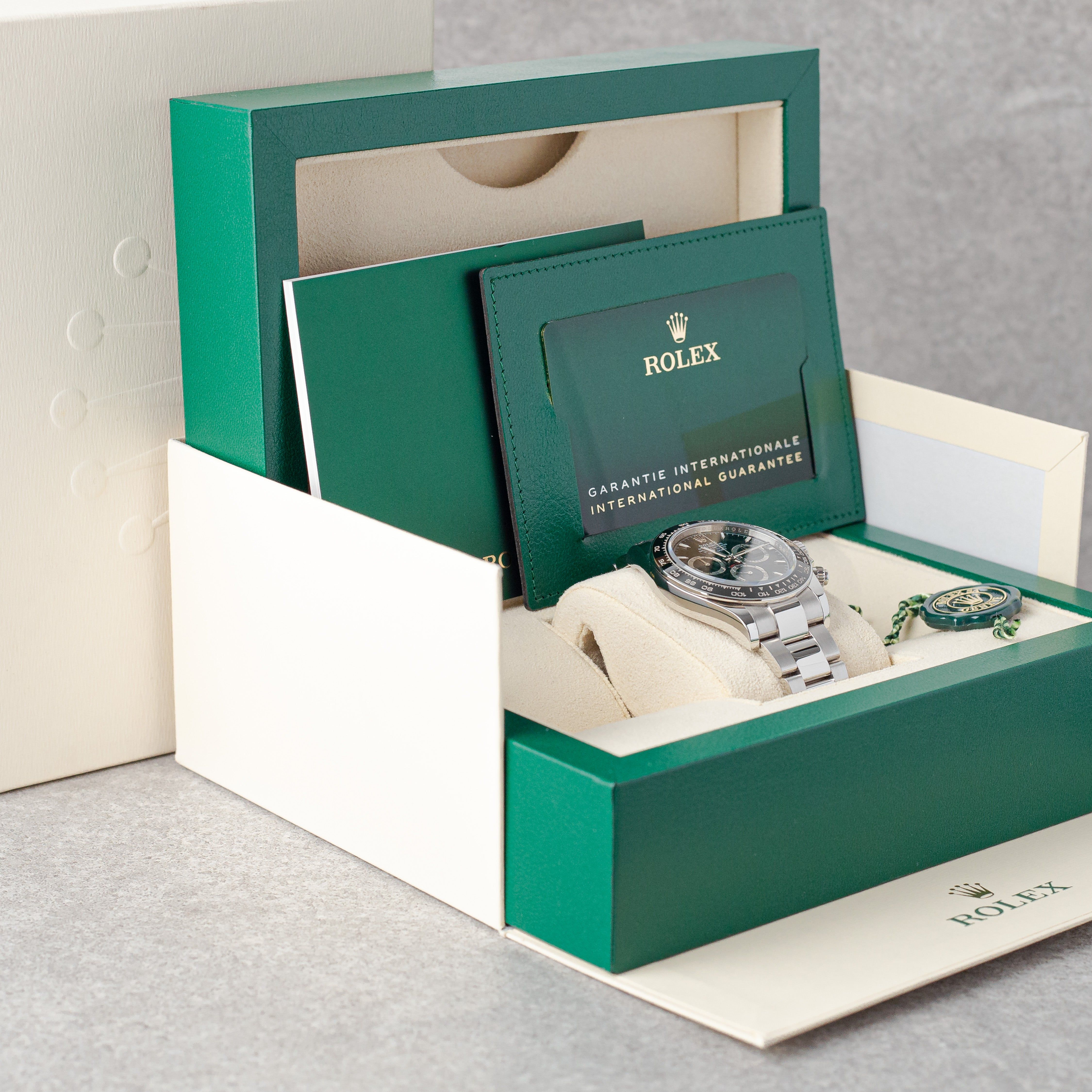 The latest evolution of an icon, this Rolex Daytona 126500LN features the classic black dial with refined updates to the case and movement. Presented in very good condition, it comes as a Full Set and is covered by the Rolex international warranty until 12/2028. A highly sought-after modern Daytona, combining cutting-edge performance with timeless racing heritage.