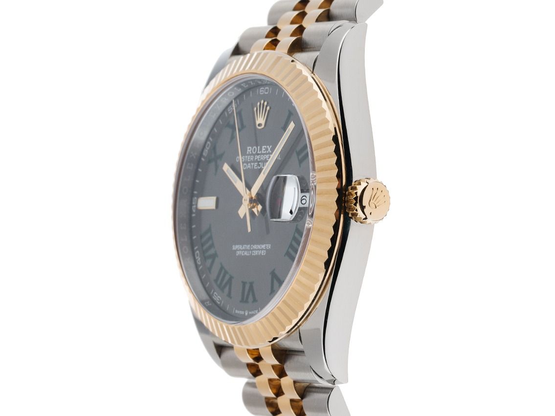 Rolex Datejust Wimbledon Stahl 18kt Gelbgold Automatik Armband JubiléGehäuse Edelstahl poliert und satiniert, Gehäusedurchmesser ohne Krone 41mm, Gehäusehöhe 11,8mm. Lünette 18kt Gelbgold geriffelt. Armband Jubilé Edelstahl / 18kt Gelbgold poliert und satiniert, Faltschließe Edelstahl / 18kt Gelbgold mit Hersteller-Logo. Zifferblatt schiefergrau mit aufgesetztem gelbgoldenen Leuchtindex, dunkelgrünen römischen Ziffern und gelbgoldenen Leuchtzeigern. Uhrwerk Automatik, Chronometer mit Zeugnis, Rolex Manufakturkaliber 3235 mit 31 Edelsteinen, Gangreserve ca. 70 Stunden. Anzeige von Stunde, Minute und Sekunde über Zeiger aus der Mitte mit Sekundenstopp zur sekundengenauen Einstellung der Uhrzeit. Datumsanzeige mit Schnellverstellung unter Glaslupe bei 3 Uhr. Saphirglas kratzfest. Krone verschraubbar mit Hersteller-Logo. Boden Edelstahl verschraubt. Gewicht der Uhr inklusive Armband 149g, Länge des Armbandes inklusive Gehäuse 175mm. Wasserdicht bis 10 ATM. Referenznummer: 126333, Gehäusenummer: G9979XXX, ID: P2780260000326HW-16800/16700, Artikelnummer: 10000085342. Mit Gangkontrolle und kompletter äußerlicher Aufarbeitung von März 2026. Original Rolex Box mit Umkarton und Garantie Papiere von Juli 2023, neue Rolex Garantie Karte ohne Ländercode sowie Beschreibung, Ledermäppchen, Tag, Lünettenschutz, Rolex Chronometer-Siegel und Watchregister Auszug von März 2026, The Watch Register Zertifikat / ohne Eintrag (Internationale Datenbank für verlorene oder gestohlene Uhren), Full Set. Superschnäppchen, Kapitalanlage mit Wertsteigerungspotential, aus erster Hand. Wie Neu. Lieferzeit sofort.