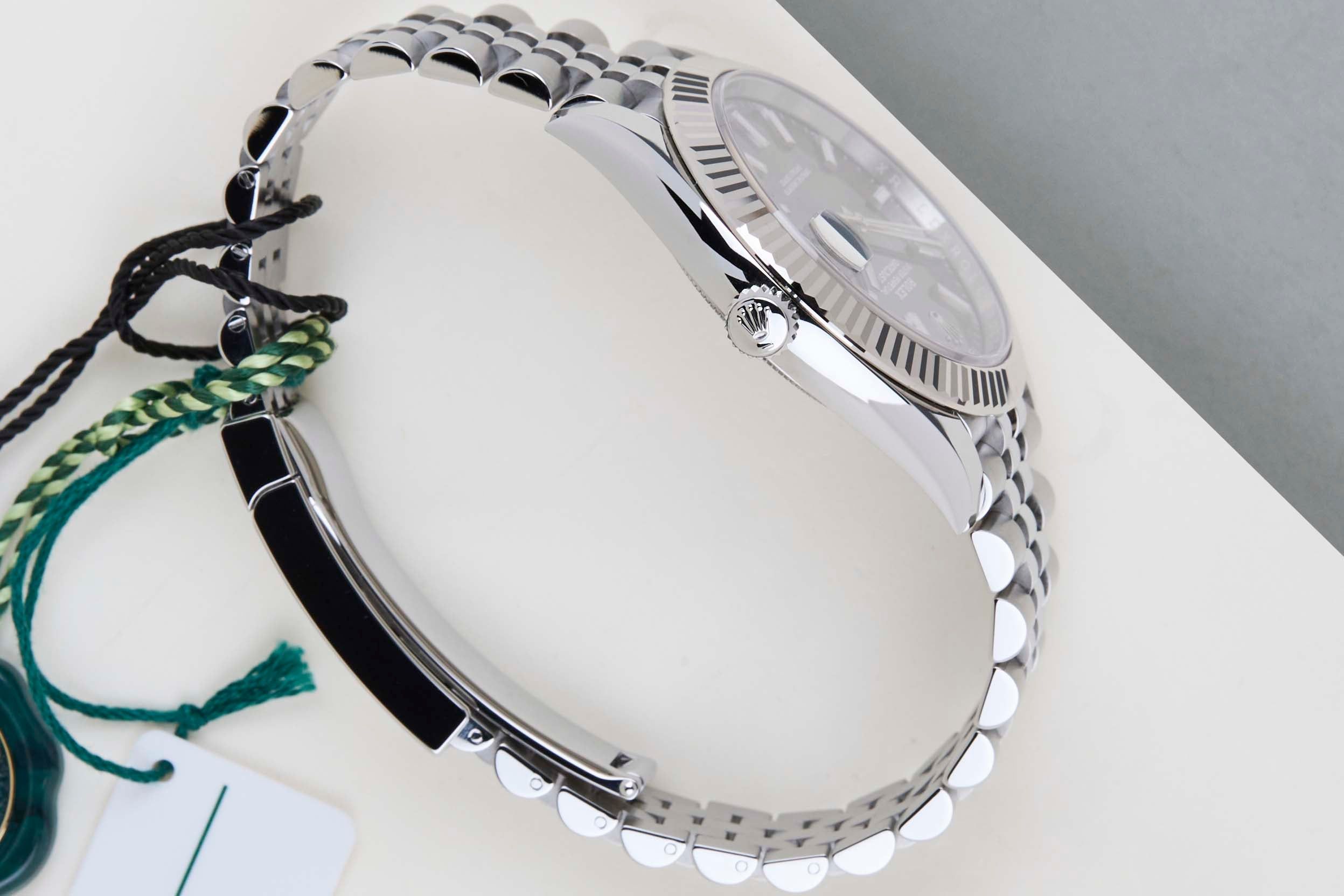 Full Set | Including Rolex White Tag | International Rolex Warranty Until June 2027 Rolex introduced the original Datejust in 1945 to celebrate the company's 40th anniversary. Due to the various case sizes and materials, the Datejust has been ingrained in Rolex's history and remains incredibly popular for 75 years.This Rolex Datejust 41 'Slate Dial - Jubilee' was sold for the first time in June 2022.This Datejust is made of a combination of 18k White Gold and stainless steel and is fitted with a Jubilee bracelet, which is equipped with the Easylink. This extension, allows the wearer to either extend or shorten the bracelet by 5 millimeters, improving the wearability and usability of the watch.This Rolex Datejust 41 is in Mint condition and comes with the original Rolex Warranty Card and box. Furthermore, the watch still has Worldwide Rolex Warranty until June 2027.