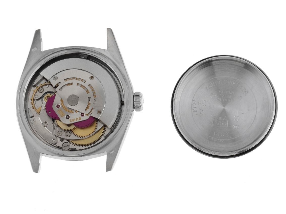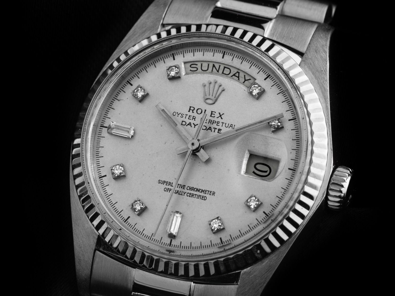 Cassa in oro bianco 18kt lucido e satinato, diametro della cassa senza corona 36mm, altezza della cassa 13mm, lunetta in oro bianco 18kt zigrinata e lucida. Bracciale Presidente in oro bianco 18kt lucido e satinato, chiusura pieghevole Rolex in oro bianco 18kt con logo del produttore. Quadrante argentato con indici in diamante incastonati in oro bianco e lancette in oro bianco, oltre a minuteria a vista. Movimento automatico, cronometro, calibro di manifattura Rolex 1556 con 25 pietre preziose. Indicazione di ore, minuti e secondi tramite lancette centrali, indicazione del giorno della settimana in inglese a ore 12, indicazione della data sotto lente a ore 3, open 6/9 (6 e 9 aperti nell'indicazione della data). Plexiglass. Corona a vite con logo del produttore. Fondello in oro bianco 18kt avvitato. Peso dell'orologio incluso il bracciale 123g. Lunghezza del bracciale incluso la cassa 175mm. Numero di riferimento 1803, numero di cassa: 5216XXX, ID: KA1829330000326H-28500, anno di costruzione 1977, numero articolo: 10000085362. Con controllo del movimento e completa revisione esterna di marzo 2026. Scatola originale Rolex con scatola esterna e astuccio in pelle, oltre a libretto di traduzione, sigillo Rolex Chronometer, giorno, fazzoletto, taccuino Rolex in copertura di pelle e estratto dal Watch Register di marzo 2026, certificato The Watch Register / senza registrazione (database internazionale per orologi smarriti o rubati). Super affare, investimento con potenziale di apprezzamento, pezzo da collezione estremamente raro, quasi mai indossato. Ottime condizioni. Tempi di consegna immediati.
